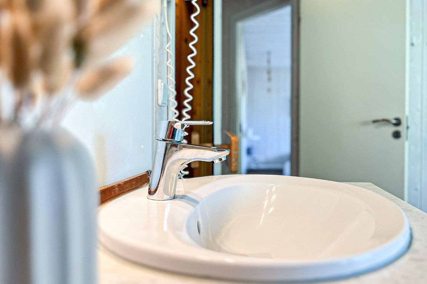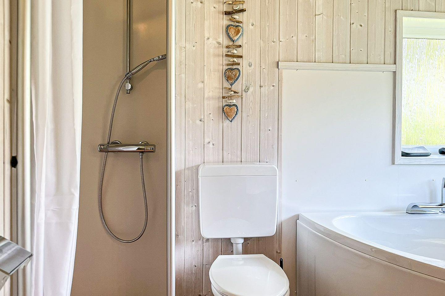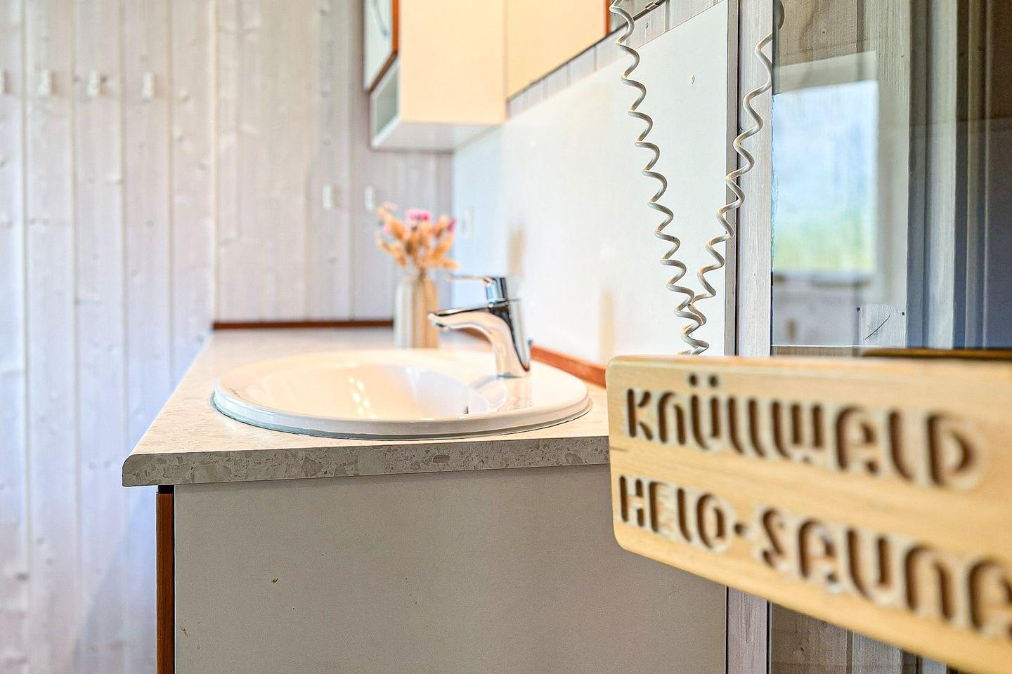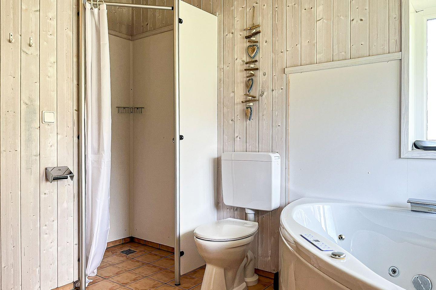 Das Badezimmer bietet eine Sauna, einen Whirlpool (für bis zu 2 Personen), eine bodengleiche Dusche, ein WC und ein Waschbecken.