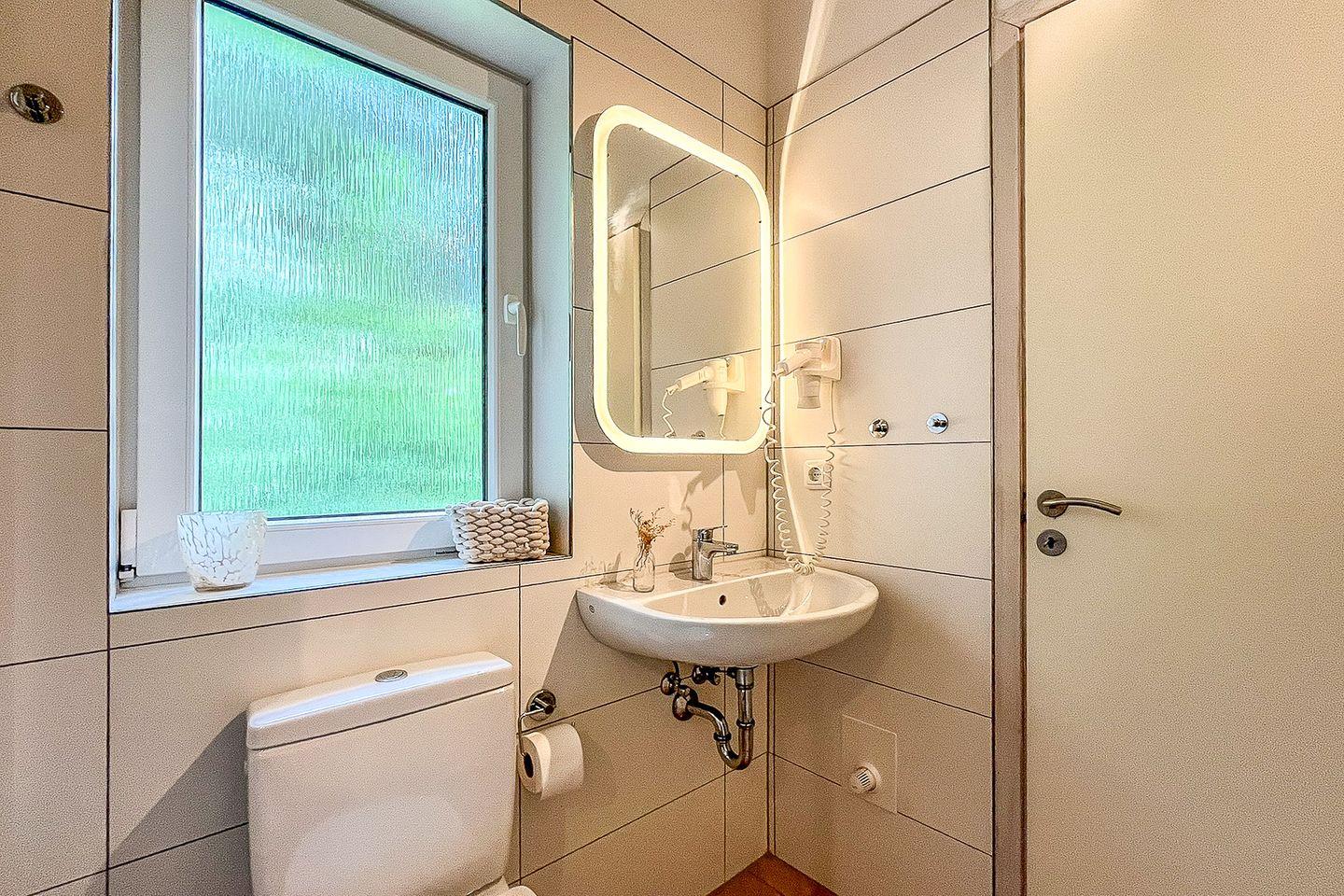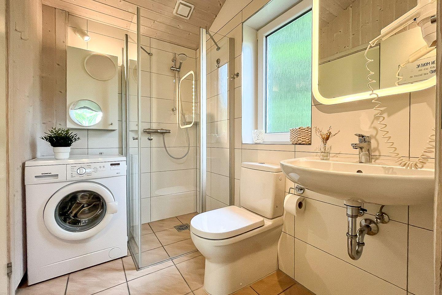 Das Bad ist mit einer bodengleichen Dusche, Waschbecken und WC ausgestattet. Zusätzlich steht hier die Waschmaschine. Ein Haartrockner rundet die Ausstattung ab.