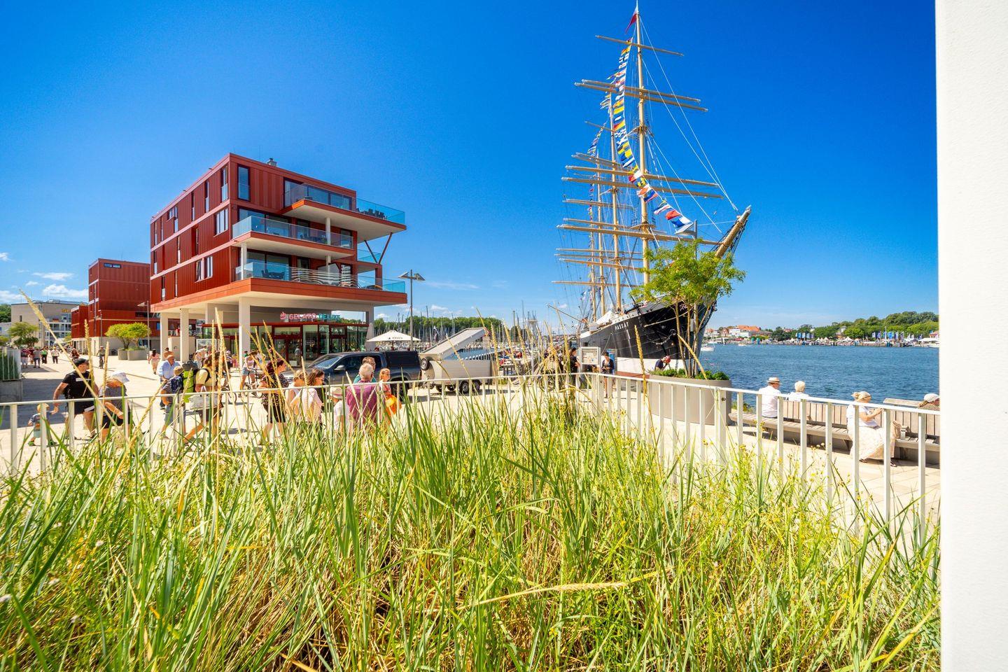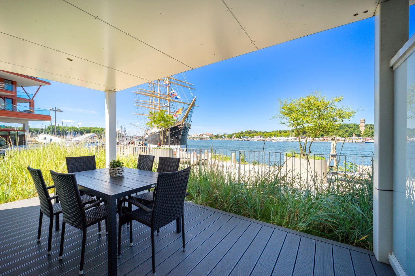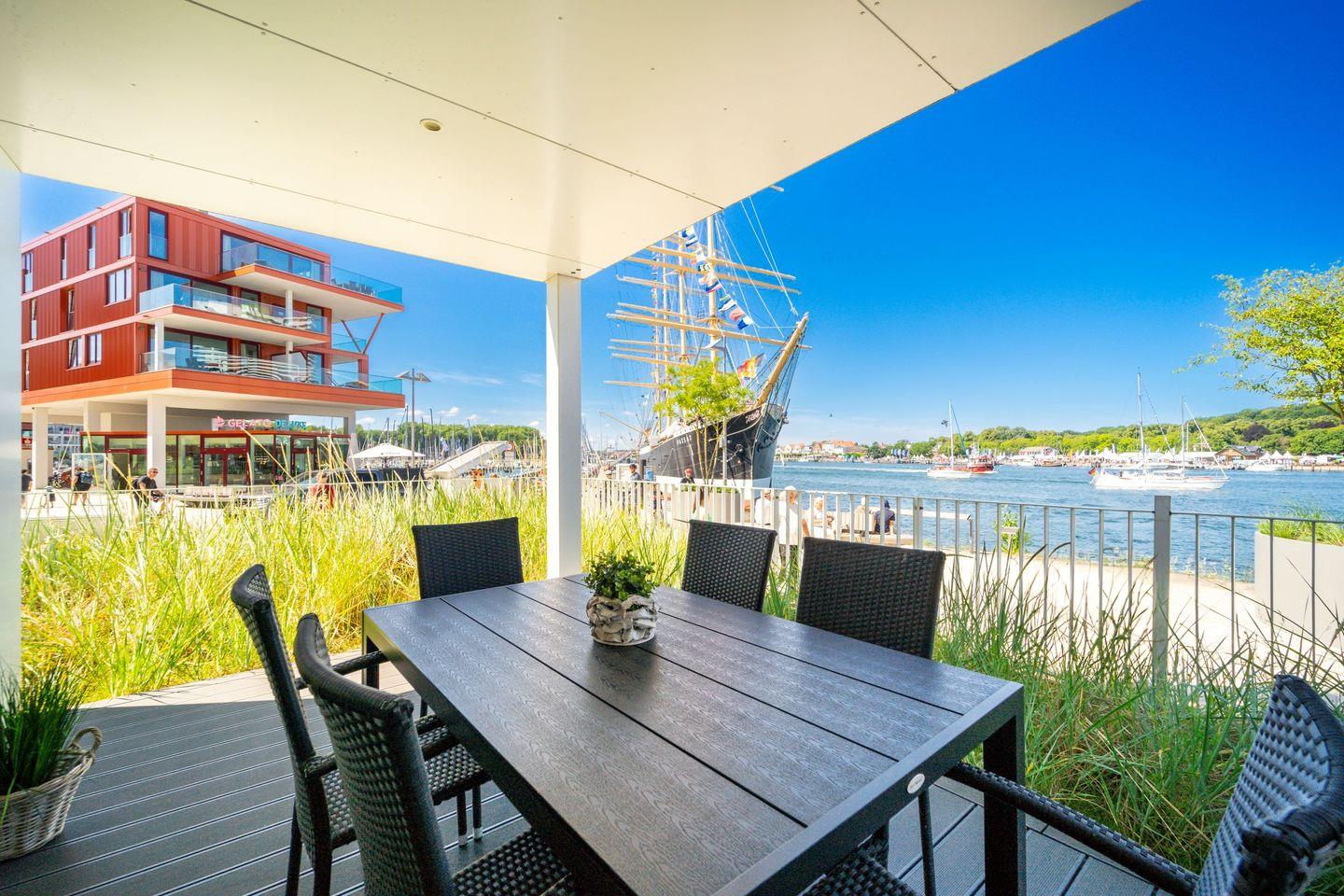 Auf rund 82 m² im Hochparterre erwartet Dich ein großzügiges Zuhause mit Wohn-Essbereich, offener Küche, zwei separaten Schlafzimmern, einem luxuriösen Badezimmer und einer überdachten Terrasse mit traumhaften Blick über den Segelhafen, die Travemündung und die Ostsee – inklusive dem Museumsschiff „Passat“ und den vorbeiziehenden Skandinavienfähren.