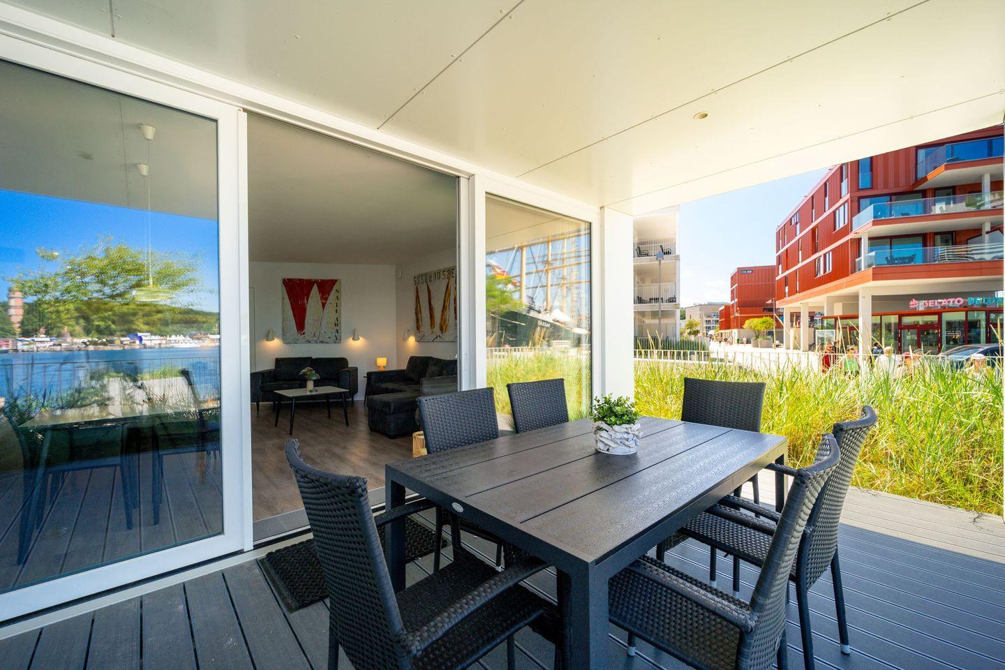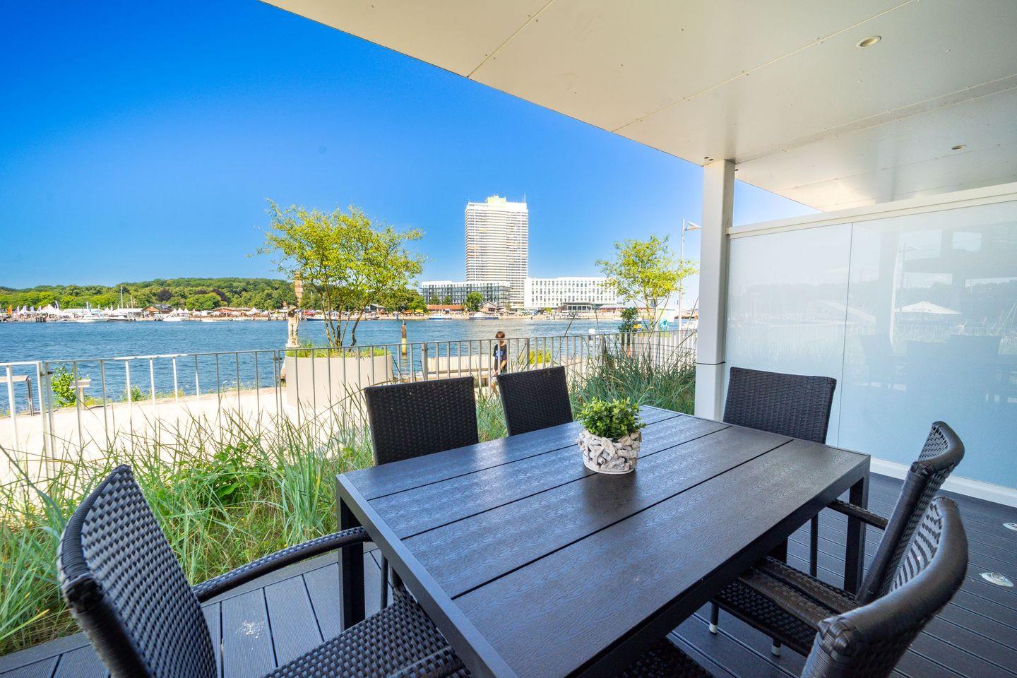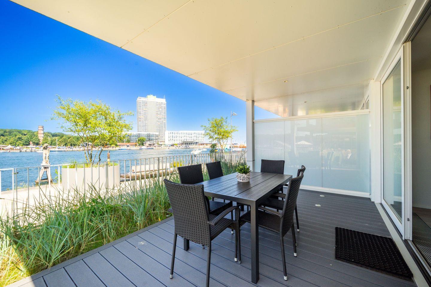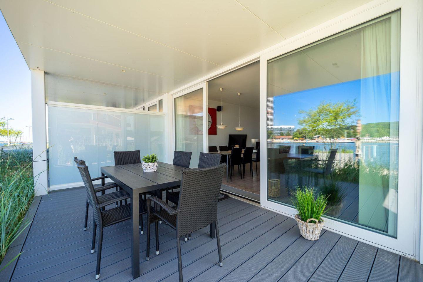 Die große, überdachte Terrasse mit Gartenmöbeln rundet das Urlaubsgefühl ab. Von hier genießt Du den Panoramablick über das Wasser und kannst schon beim Frühstück die frische Meeresluft erleben.