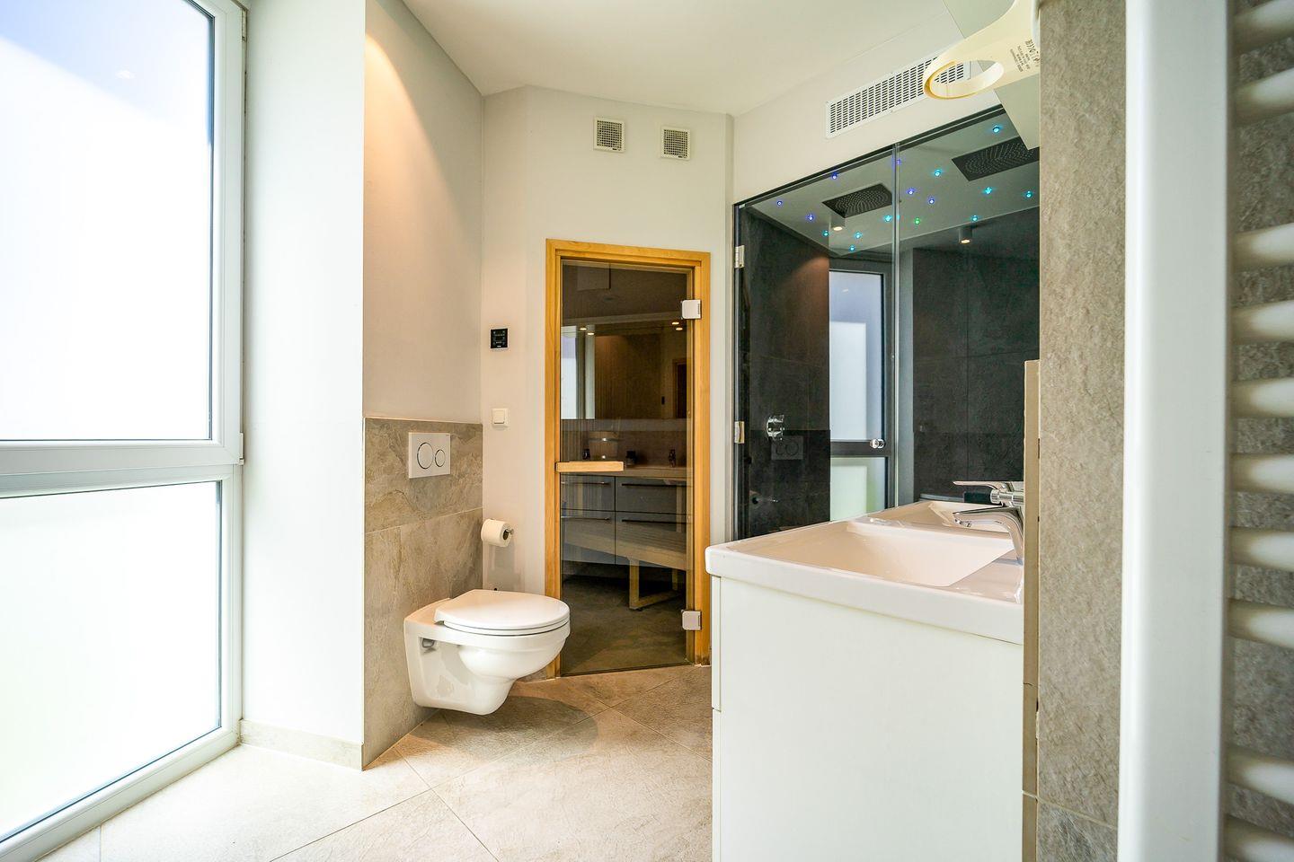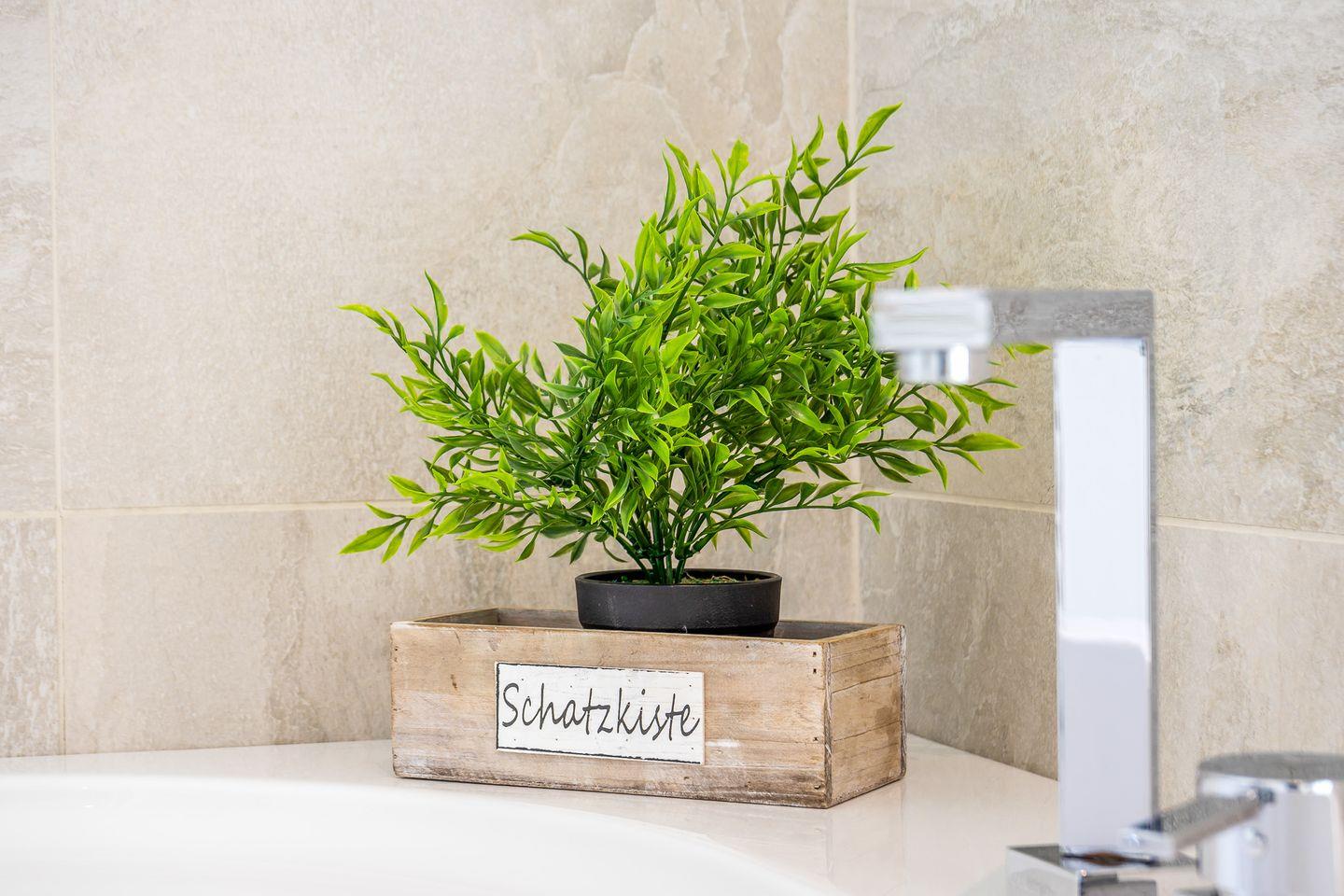 Ein echtes Highlight ist das Badezimmer: Hier hast Du Deine eigene kleine Wellnessoase mit moderner Badewanne mit wohltuender Whirlpool-Funktion, Sauna und einem Dampfbad mit integrierter Doppelregendusche. Perfekt, um nach einem Strandtag zu entspannen.