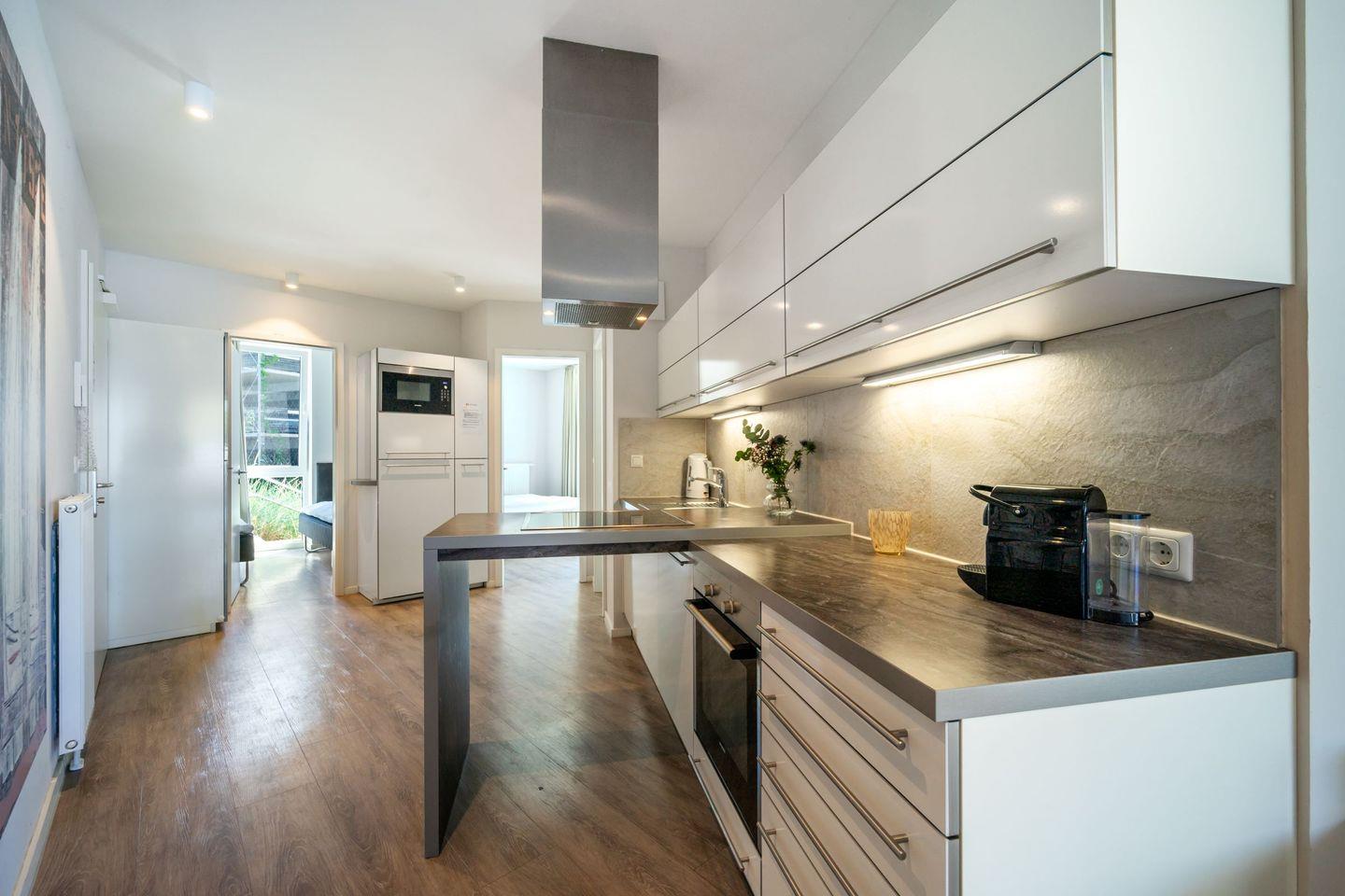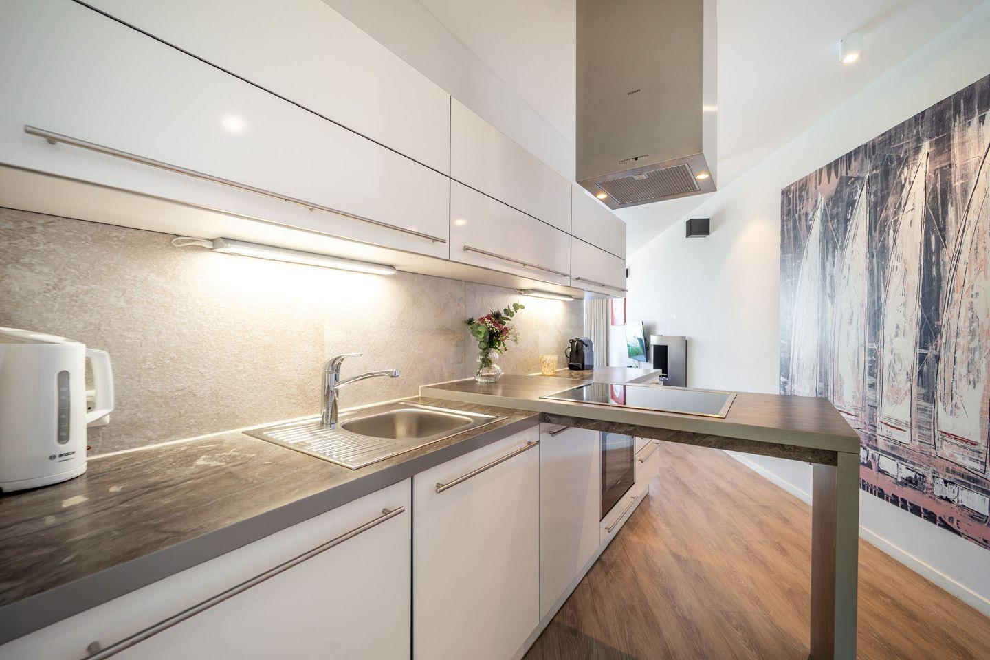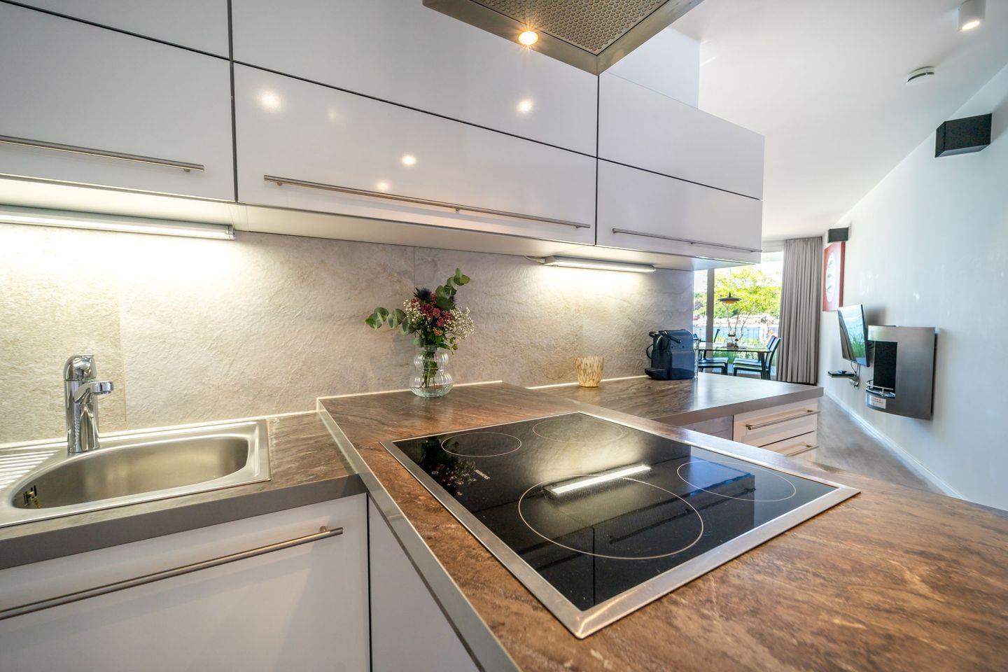 Die offene Küche ist hochwertig ausgestattet mit 4-Platten-Ceranherd, zusätzlichem Wok-Kochfeld, Backofen, Kühlschrank mit Gefrierfach, Geschirrspüler, Mikrowelle, Toaster, Wasserkocher, Kaffeemaschine und Nespresso-Maschine. Geschirr, Besteck und alle wichtigen Kochutensilien sind selbstverständlich vorhanden, sodass Du Dich wie zuhause versorgen kannst.