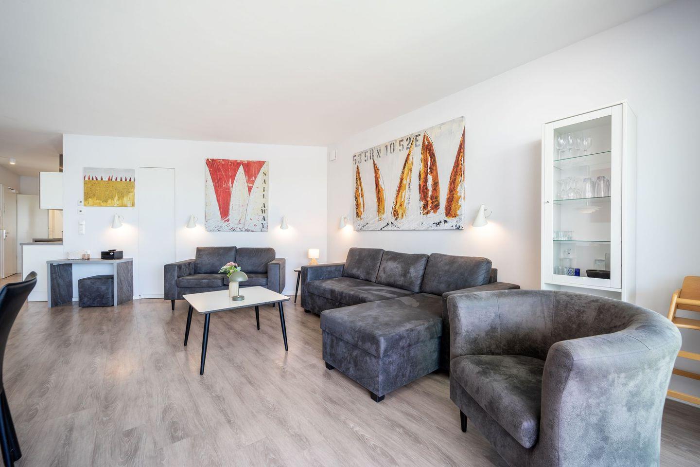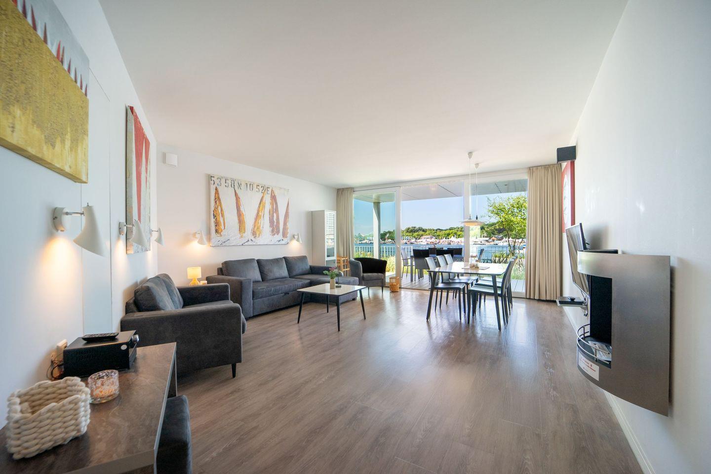 Der lichtdurchflutete Wohnbereich lädt mit Sofa, Sesseln, Flachbild-TV, HiFi-Anlage und einem stimmungsvollen Bioethanolkamin zum Entspannen ein. Durch die großen Panoramafenster und direkt von der Couch aus hast Du einen außergewöhnlich schönen Meerblick.