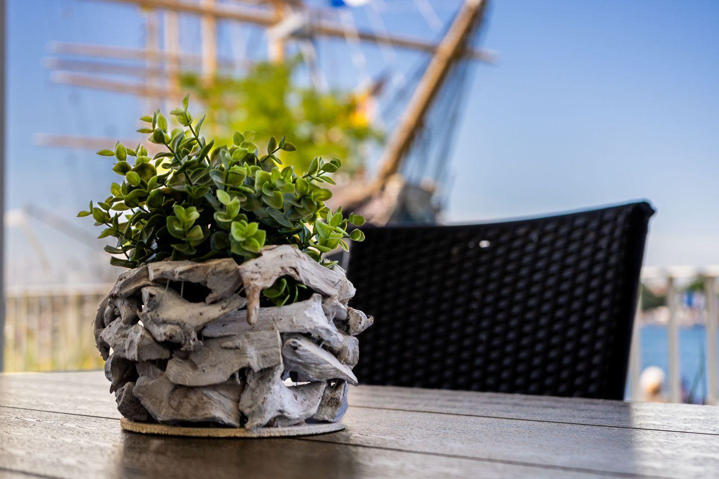 Die Ferienwohnung Nr. 01 in der Promenadenvilla 3 auf dem Priwall-Travemünde ist eine 3-Zimmer-Wohnung im Hochparterre für bis zu 6 Personen. Sie verfügt über ein Wohnzimmer mit offener Küche, zwei Schlafzimmer, ein luxuriöses Bad mit Sauna, Whirlpool und Dampfdusche sowie eine überdachte Terrasse mit Panoramablick auf Hafen und Ostsee.