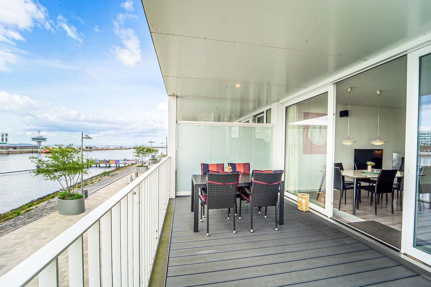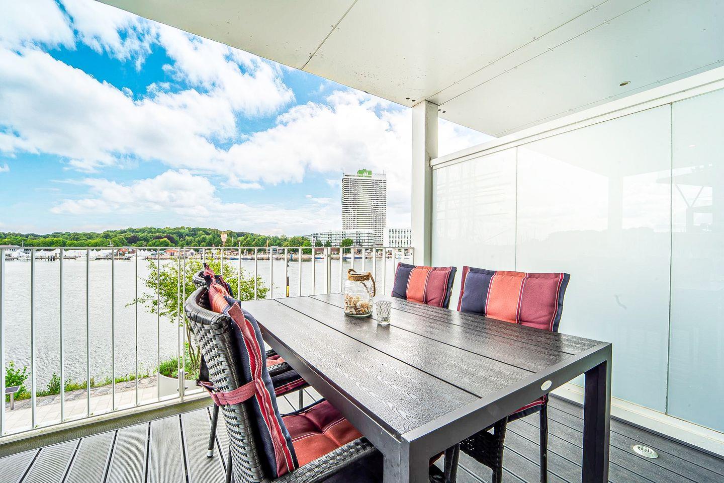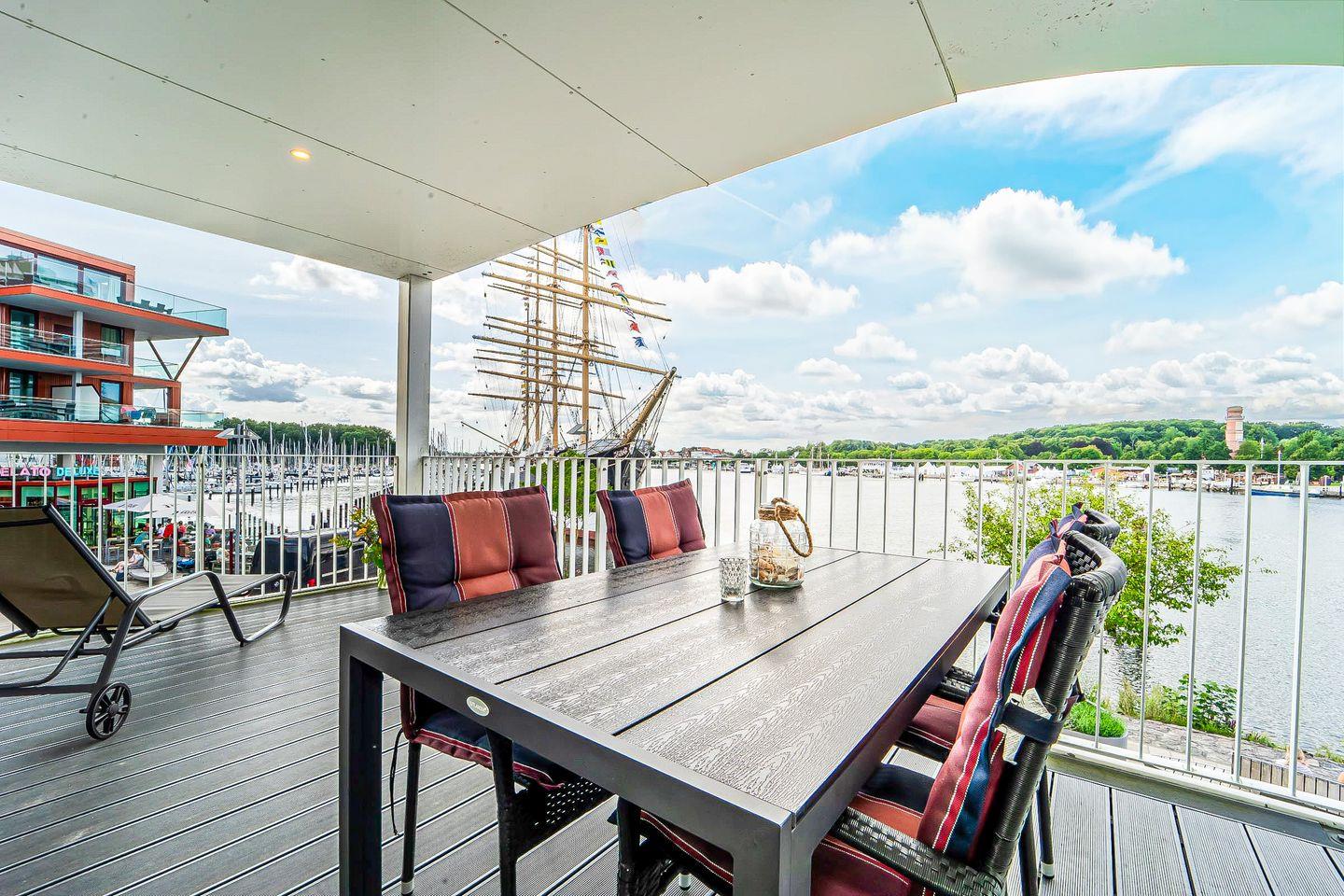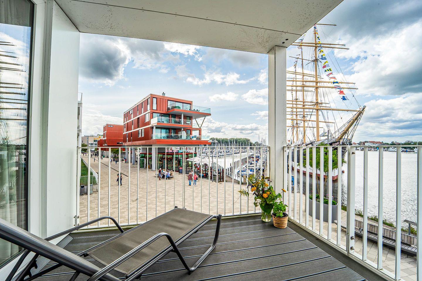 Auf dem großzügigen, überdachten Balkon mit Gartenmöbeln und Sonnenliegen kannst Du die frische Meeresluft genießen und den einzigartigen Panoramablick auf die Ostsee zu jeder Tageszeit erleben.