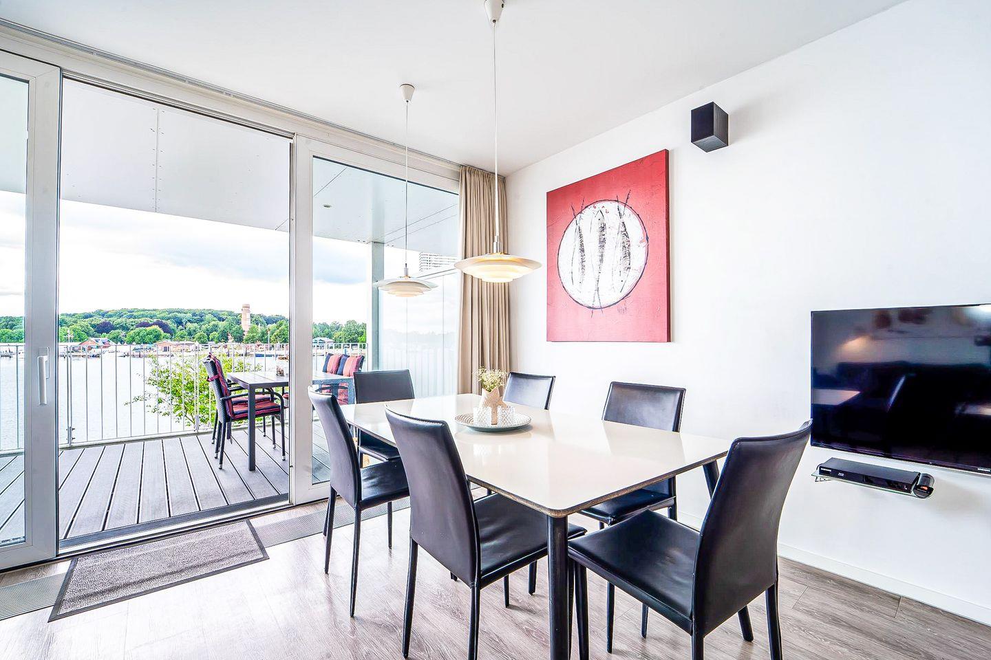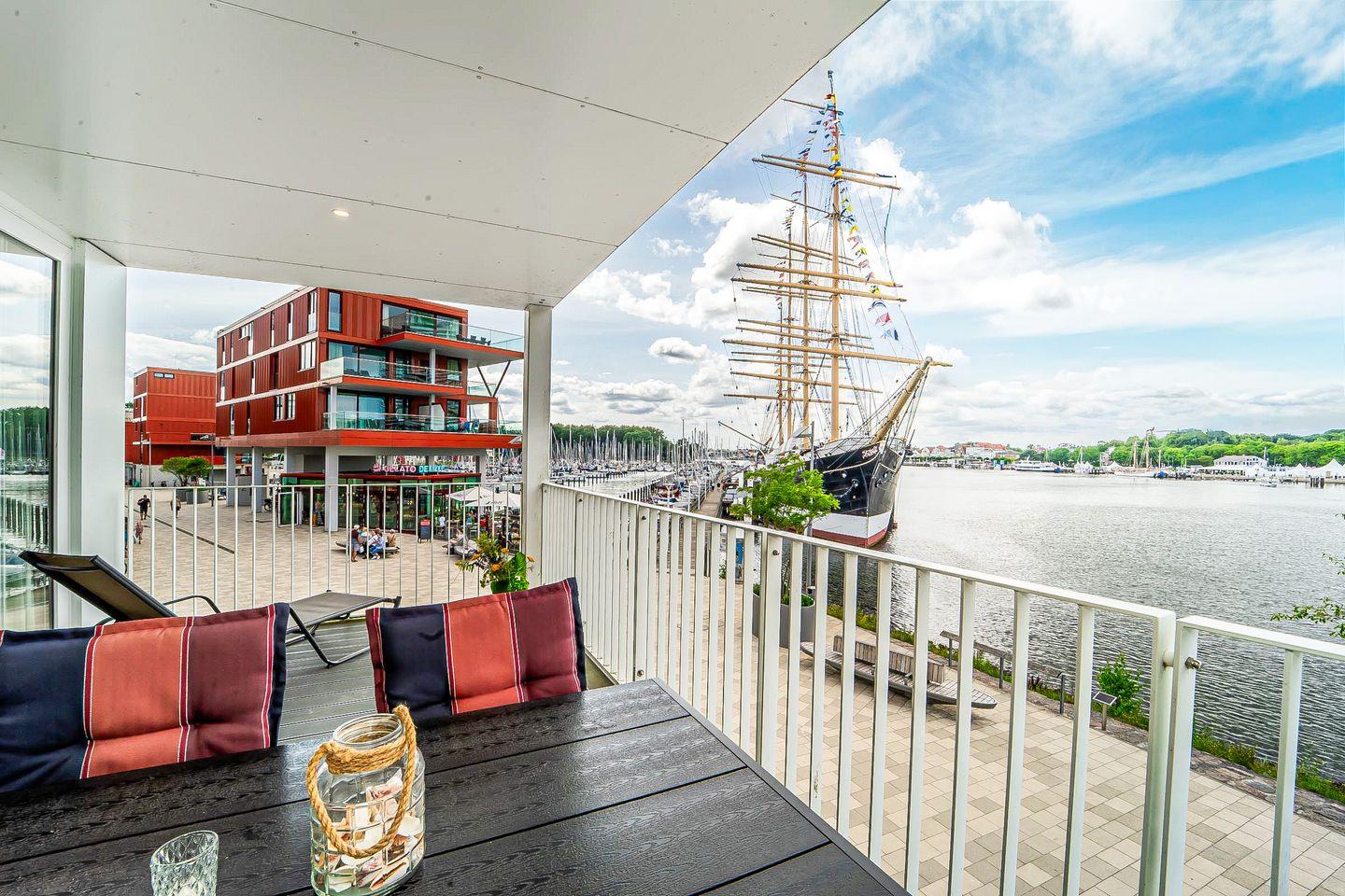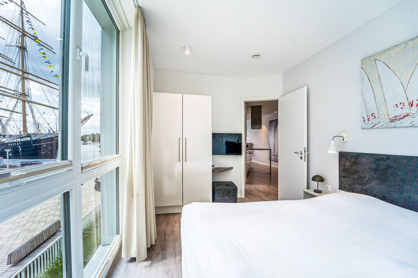 Der lichtdurchflutete Wohnbereich ist mit Sofa, Sesseln, HiFi-Anlage, zwei Flachbild-TVs und einem Schreibtisch ausgestattet. Für gemütliche Stunden sorgt der Bioethanolkamin, der eine besonders behagliche Atmosphäre schafft. Durch die großen Panoramafenster genießt Du von hier aus den eindrucksvollen Ausblick auf den Segelhafen, die Travemündung, das Museumsschiff „Passat“ und die vorbeiziehenden Skandinavienfähren.