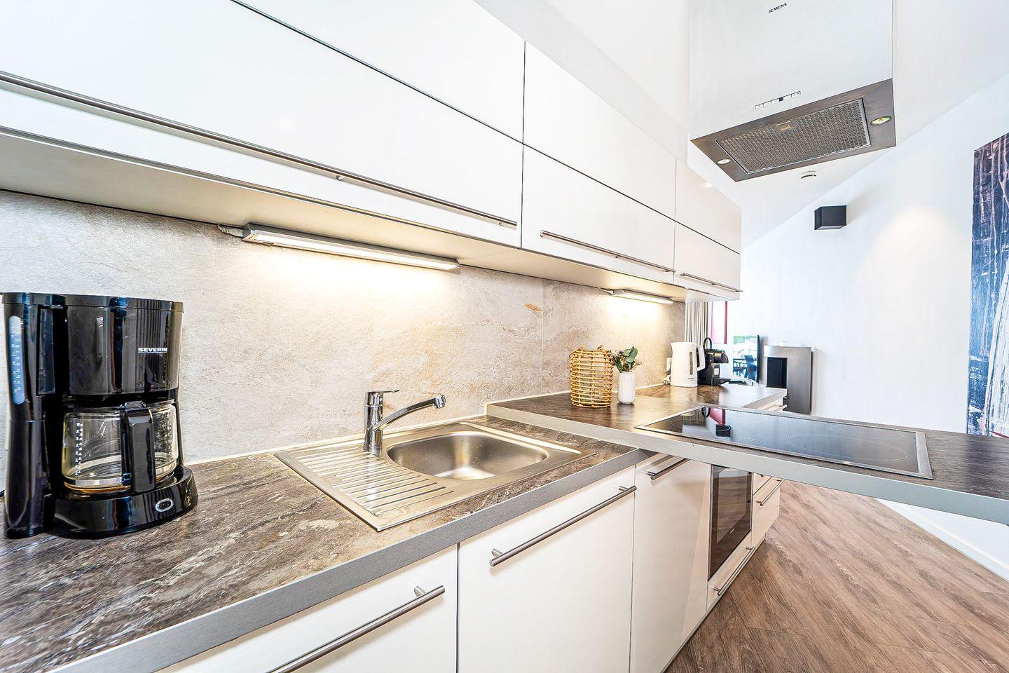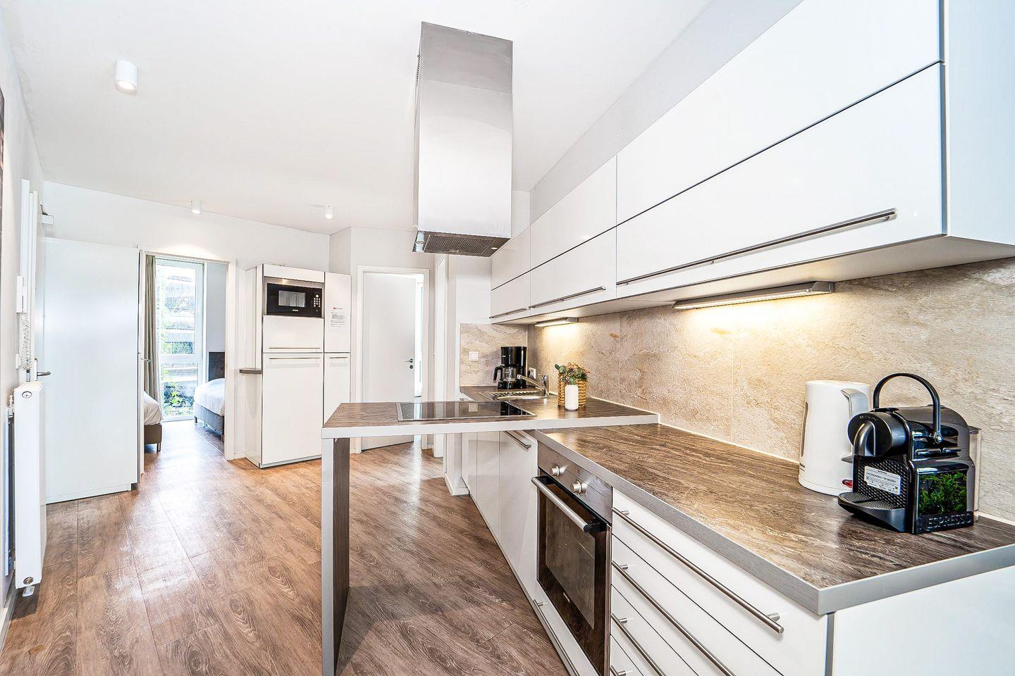 Die offene Küche bietet alles, was Du zum Kochen brauchst: 4-Platten-Herd, zusätzliches Wok-Kochfeld, Backofen, Kühlschrank mit Gefrierfach, Geschirrspüler, Mikrowelle, Toaster, Wasserkocher, Kaffeemaschine und Nespresso-Maschine. Geschirr, Besteck und Kochutensilien sind selbstverständlich vorhanden.