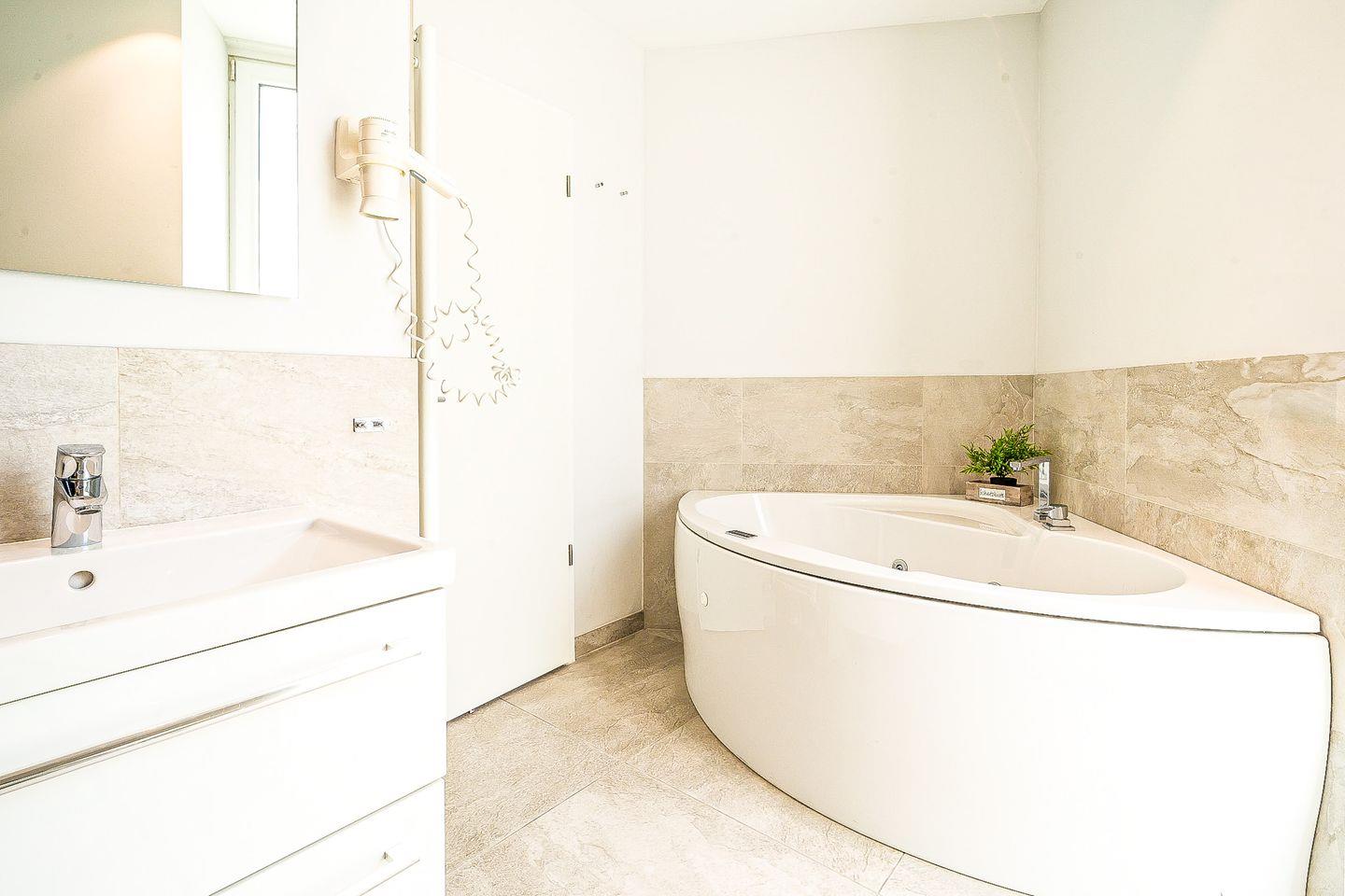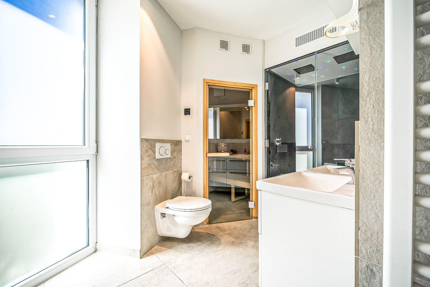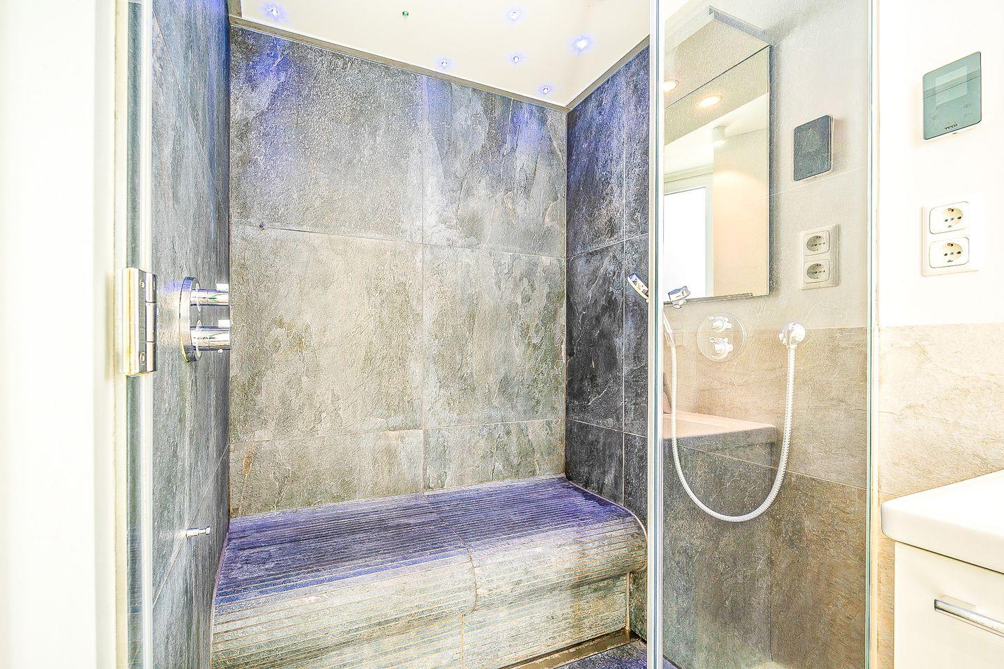 Das luxuriöse Badezimmer wird zu Deinem persönlichen Wellnessbereich: eine moderne Badewanne mit wohltuender Whirlpool-Funktionsowie, ein Dampfbad mit integrierter Doppelregendusche sowie eine Sauna lassen keine Wünsche offen.