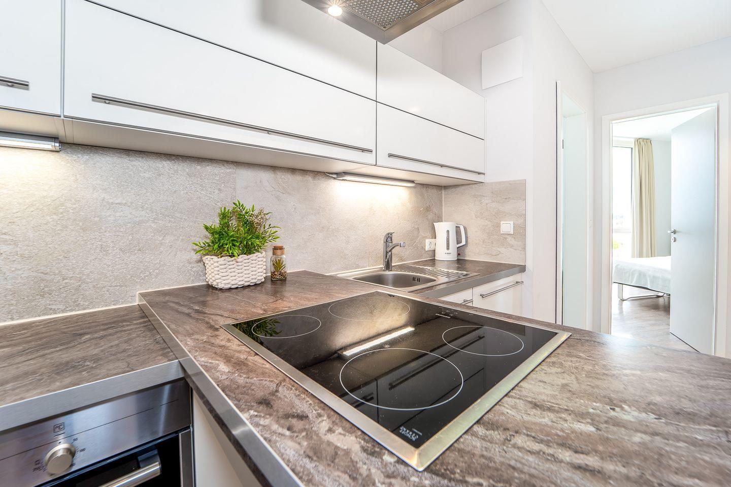 Auf rund 82 m² erwartet Dich ein stilvoll eingerichtetes Urlaubsdomizil mit Wohn-Essbereich, offener Küche, zwei separaten Schlafzimmern, einem luxuriösen Badezimmer sowie einem großen, überdachten Balkon mit außergewöhnlich schönem Meerblick.