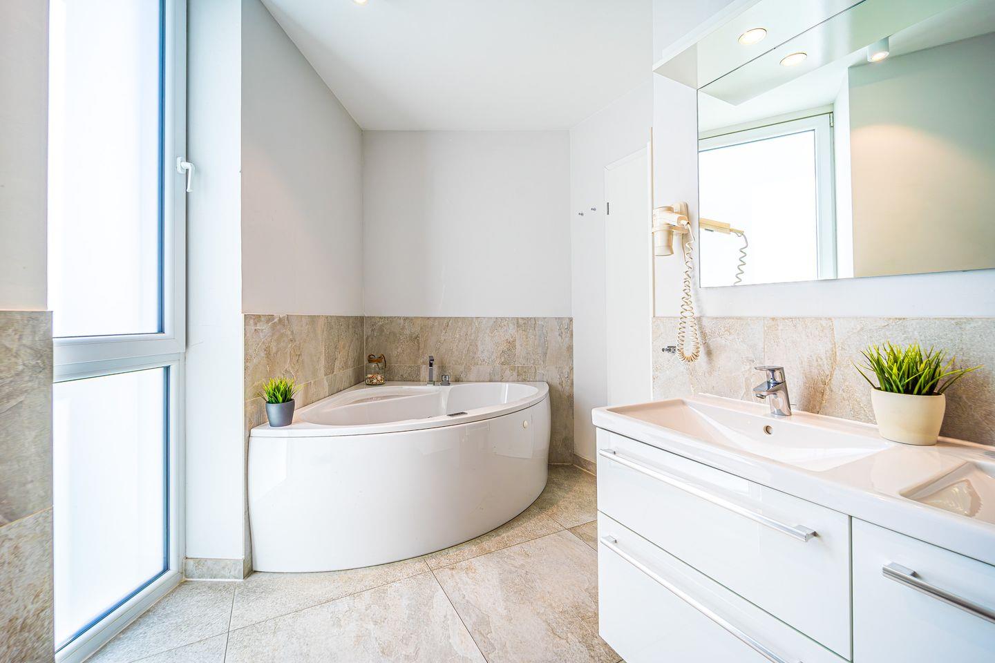 Ein besonderes Highlight ist das luxuriöse Badezimmer, das zu Deinem privaten Wellnessbereich wird: die moderne Badewanne mit wohltuender Whirlpool-Funktion sowie ein Dampfbad mit integrierter Doppelregendusche und die Sauna lassen keine Wünsche offen.