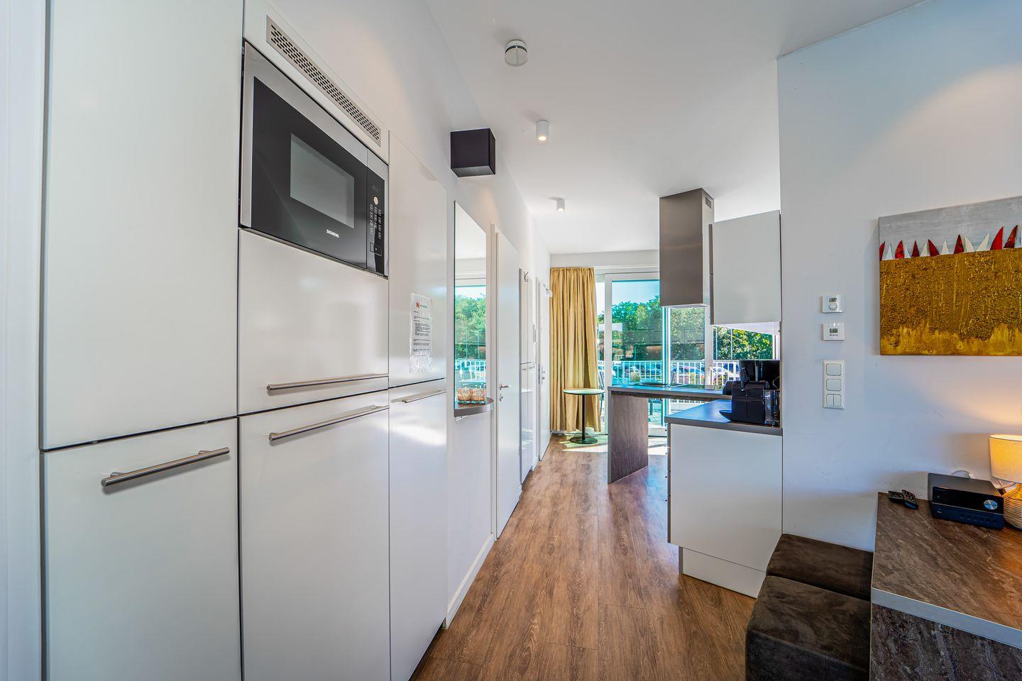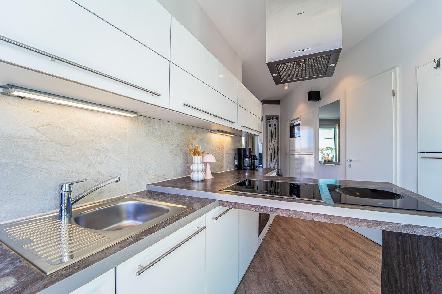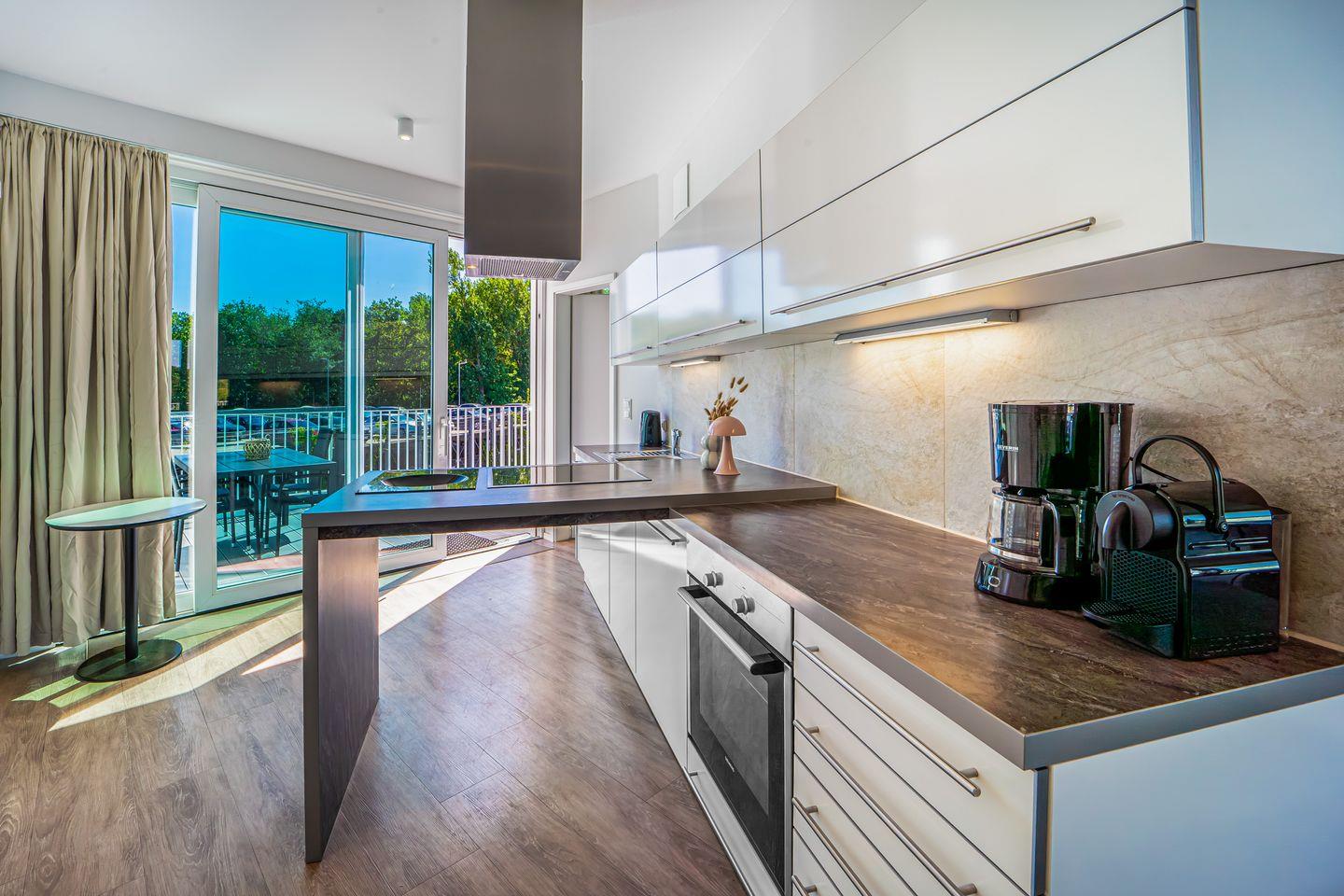 Die Penthousewohnung verfügt über zwei separate Schlafzimmer mit komfortablen Betten und viel Stauraum. Eines der Schlafzimmer hat eine direkte Terrassentür, sodass Du gleich am Morgen frische Seeluft genießen kannst. Von hier aus gelangst Du auch direkt in ein luxuriöses Badezimmer.