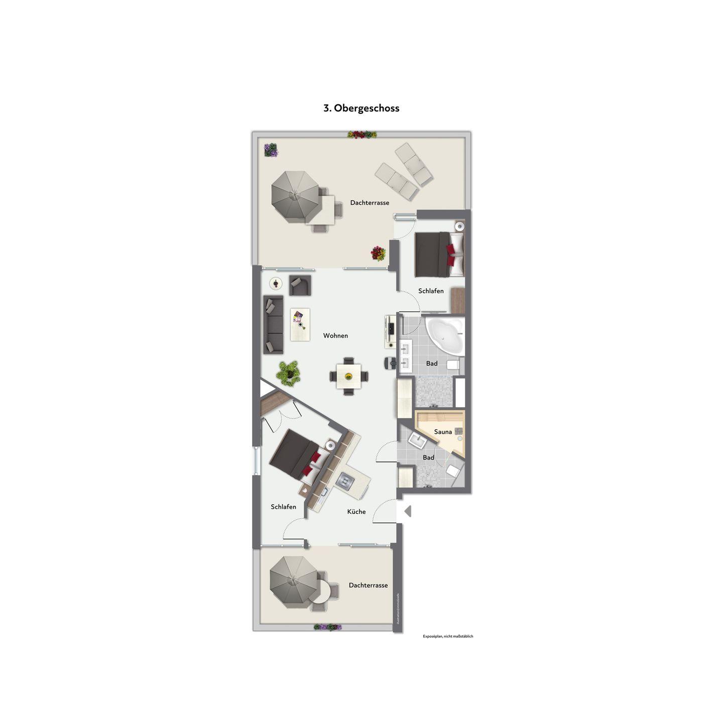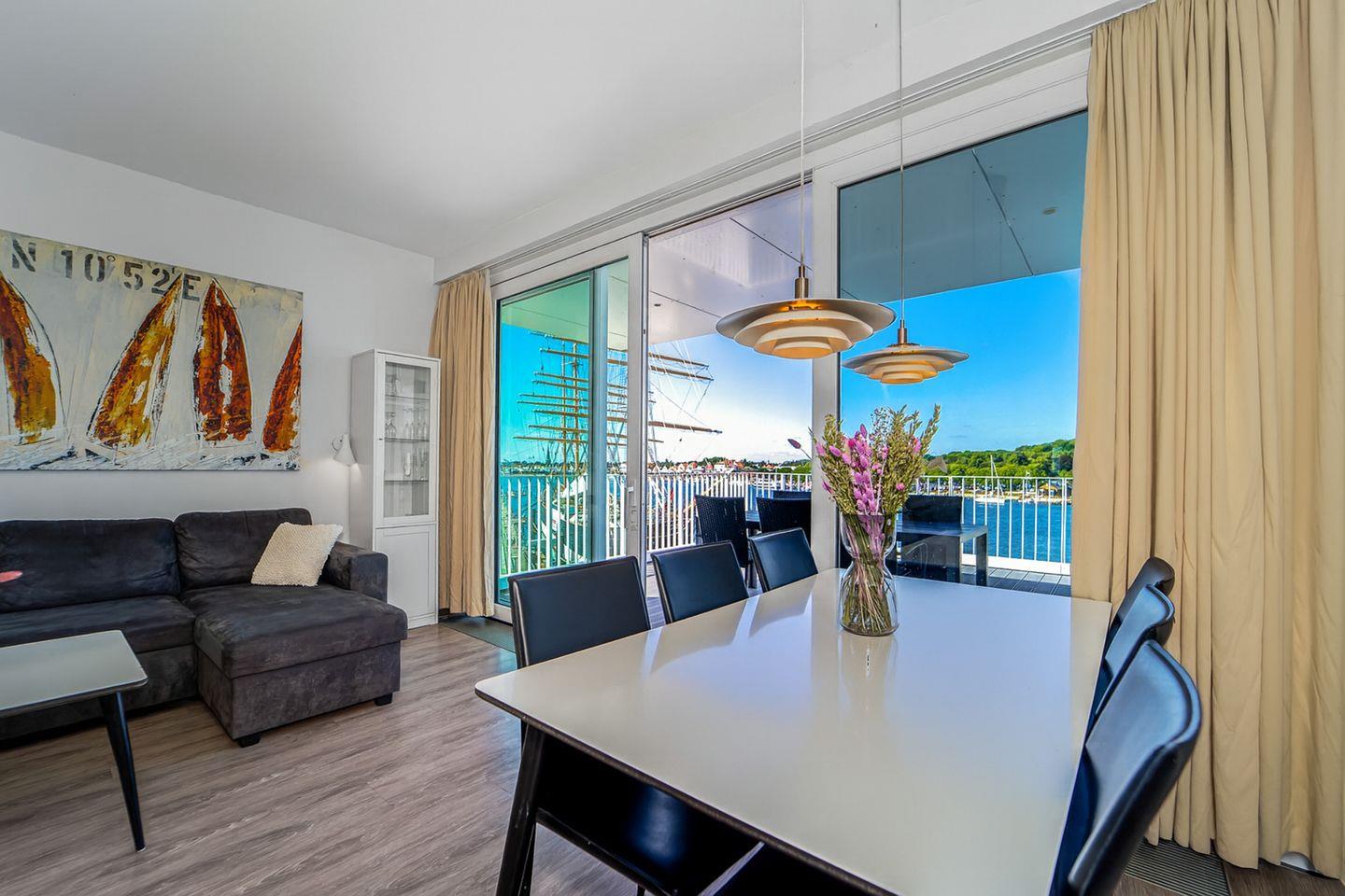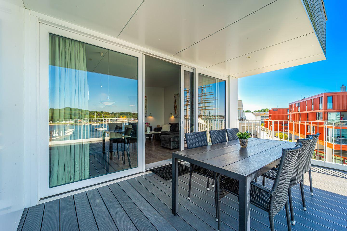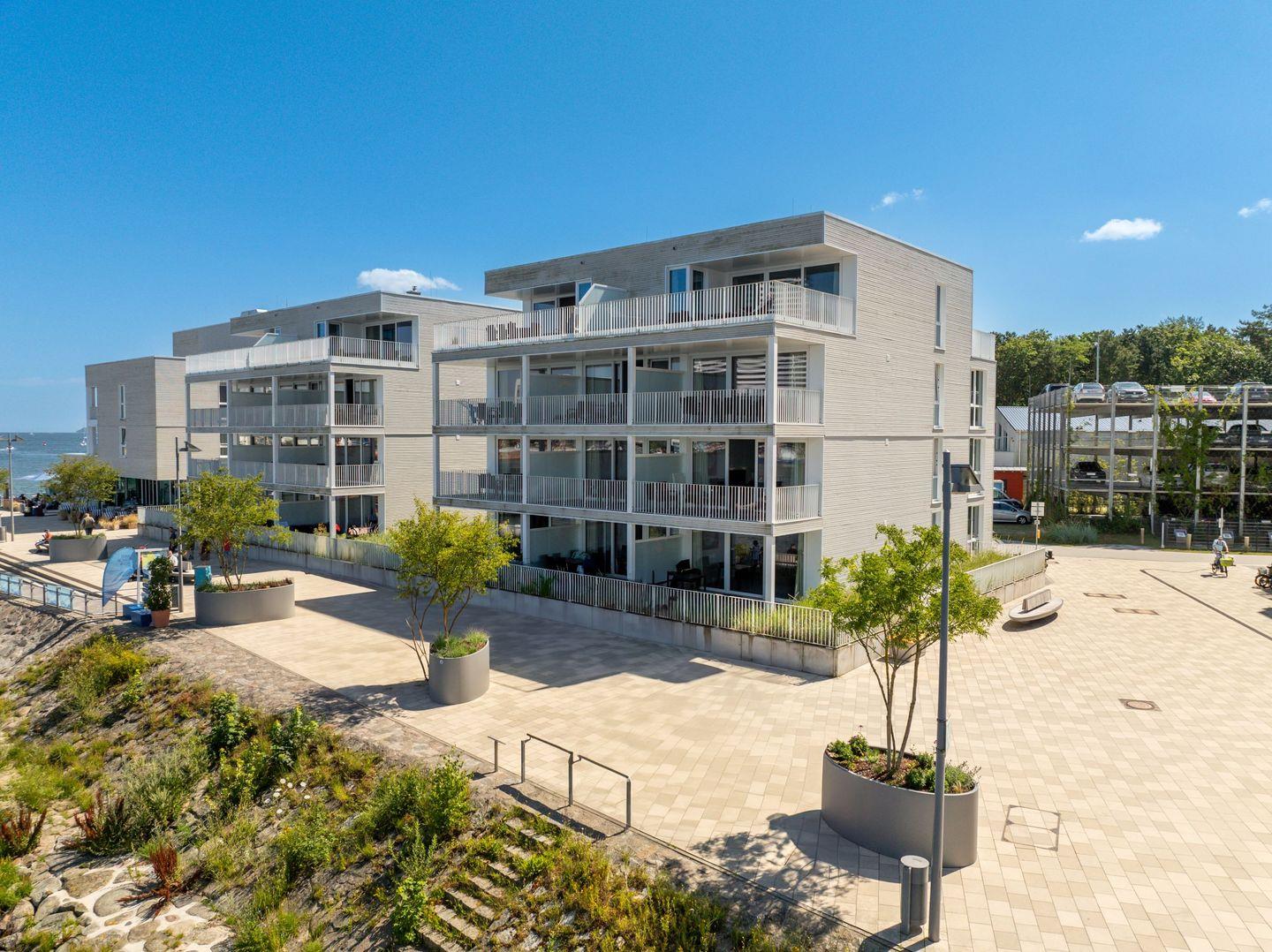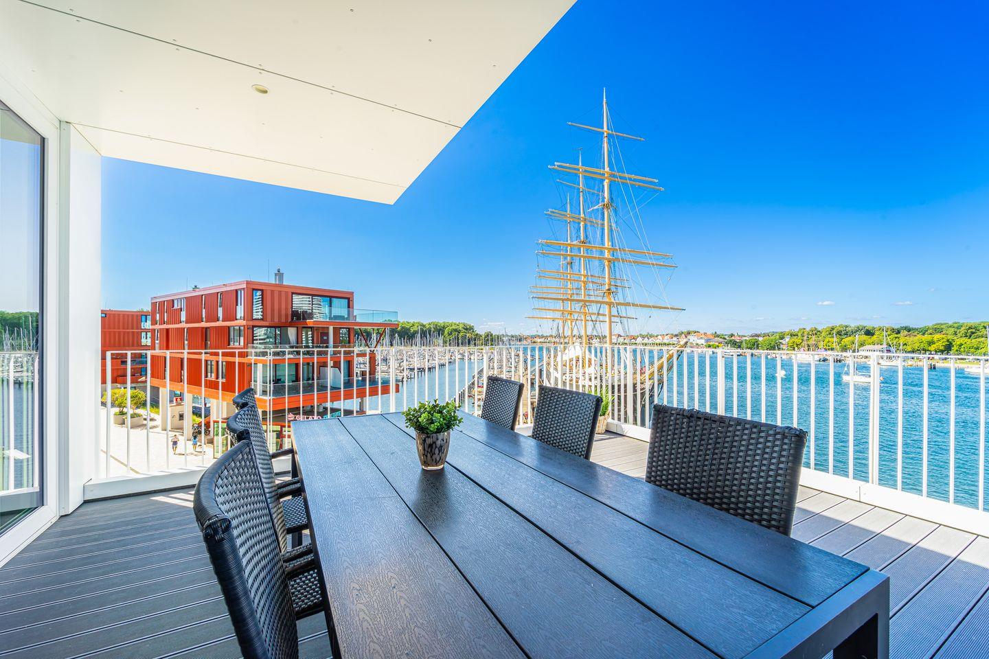 Die Dachterrassen bieten Dir einen einzigartigen Rundumblick: Auf der einen Seite schaust Du weit über den feinsandigen Strand und die Ostsee, auf der anderen Seite über den Segelhafen, die Travemündung, das Museumsschiff „Passat“ sowie die vorbeiziehenden Skandinavienfähren – ein Panorama, das seinesgleichen sucht. Mit Gartenmöbeln und Sonnenliegen ausgestattet, sind sie der perfekte Ort, um die frische Seeluft zu genießen, Sonne zu tanken und den unvergleichlichen Weitblick auszukosten.