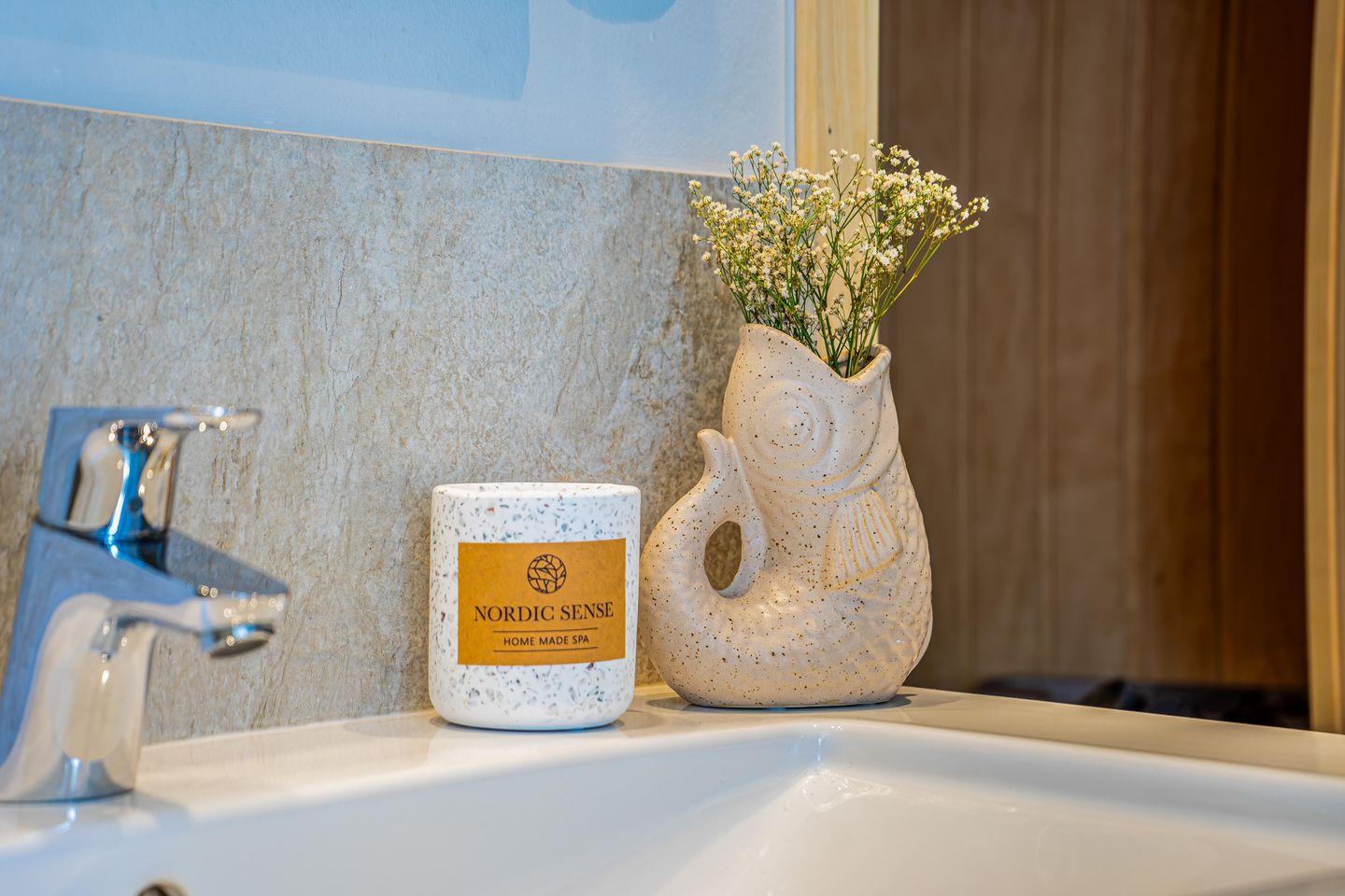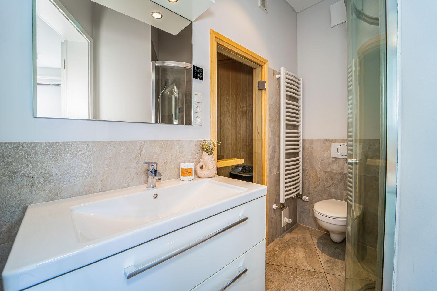 Das zweite Badezimmer verfügt über eine großzügige bodengleiche Dusche, WC, Föhn und eine eigene Sauna – perfekt, um nach einem Strandtag zu entspannen.