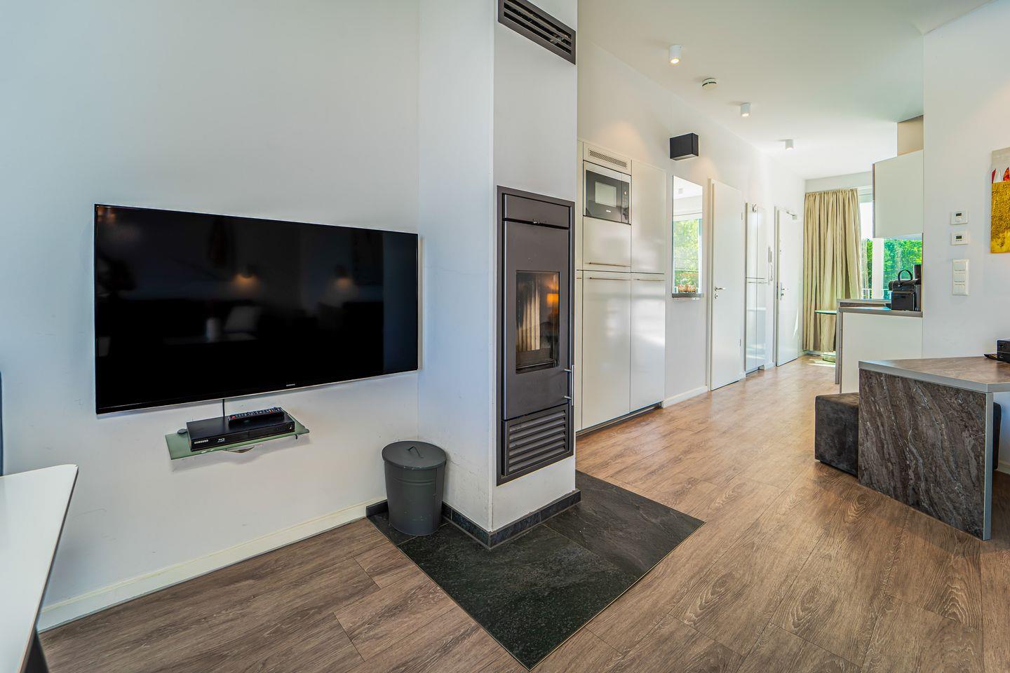 Der stilvolle Wohnbereich ist hochwertig eingerichtet mit Sofa, Sesseln, HiFi-Anlage, Blu-ray-Player und einem Flachbild-TV. Für behagliche Stunden sorgt der Kaminofen, der den Raum in warmes Licht taucht. Das Sofa lässt sich bei Bedarf zu zwei weiteren Schlafplätzen umbauen.
