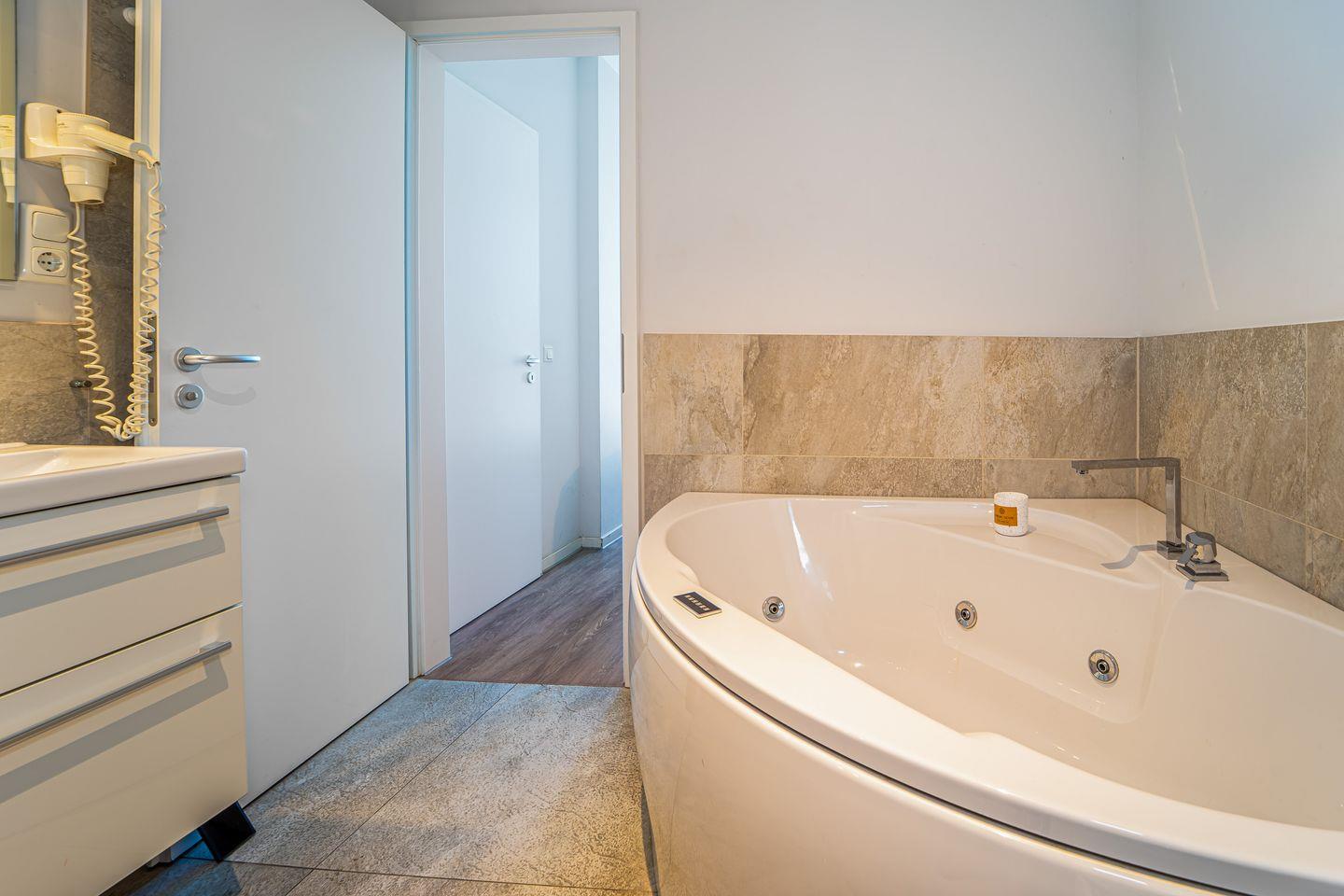 Das Badezimmer direkt am Schlafzimmer ist mit einer Whirlpoolbadewanne, einem Dampfbad mit integrierter Doppelregendusche, WC und Föhn ausgestattet – Deine private Wellnessoase.