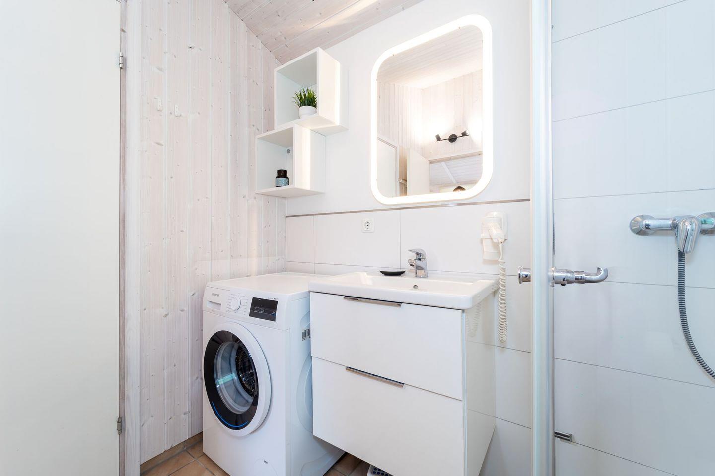 Im Badezimmer erwarten Dich eine bodengleiche Dusche, WC, Waschbecken sowie ein Haartrockner. Auch die Waschmaschine ist hier untergebracht.