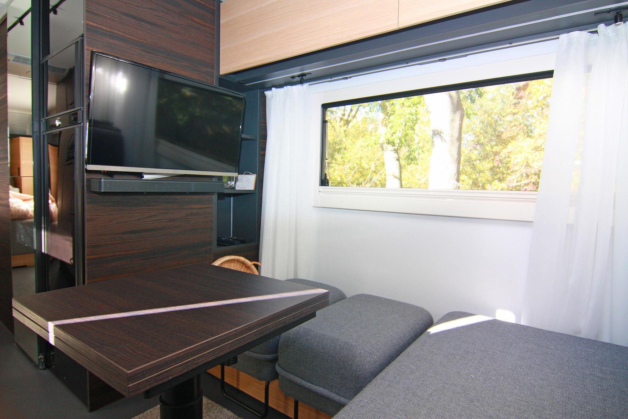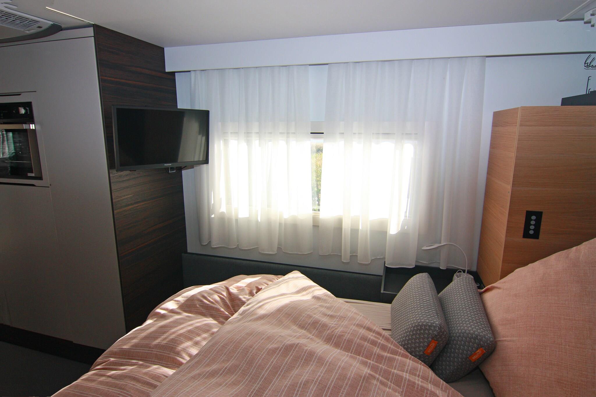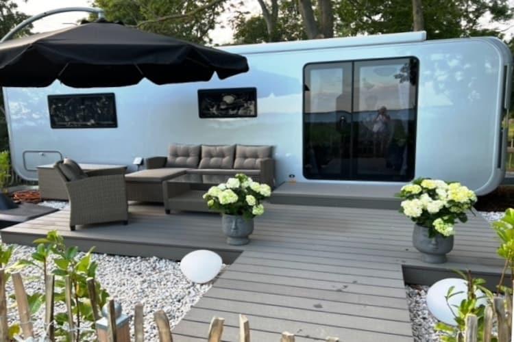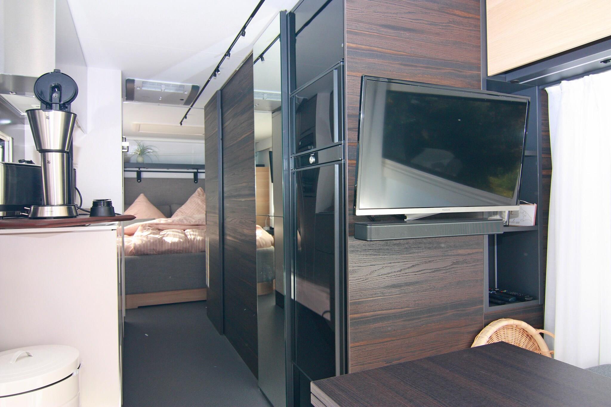 Here you'll stay in a luxury camping trailer with an unbeatable view of the Achterwasser lake! For a comfortable stay, this luxury camping trailer "Dreamer" has been permanently positioned on a small hill, quietly and idyllic, with a charming view of the Achterwasser lake. Although it's a small space, this caravan leaves nothing to be desired for a relaxing holiday. Right outside your door is your private fenced-in terrace with garden furniture and a parasol. Here, you can enjoy breakfast in the best weather or spend a cozy barbecue evening. Inside, you'll find a bedroom with a comfortable king-size bed and its own TV. The open-plan kitchen-living room includes a seating area with an extendable dining table, a TV, and a soundbar. It is fully equipped so you can start your vacation for two. Air conditioning is available for those really hot days. Highlights included: Final cleaning Gas and water Bed linen and towels Activities in the area: This luxury caravan is located along with several bungalows in a holiday resort modernized in 2012, situated on the dreamy natural Gnitz peninsula. Here you can experience the freedom, expanse, and beauty of Usedom most directly. Experience the tranquility of the untouched nature reserve on the banks of the Achterwasser on walks, boat trips, and bike tours. Enjoy hikes and bike tours through the magnificent natural landscape of Usedom. A beautiful day trip by bike is the approximately 55-kilometer circular route from the Gnitz peninsula - Zinowitz - Trassenheide - Wolgast - Krummin - Gnitz peninsula. You'll cycle through the center of Usedom, visit the beach, take a detour to the residence of the old Pomeranian dukes, and cycle through the tranquil hinterland of the Gnitz peninsula. A shop and a restaurant are located 1 km from the Möwenort holiday resort.