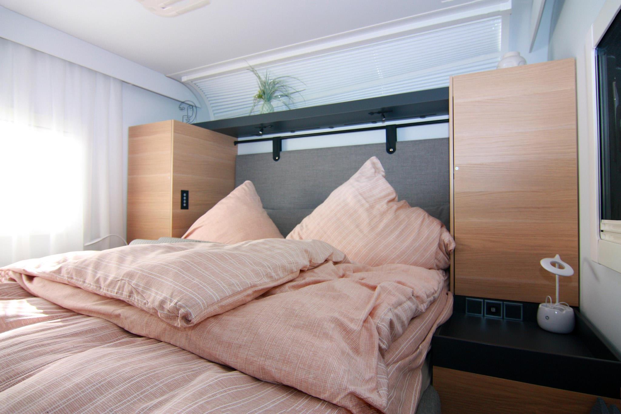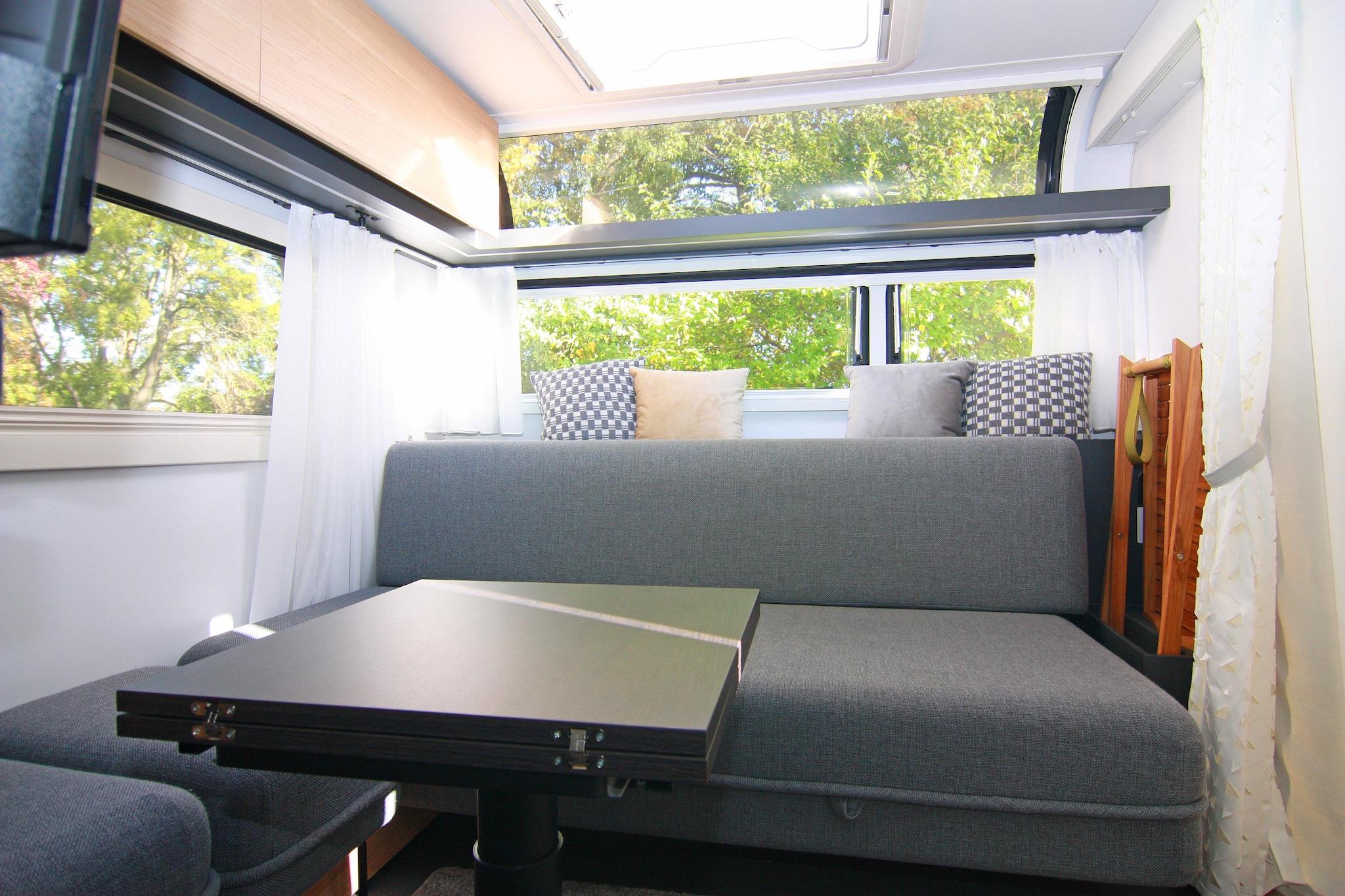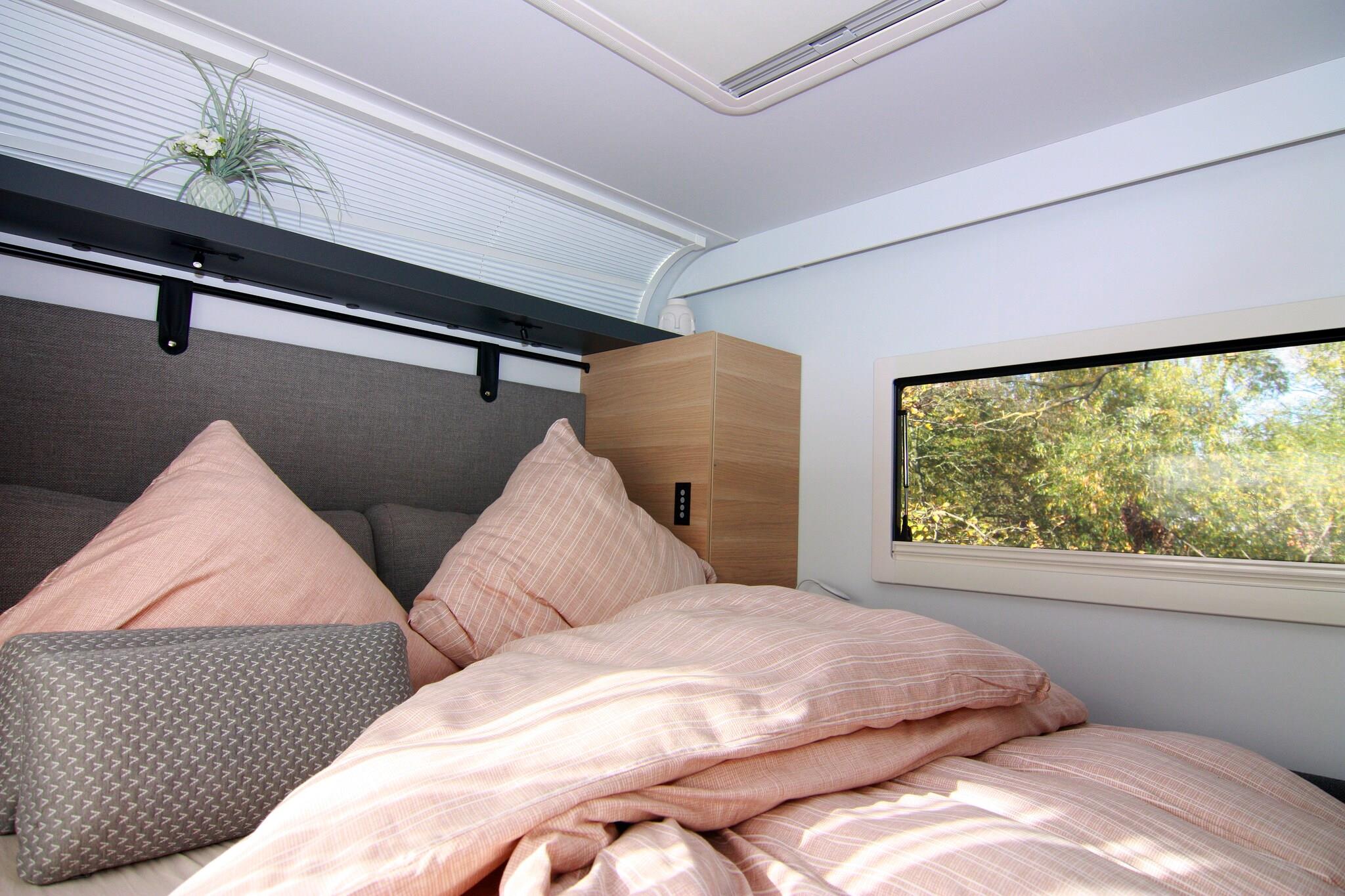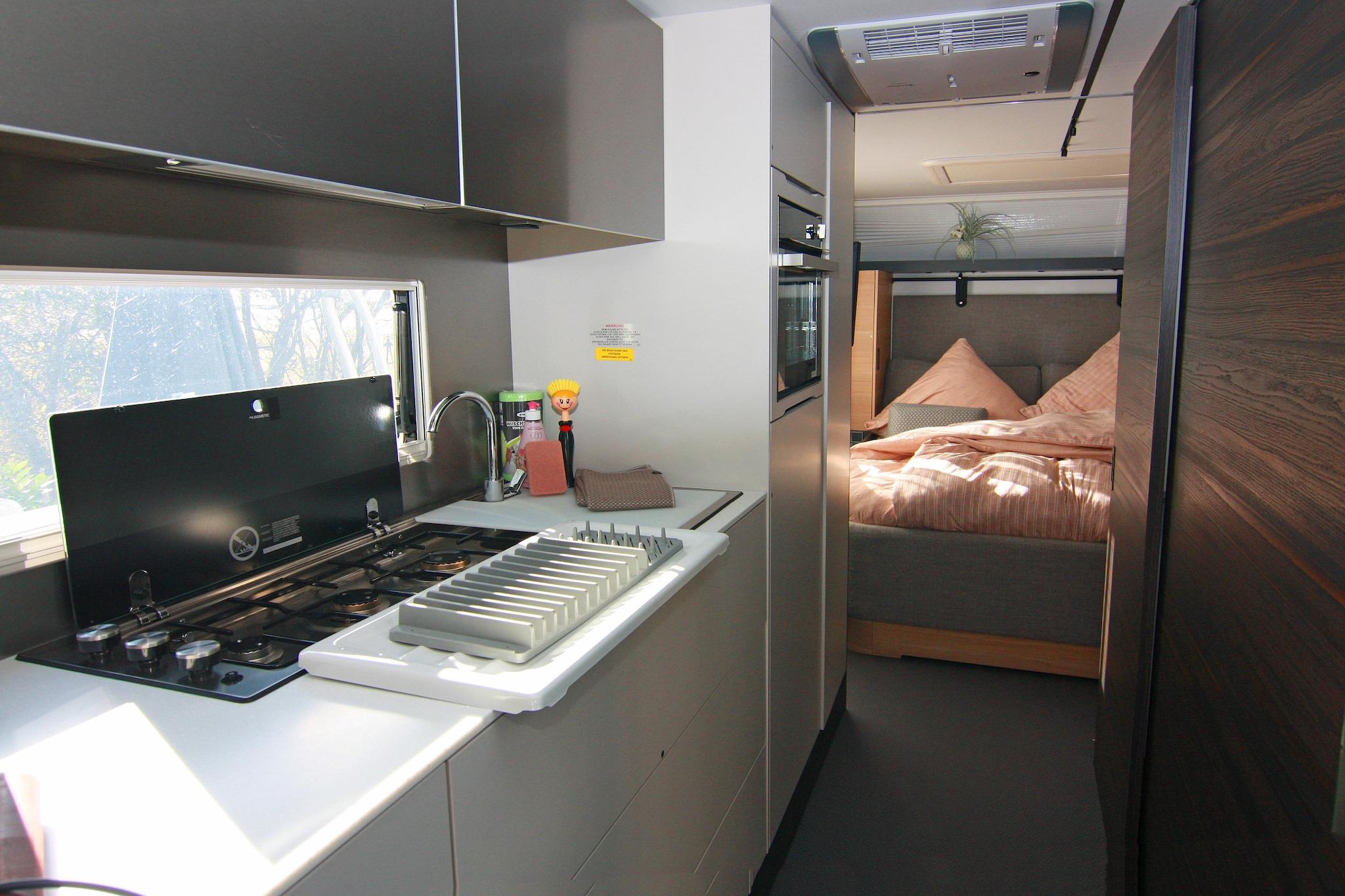 Here you'll stay in a luxury camping trailer with an unbeatable view of the Achterwasser lake! For a comfortable stay, this luxury camping trailer "Dreamer" has been permanently positioned on a small hill, quietly and idyllic, with a charming view of the Achterwasser lake. Although it's a small space, this caravan leaves nothing to be desired for a relaxing holiday. Right outside your door is your private fenced-in terrace with garden furniture and a parasol. Here, you can enjoy breakfast in the best weather or spend a cozy barbecue evening. Inside, you'll find a bedroom with a comfortable king-size bed and its own TV. The open-plan kitchen-living room includes a seating area with an extendable dining table, a TV, and a soundbar. It is fully equipped so you can start your vacation for two. Air conditioning is available for those really hot days. Highlights included: Final cleaning Gas and water Bed linen and towels Activities in the area: This luxury caravan is located along with several bungalows in a holiday resort modernized in 2012, situated on the dreamy natural Gnitz peninsula. Here you can experience the freedom, expanse, and beauty of Usedom most directly. Experience the tranquility of the untouched nature reserve on the banks of the Achterwasser on walks, boat trips, and bike tours. Enjoy hikes and bike tours through the magnificent natural landscape of Usedom. A beautiful day trip by bike is the approximately 55-kilometer circular route from the Gnitz peninsula - Zinowitz - Trassenheide - Wolgast - Krummin - Gnitz peninsula. You'll cycle through the center of Usedom, visit the beach, take a detour to the residence of the old Pomeranian dukes, and cycle through the tranquil hinterland of the Gnitz peninsula. A shop and a restaurant are located 1 km from the Möwenort holiday resort.