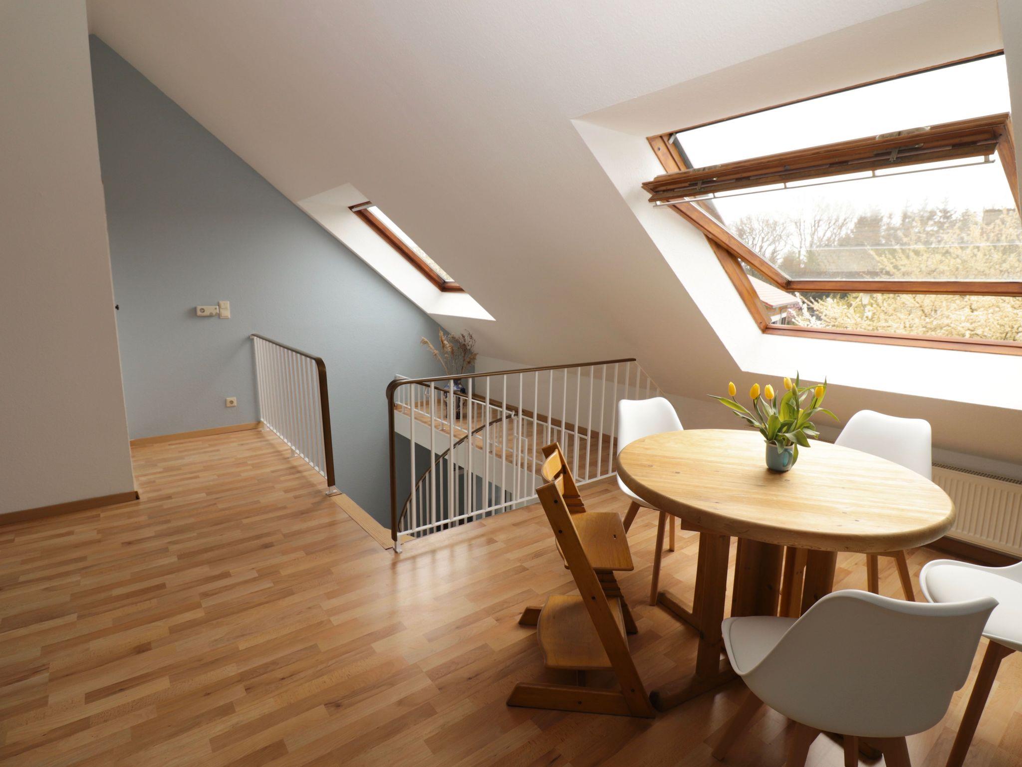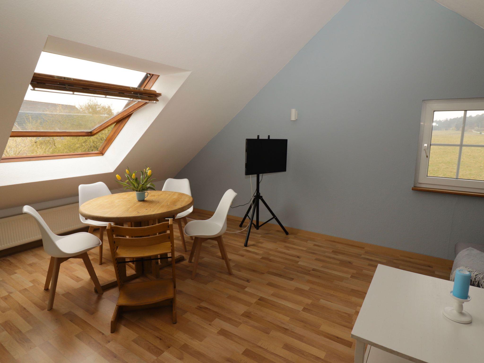 Im großzügigen Wohnbereich unter dem Dach steht ein runder massiver Holztisch mit modernen Kunststoffschalenstühlen und auch hier einem TrippTrapp Kinderstuhl. Für die gemütlichen Stunden findet sich hier ein Dreier-Sofa mit Recamière und ein einzelner Ohrensessel mit Sitzbank. Diese Möbel sind mit zeitlosem grauen Sofastoff bezogen und mit bunten Kissen aufgefrischt. Mit dem Flachbildfernseher, der an einem Dreibeinstativ befestigt ist, werden zahlreiche Sender per Satellitenantenne empfangen.