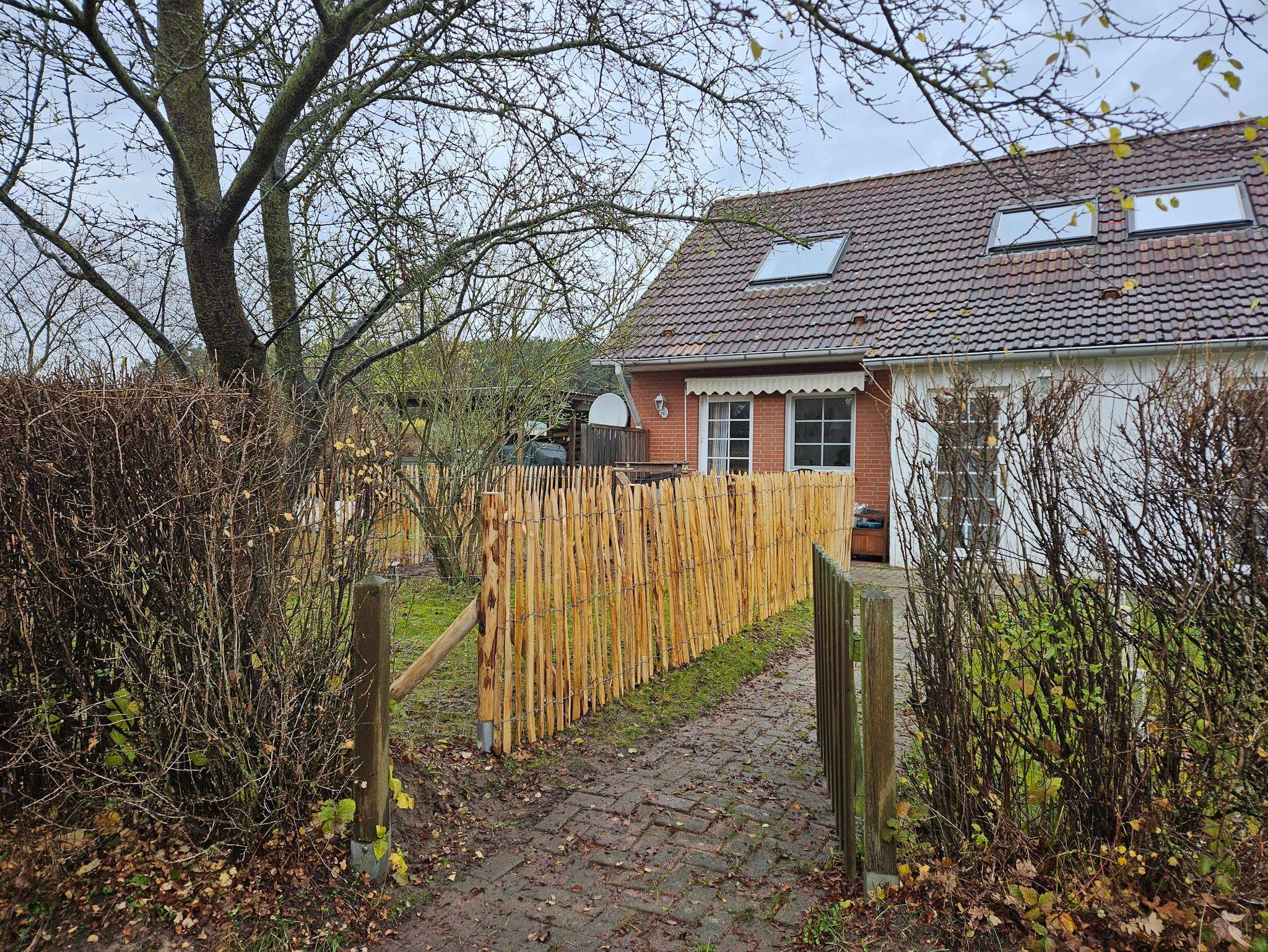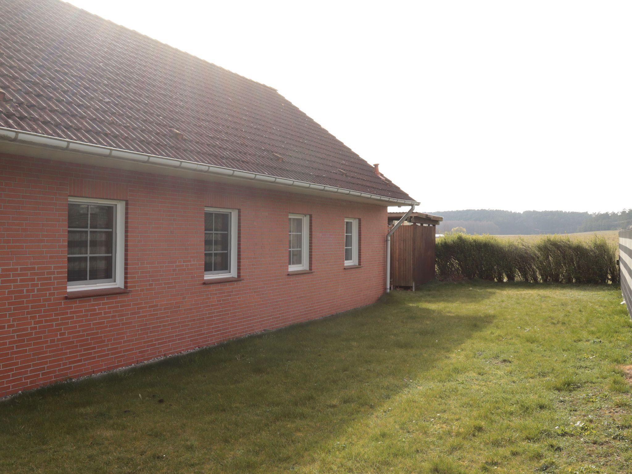 Das Haus Biberburg liegt ganz am südwestlichsten Ende der Lütower Ferienhaussiedlung, die aus mehreren baugleichen Doppelhäusern mit Satteldach, Rotklinkerfassade und holzverkleidetem Windfang besteht. Das Haus grenzt mit seinem Garten an eine weitläufige unbebaute Schafwiese.