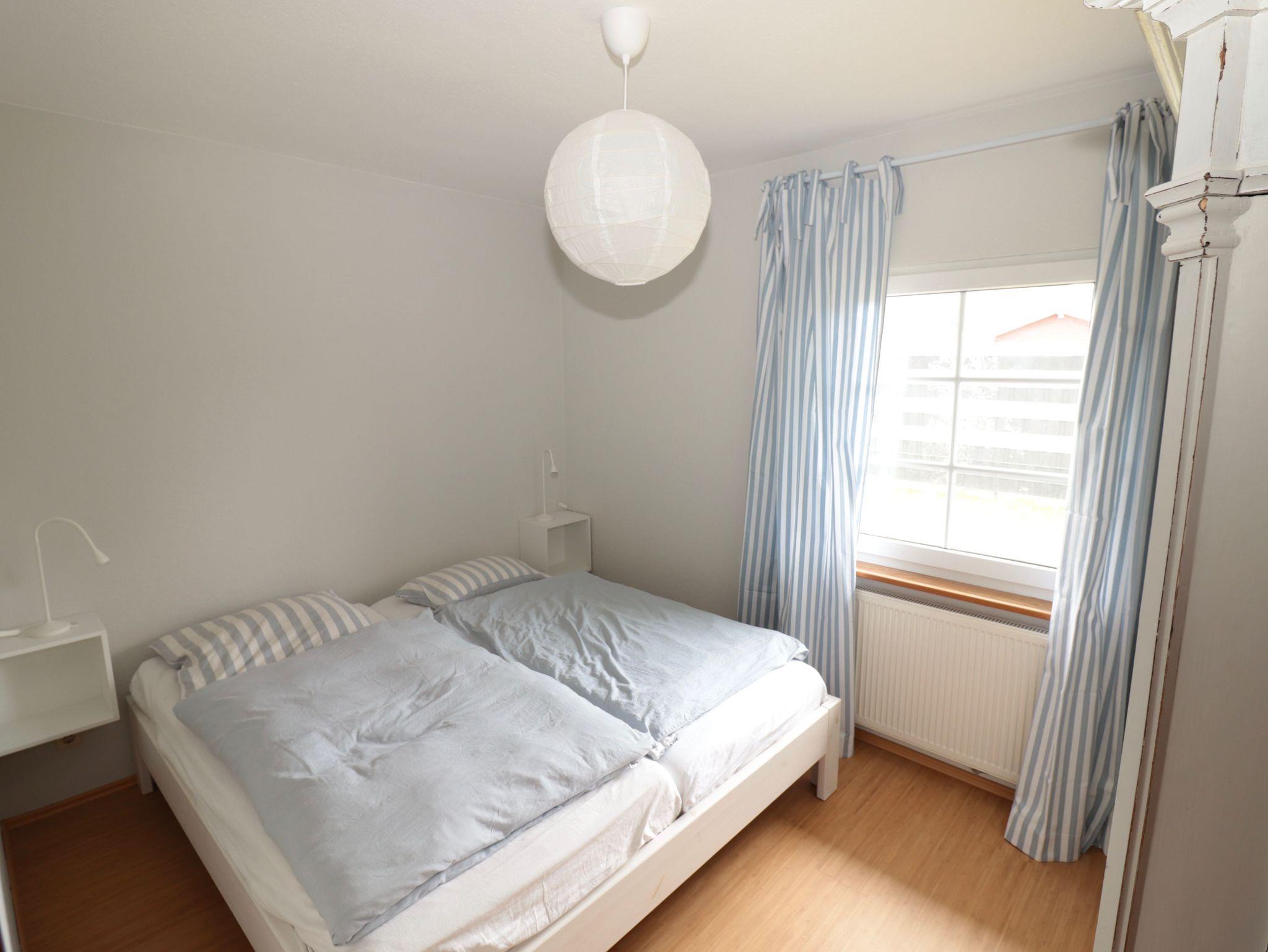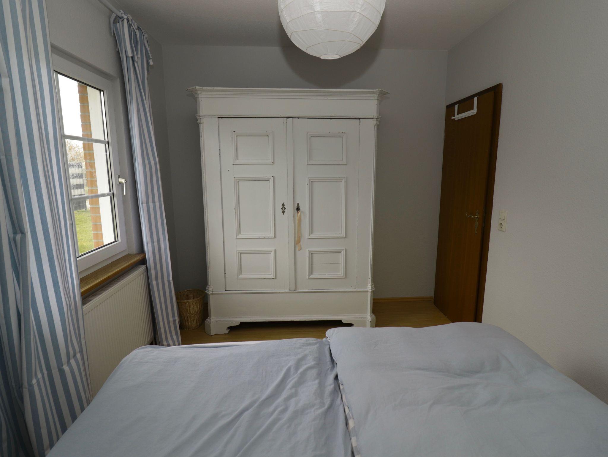 Vom Flur zweigen auch die beiden Schlafzimmer ab. Im Elternschlafzimmer befindet sich ein aus weißem Massivholz gearbeitetes Doppelbett mit den Maßen 180 x 200 cm und dem gegenüber steht ein skandinavischer antiker Kleiderschrank, ebenfalls aus massivem Weichholz sowie mit Kassettentüren und Dekor des 19. Jahrhunderts versehen.