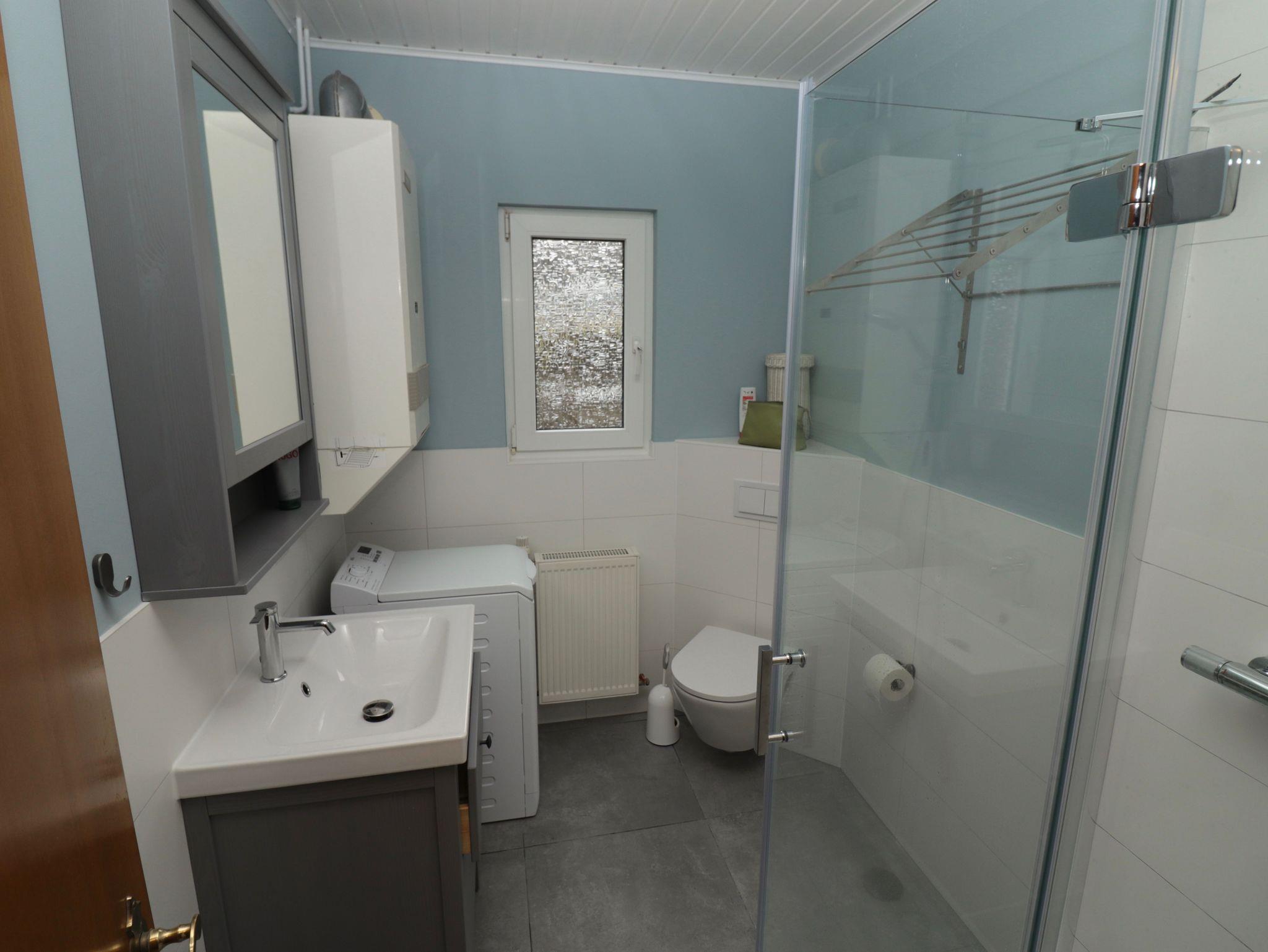 Über einen kleinen Flur erreicht man das ebenfalls 2024 vollständig renovierte Duschbad mit großzügiger bodenebener Duschkabine, einem Hänge-WC und Waschtisch. Außerdem befindet sich dort die Waschmaschine, die als Toplader von oben zu bedienen ist.