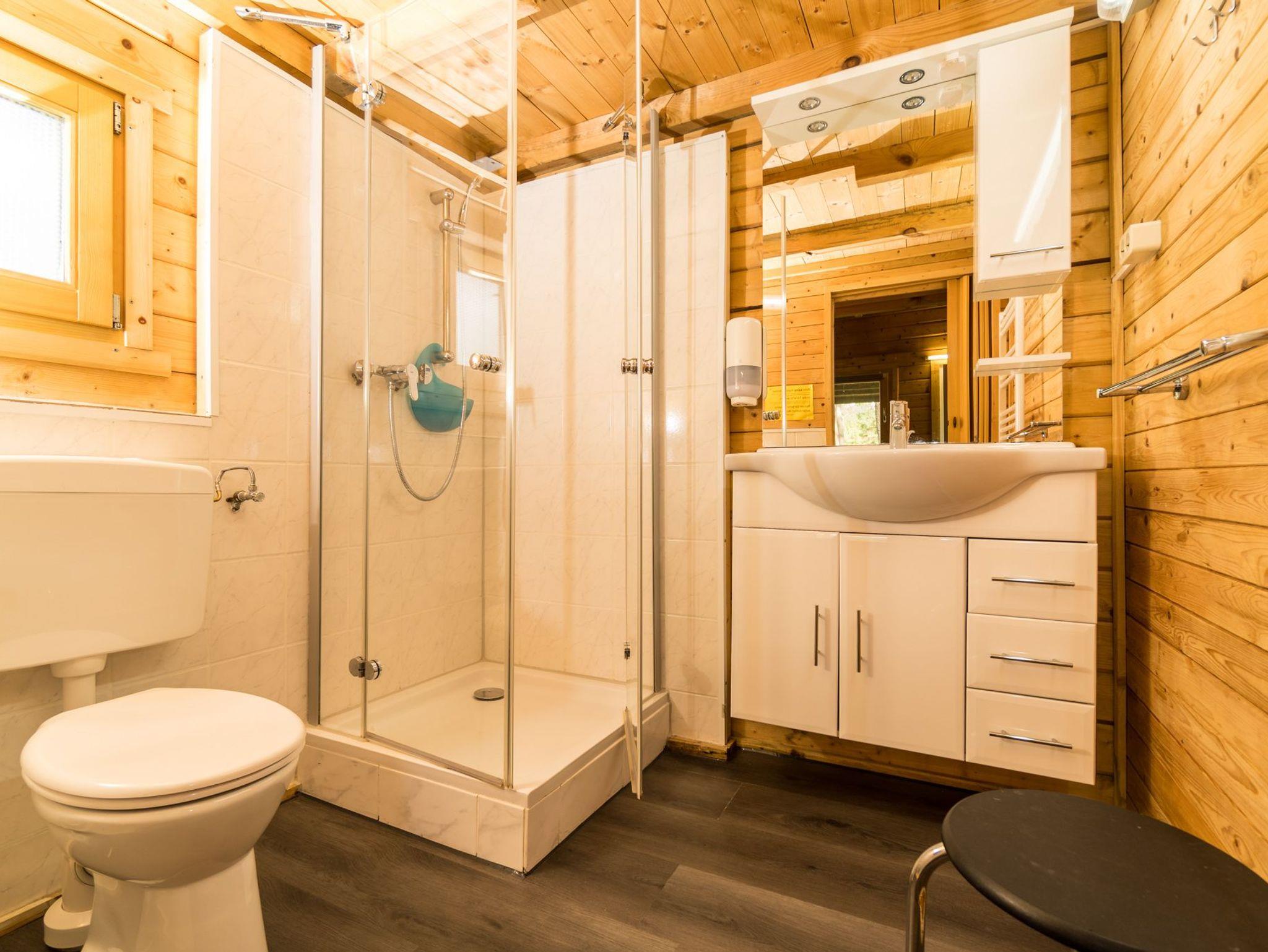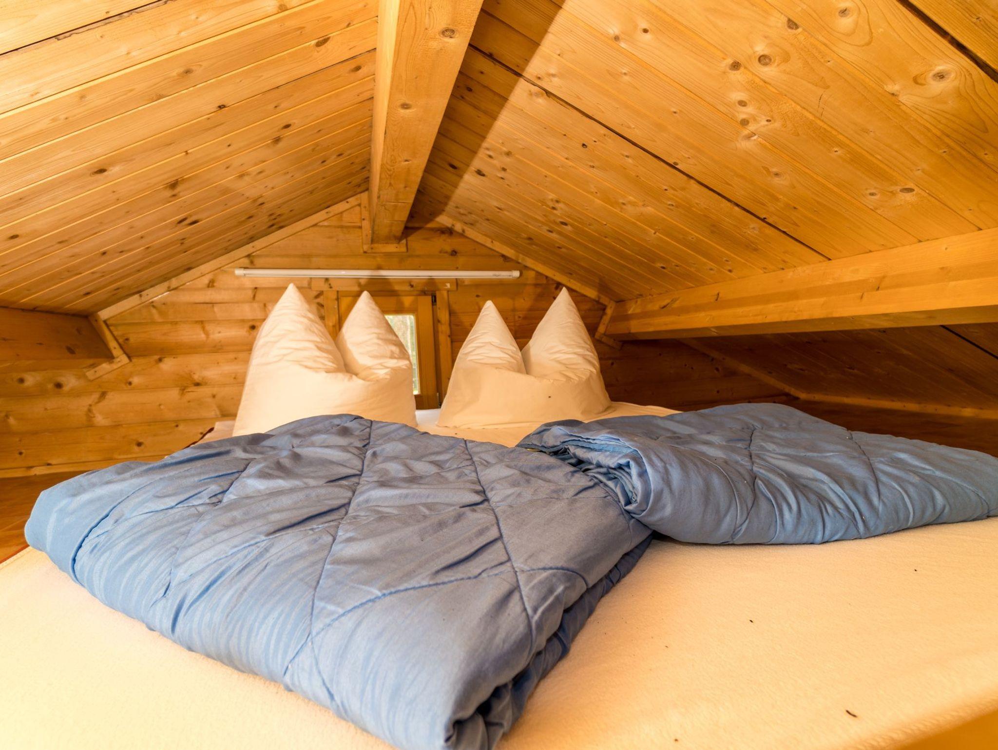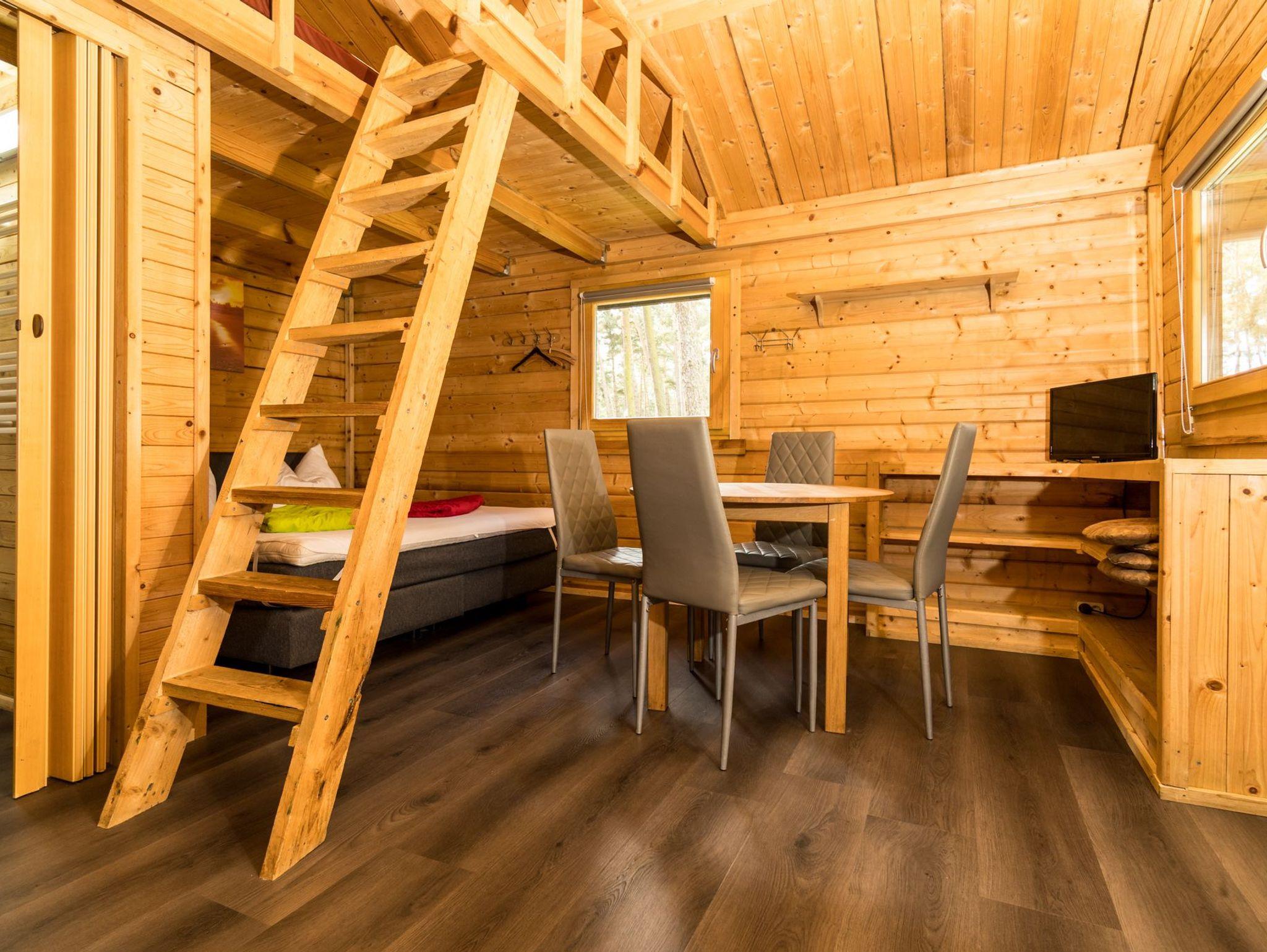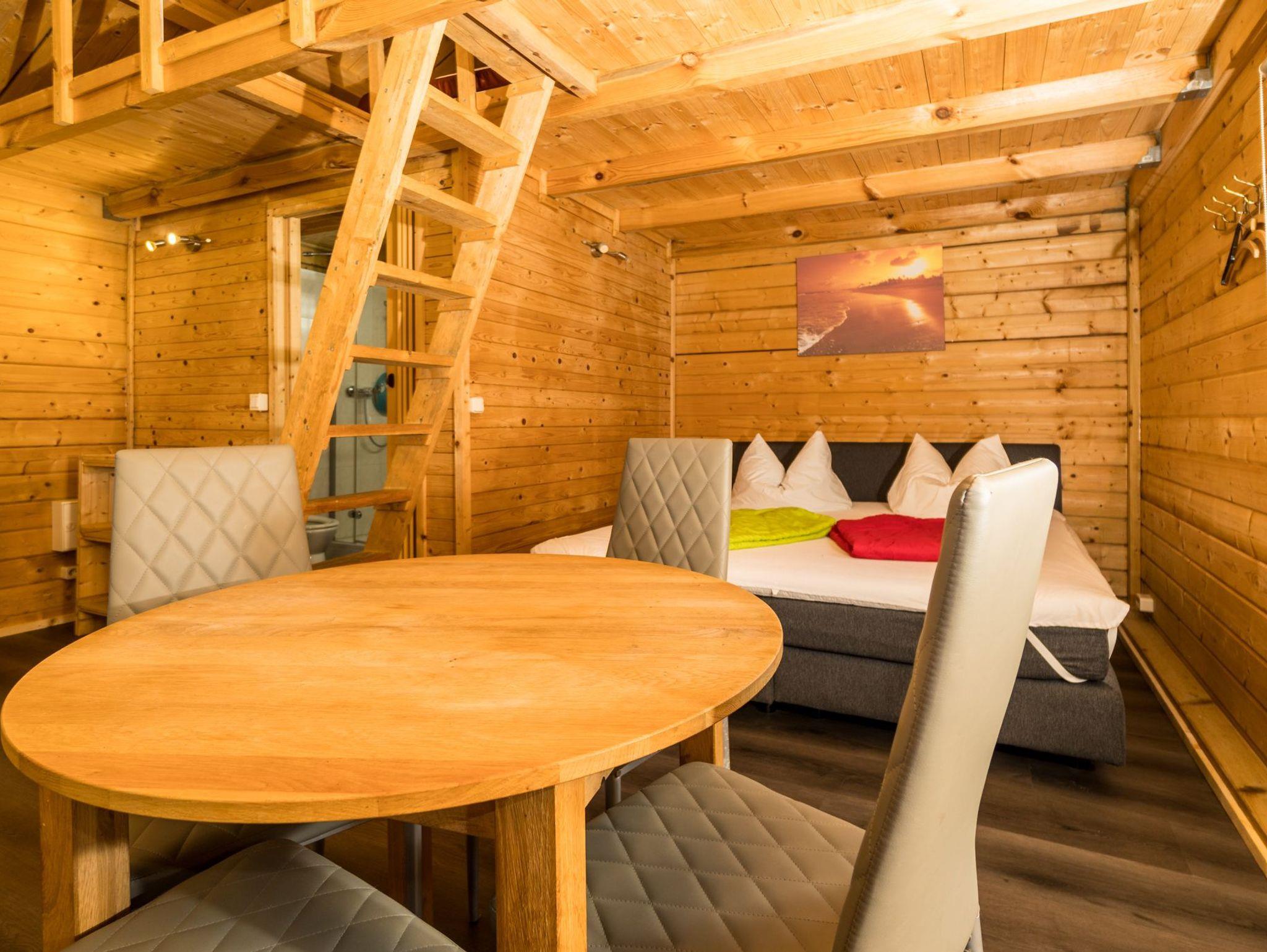 Der Bungalow verfügt über zwei Etagen. Die obere Etage ist ein Schlafboden für zwei Personen mit dicker Matraze (160x200cm) und über eine Leiter zu erreichen. Die untere Etage besteht aus einem großen Raum mit TV-Ecke, einer Flachstrecken für ihre Garderobe, einer Schlafnische mit Boxspring-Doppelbett (180x200cm) und der Küchenzeile. Separat befindet sich ein Bad mit Toilette und einer Dusche.