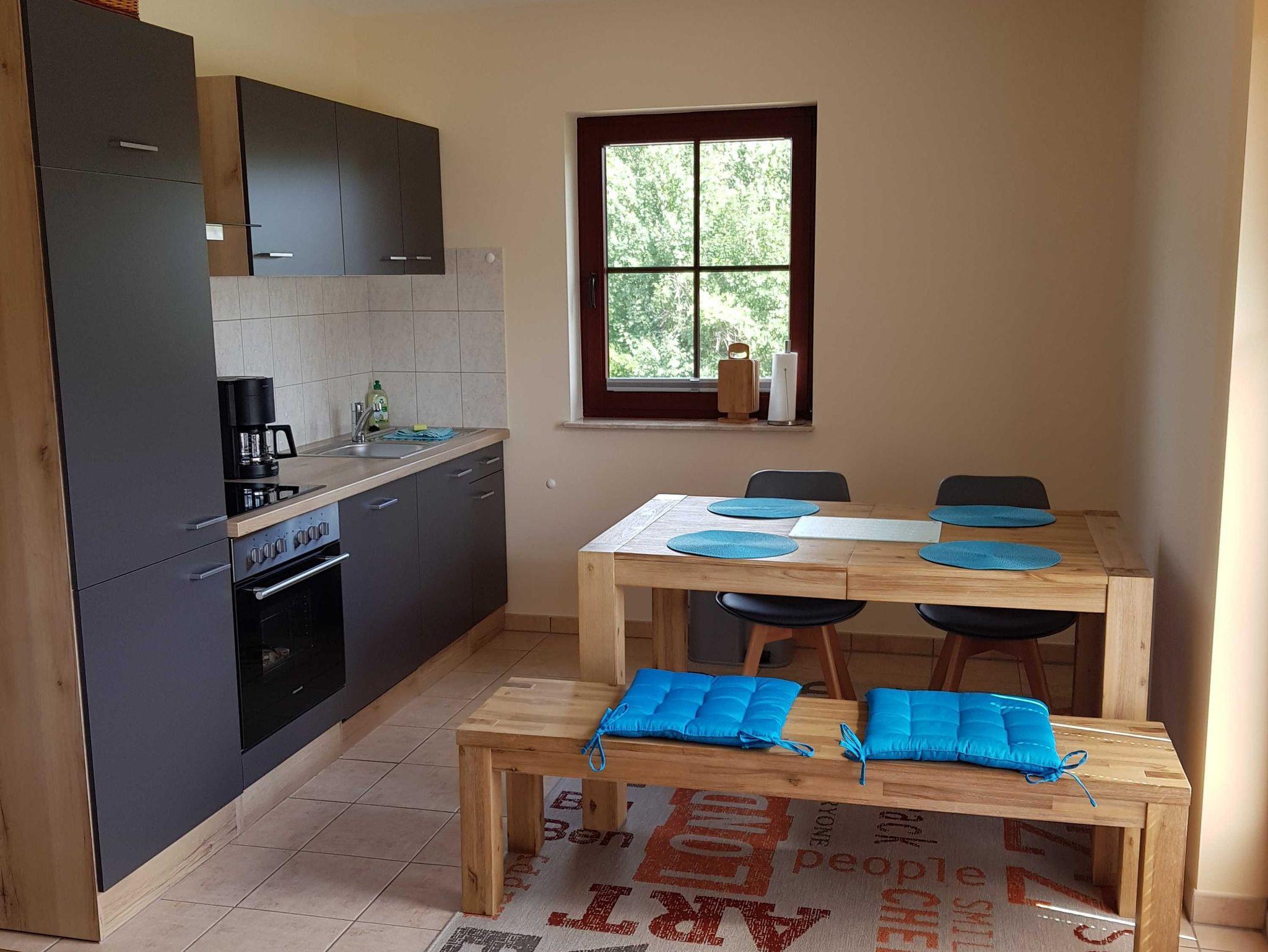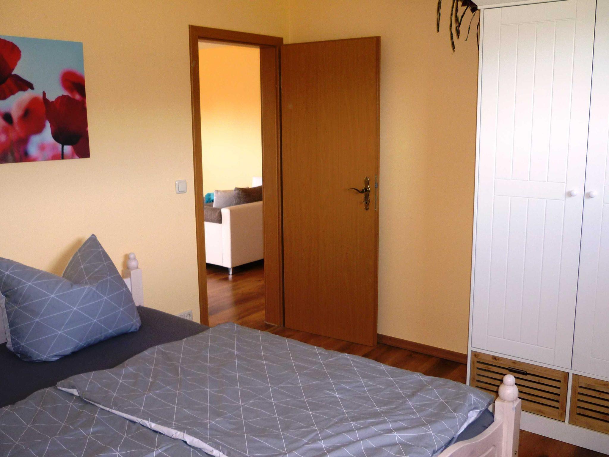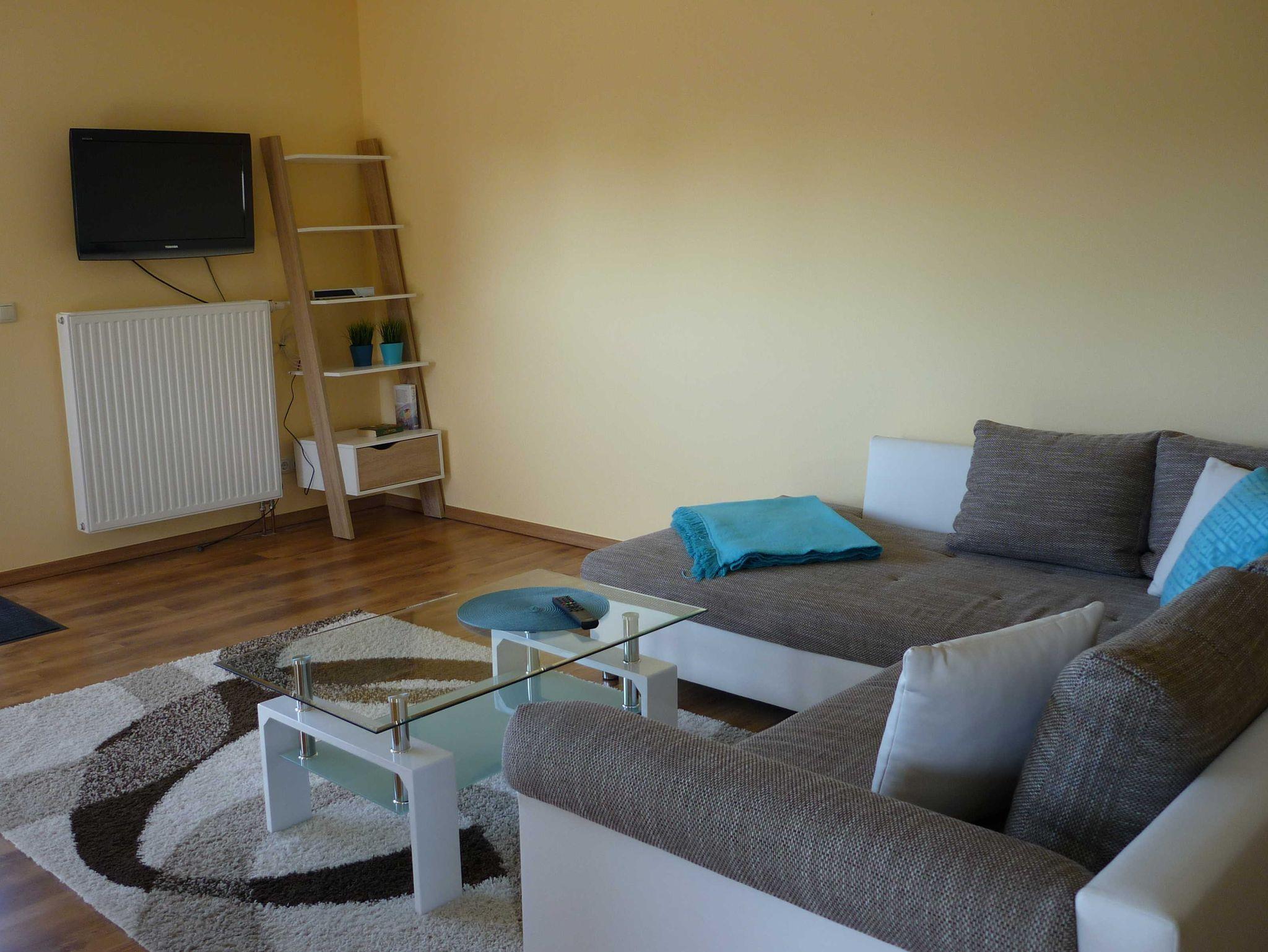 Die gemütliche 2-Raum-Ferienwohnung befindet sich im 1. Obergeschoss des Hauses und ist über eine Außentreppe zu erreichen. Das separate Schlafzimmer verfügt über ein Doppelbett und einen Kleiderschrank. Im großen Wohnzimmer befindet sich eine Couchsitzecke mit Flat-TV u. Radio. Die offene Küche ist ausgestattet mit Cerankochfeld, Backofen, Kühlschrank mit Gefrierfach, Kaffeemaschine, Wasserkocher und Toaster. Vom Wohnzimmer gelangen Sie über eine Treppe auf die möblierte Terrasse und genießen einen schönen Blick auf die umliegende Natur. Ein großes Bad mit Dusche/WC ist ebenfalls vorhanden. Die Erstausstattung Bettwäsche, Parkplatz, Nebenkosten und Endreinigung sind im Preis enthalten. Handtücher müssen mitgebracht werden. WLAN ist vorhanden.