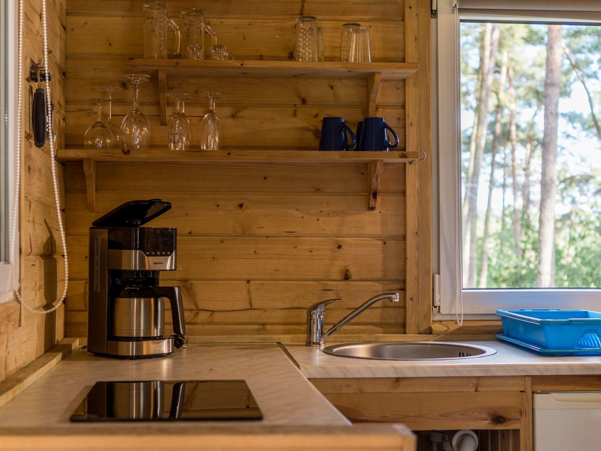 Der Bungalow verfügt über zwei Etagen. Die obere Etage ist ein Schlafboden mit dicker Matraze (160x200cm) für zwei Personen und über eine Leiter zu erreichen. Die untere Etage besteht aus einem großen Raum mit TV-Ecke, einer Flachstrecken für ihre Garderobe, einer Schlafnische mit Boxspring-Doppelbett (160x200cm) und der Küchenzeile. Separat befindet sich ein Bad mit Toilette und einer Dusche.