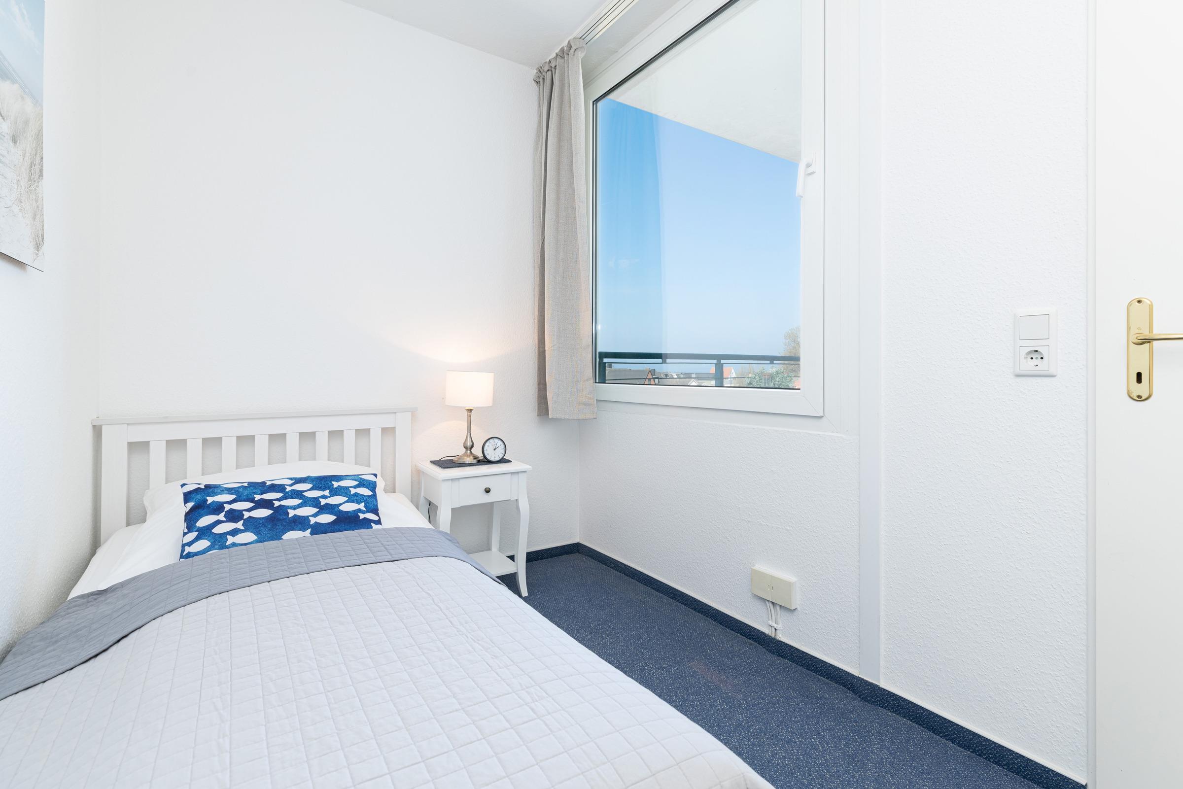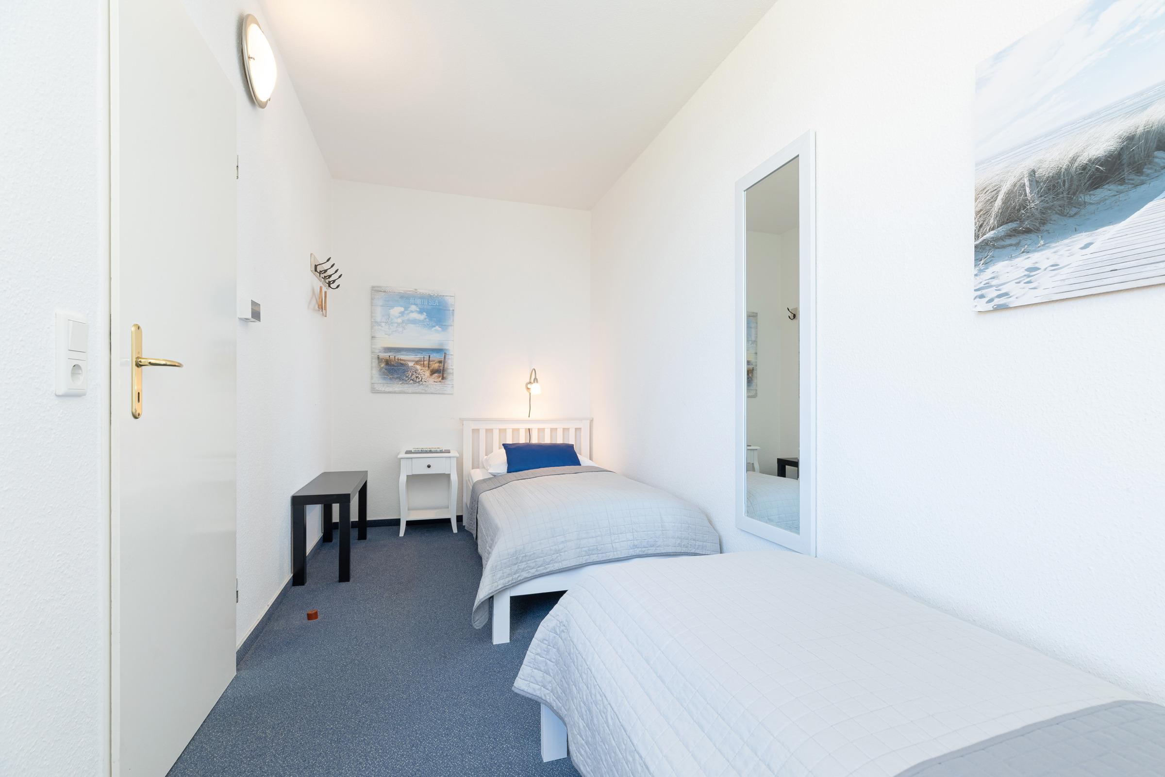 Schlafzimmer: 2 Einzelbetten (90x200 cm), Verdunkelung: Vorhänge, kein Platz für Babybett vorhanden