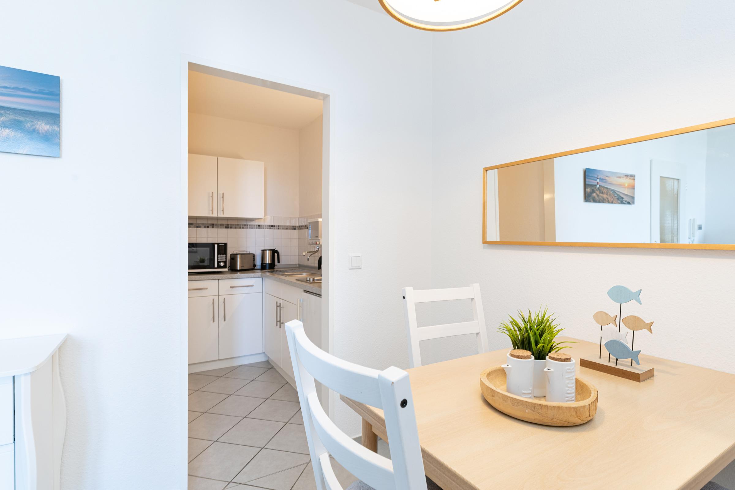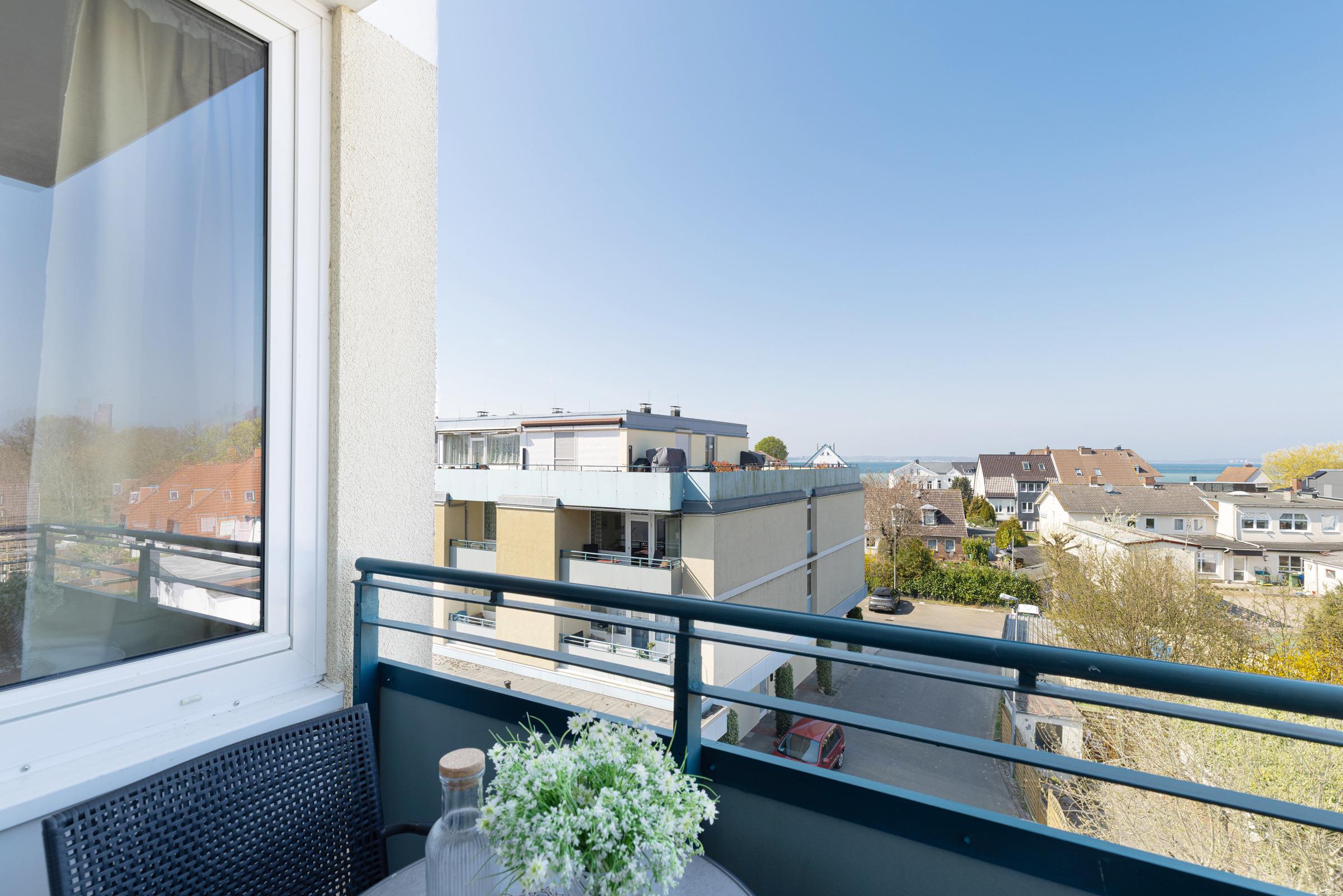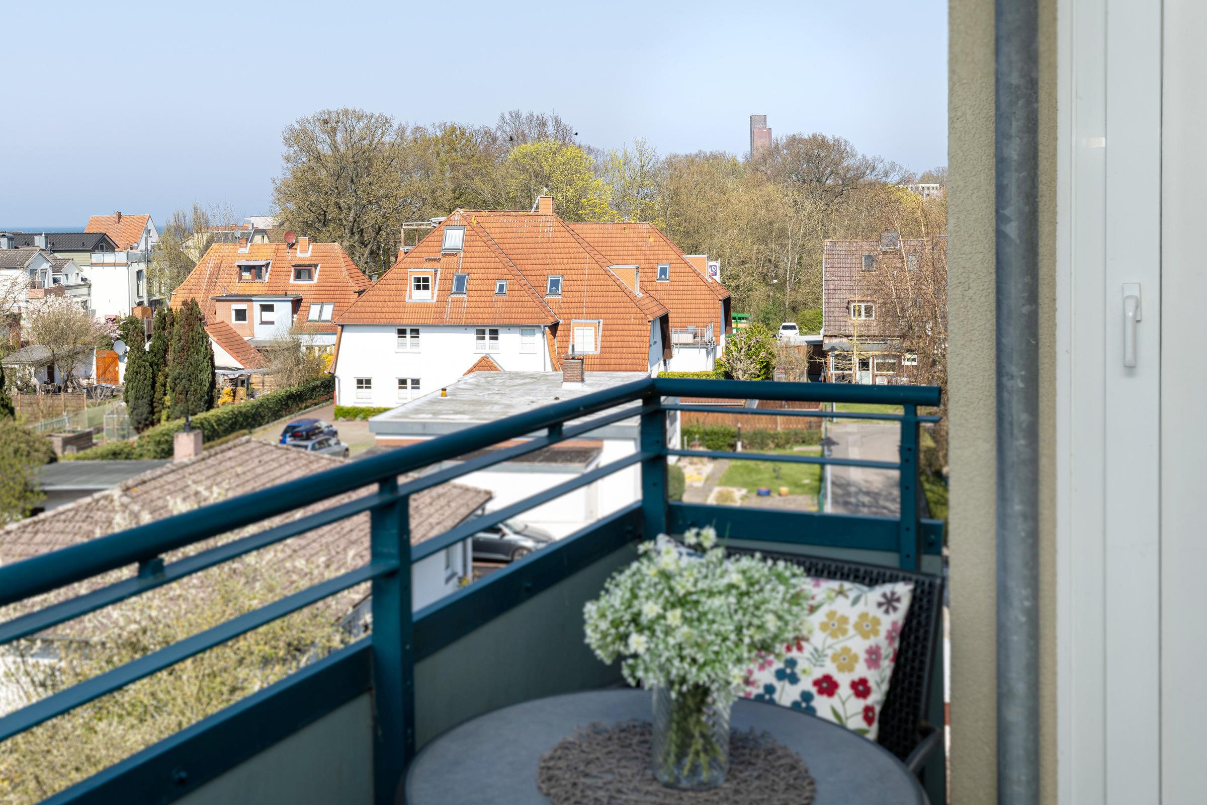 Die Wohnung teilt sich auf in eine Kochnische, ein Bad mit Dusche, einen Wohn-/Schlafraum mit Essecke und einen separaten Schlafraum mit 2 Einzelbetten. Vom Balkon aus können Sie zwischen den Häusern immer wieder einen Blick auf die Kieler Förde erhaschen.
