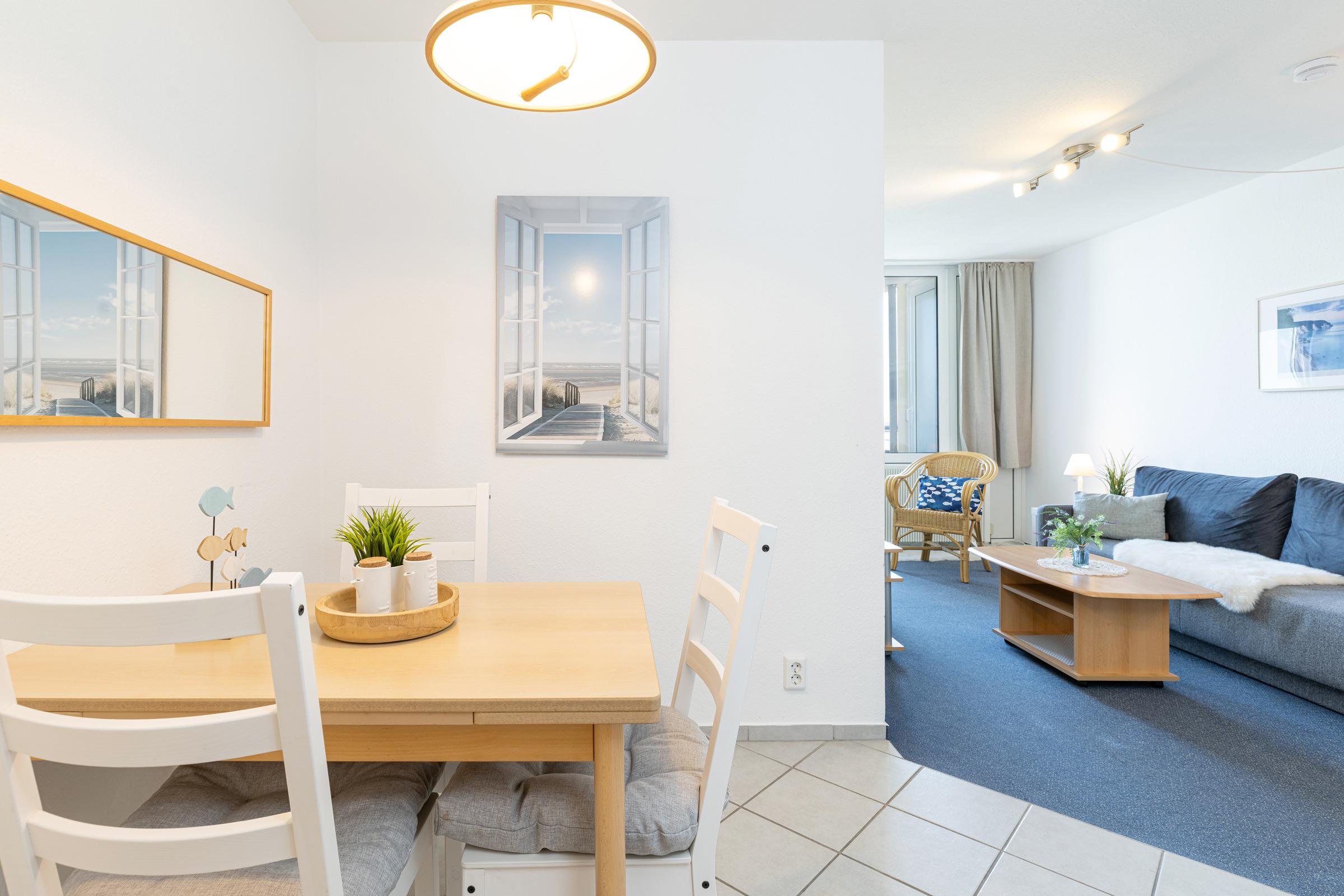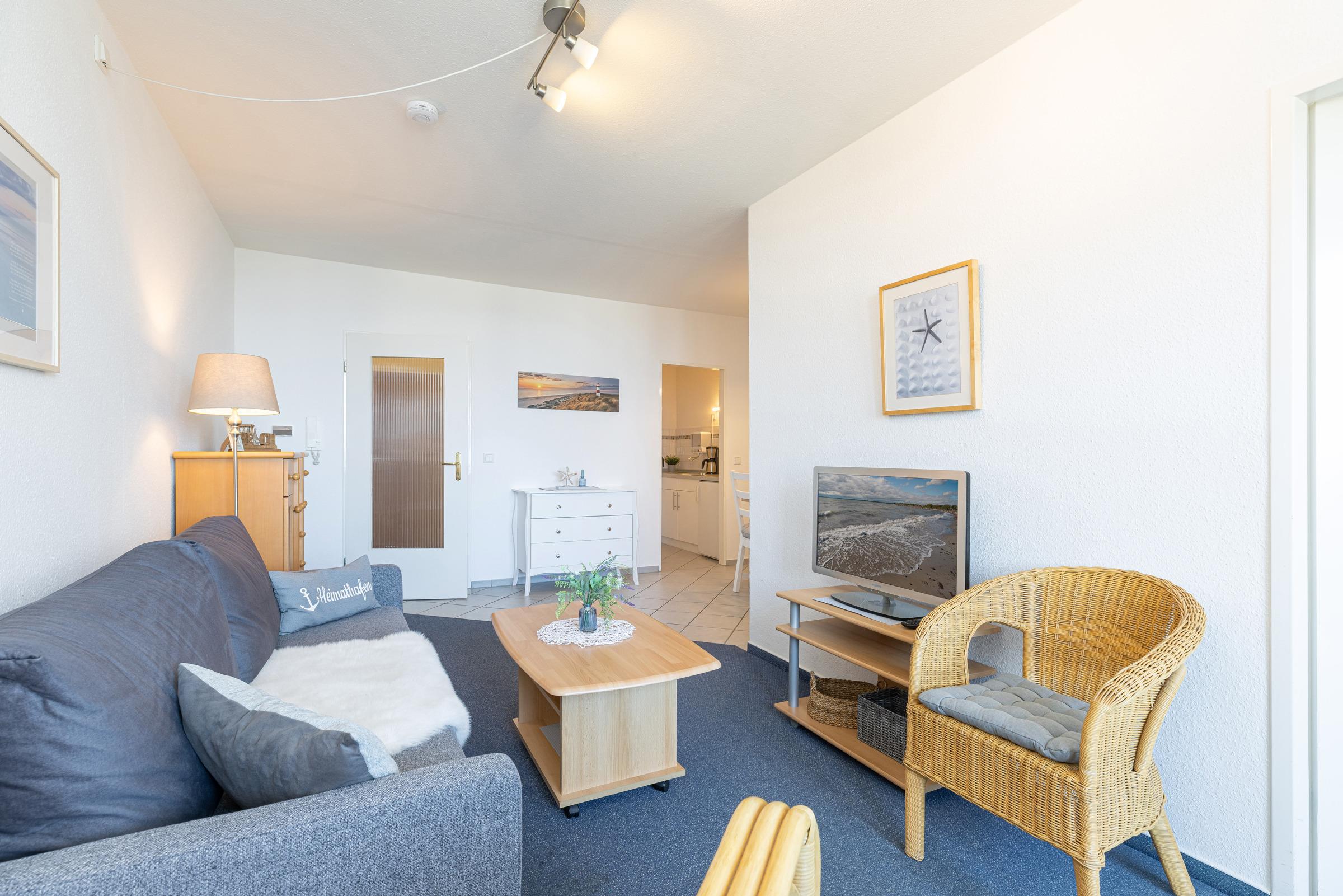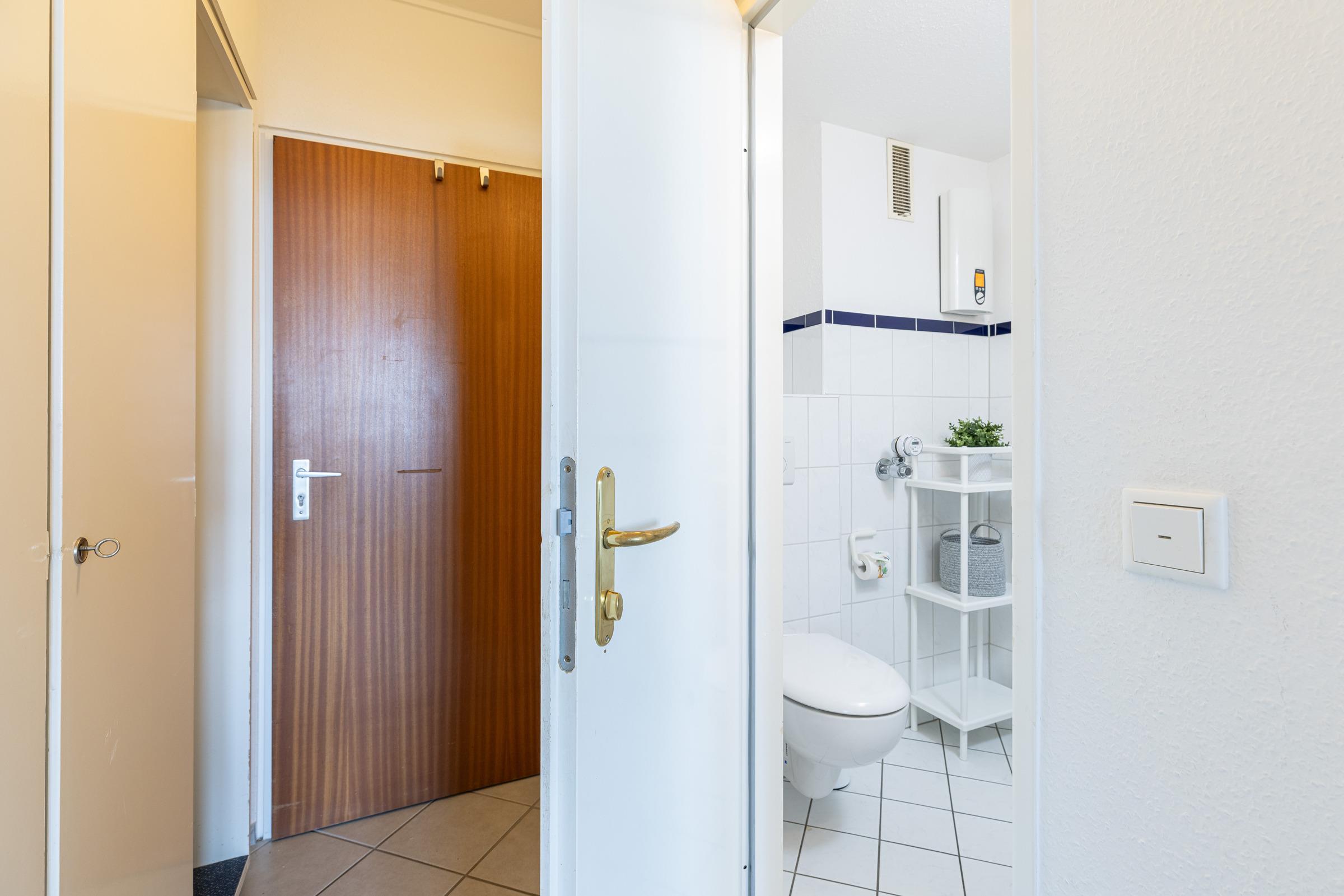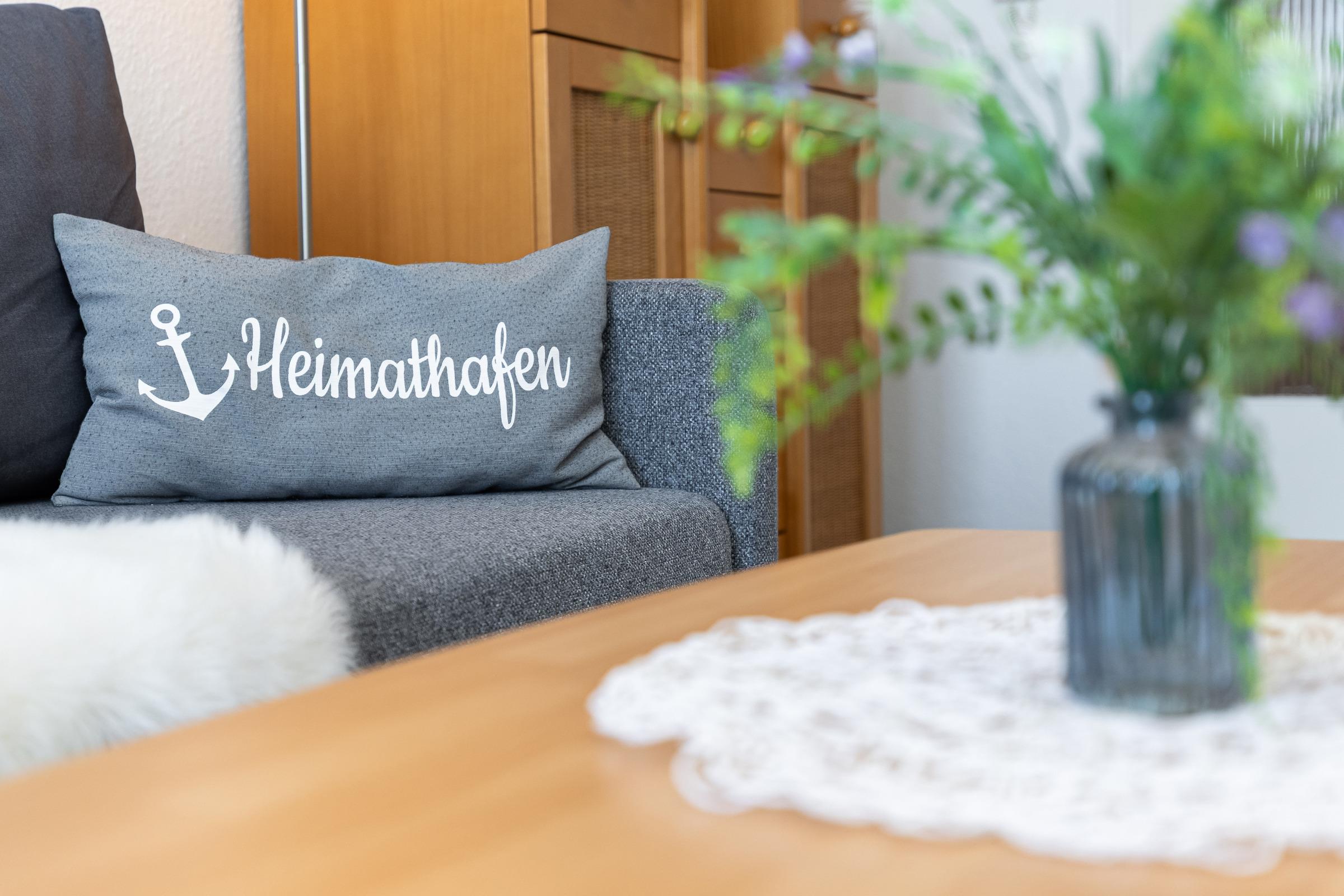 Die Wohnung teilt sich auf in eine Kochnische, ein Bad mit Dusche, einen Wohn-/Schlafraum mit Essecke und einen separaten Schlafraum mit 2 Einzelbetten. Vom Balkon aus können Sie zwischen den Häusern immer wieder einen Blick auf die Kieler Förde erhaschen.