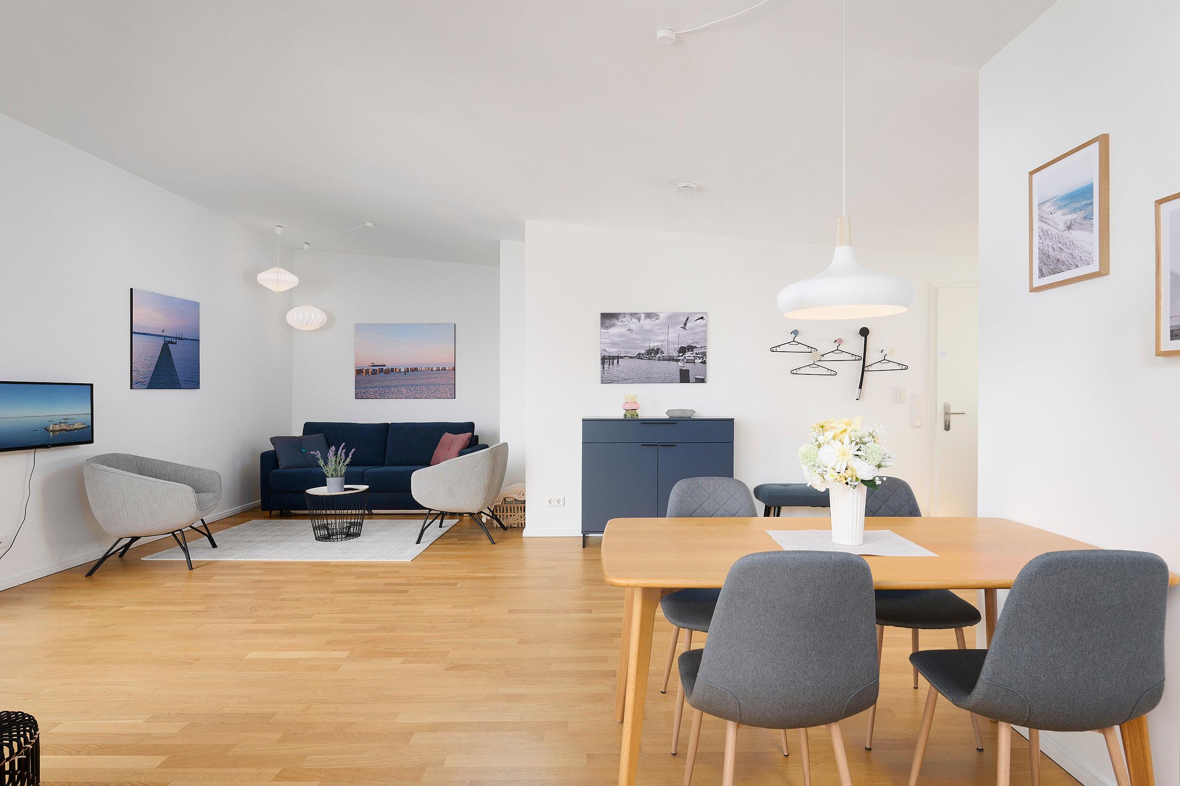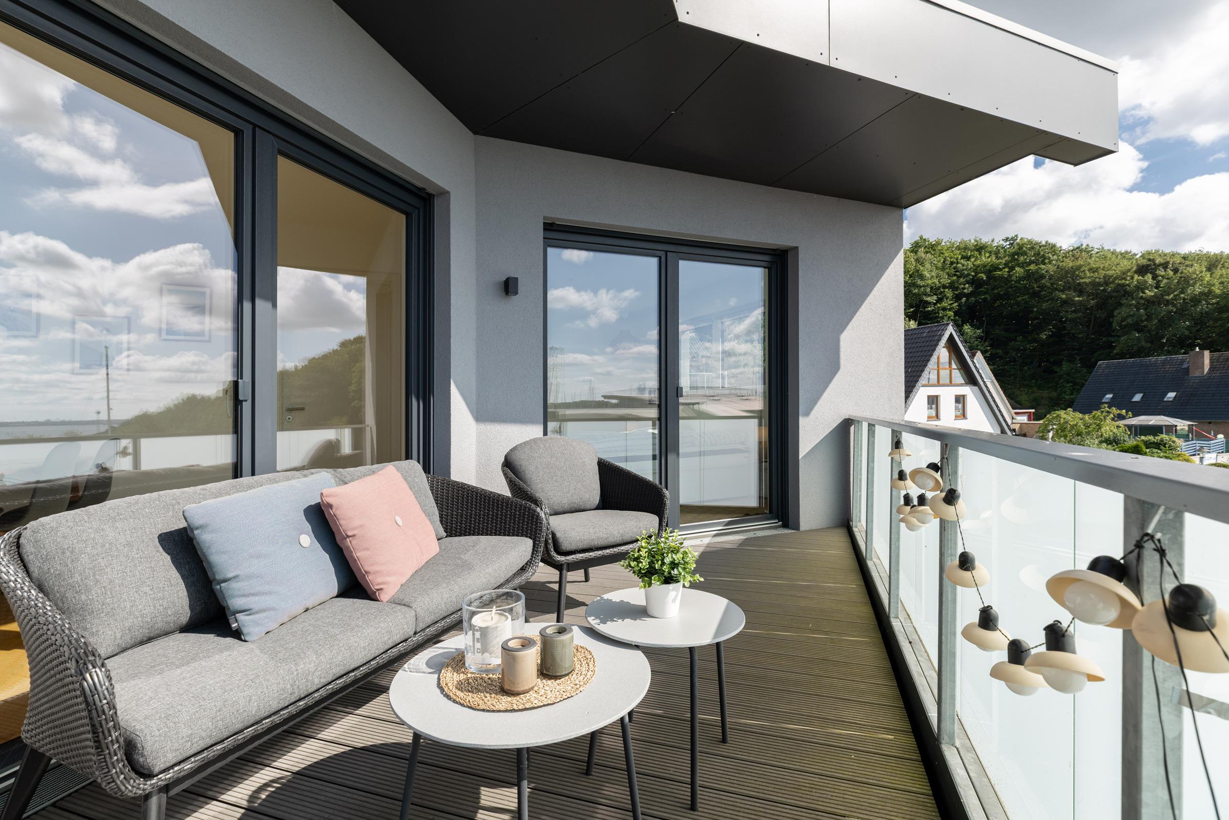 Schon beim Betreten des Seaside werden Sie dank der großen Balkonfensterfront mit einem weiten Fördeblick im großzügigen, kombinierten Wohn-Esszimmer mit offener Einbauküche in Ihrer Urlaubsunterkunft empfangen. Die Küche ist unter anderem mit einem Induktionsherd, Backofen, Kühlschrank mit TK-Fach, Espressomaschine und Kaffeebereiter für frischen Filterkaffee ausgestattet. Auf dem großen, teils überdachten Balkon, können Sie entspannte Zeit im Freien auf den gemütlichen Loungemöbeln verbringen, dabei den unvergleichlichen Blick auf die Kieler Förde sowie traumhafte Sonnenauf- und untergänge genießen.