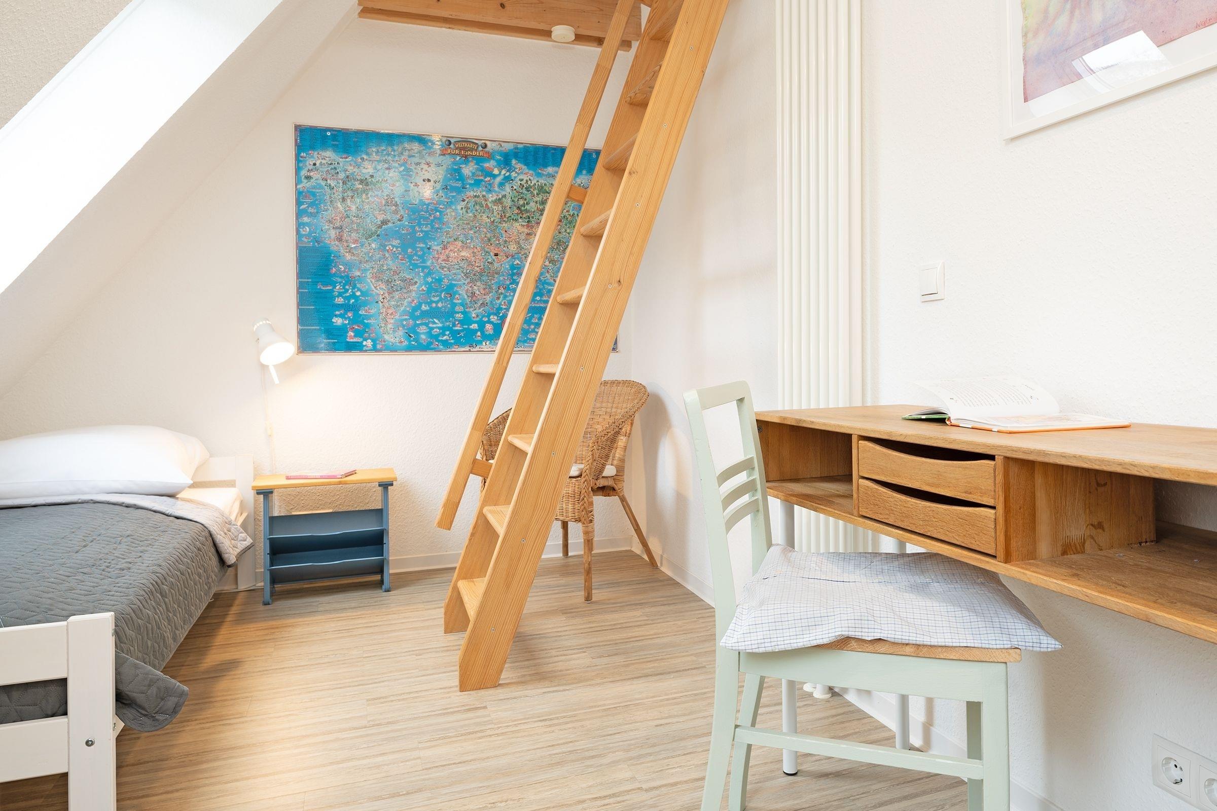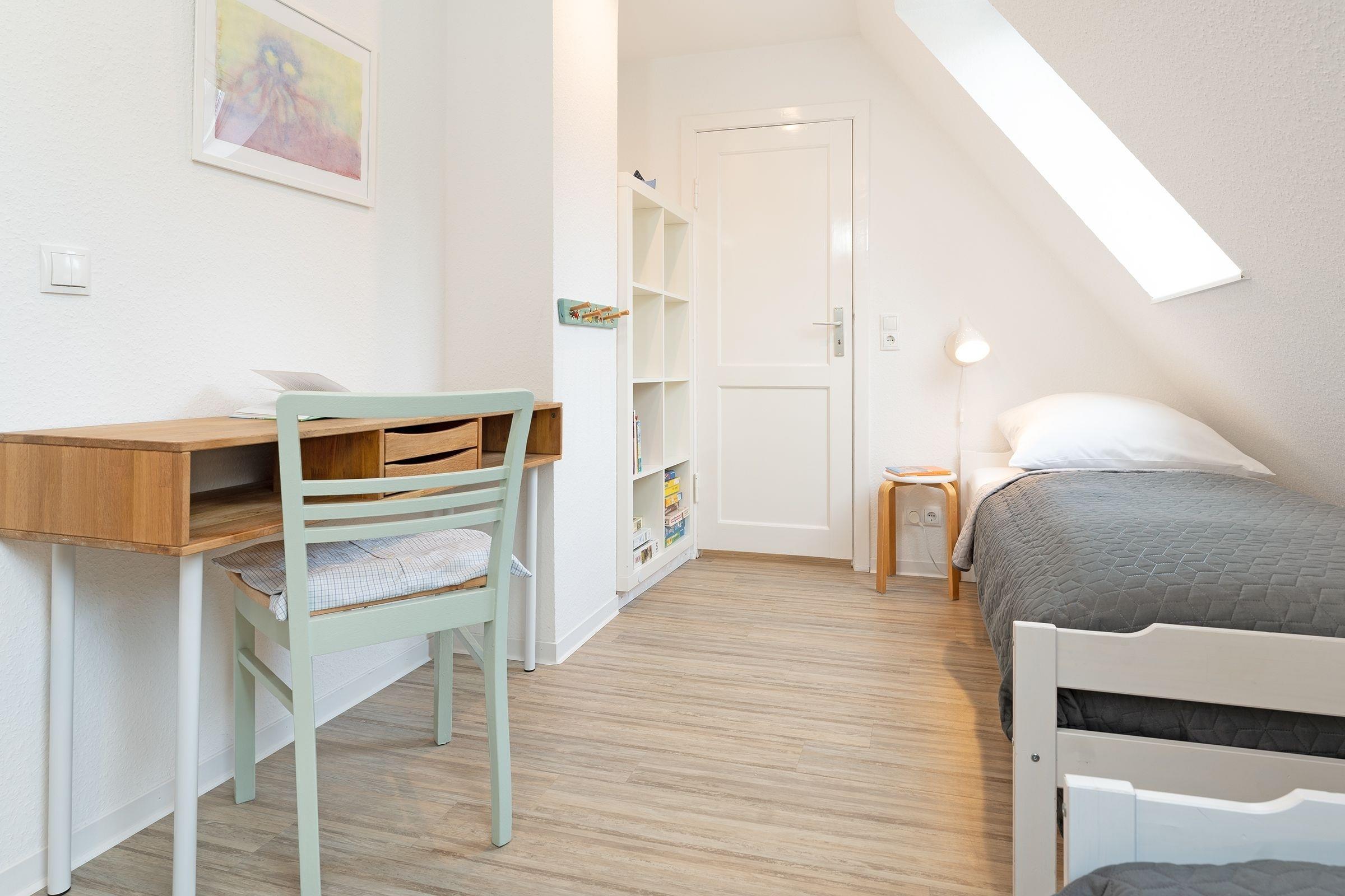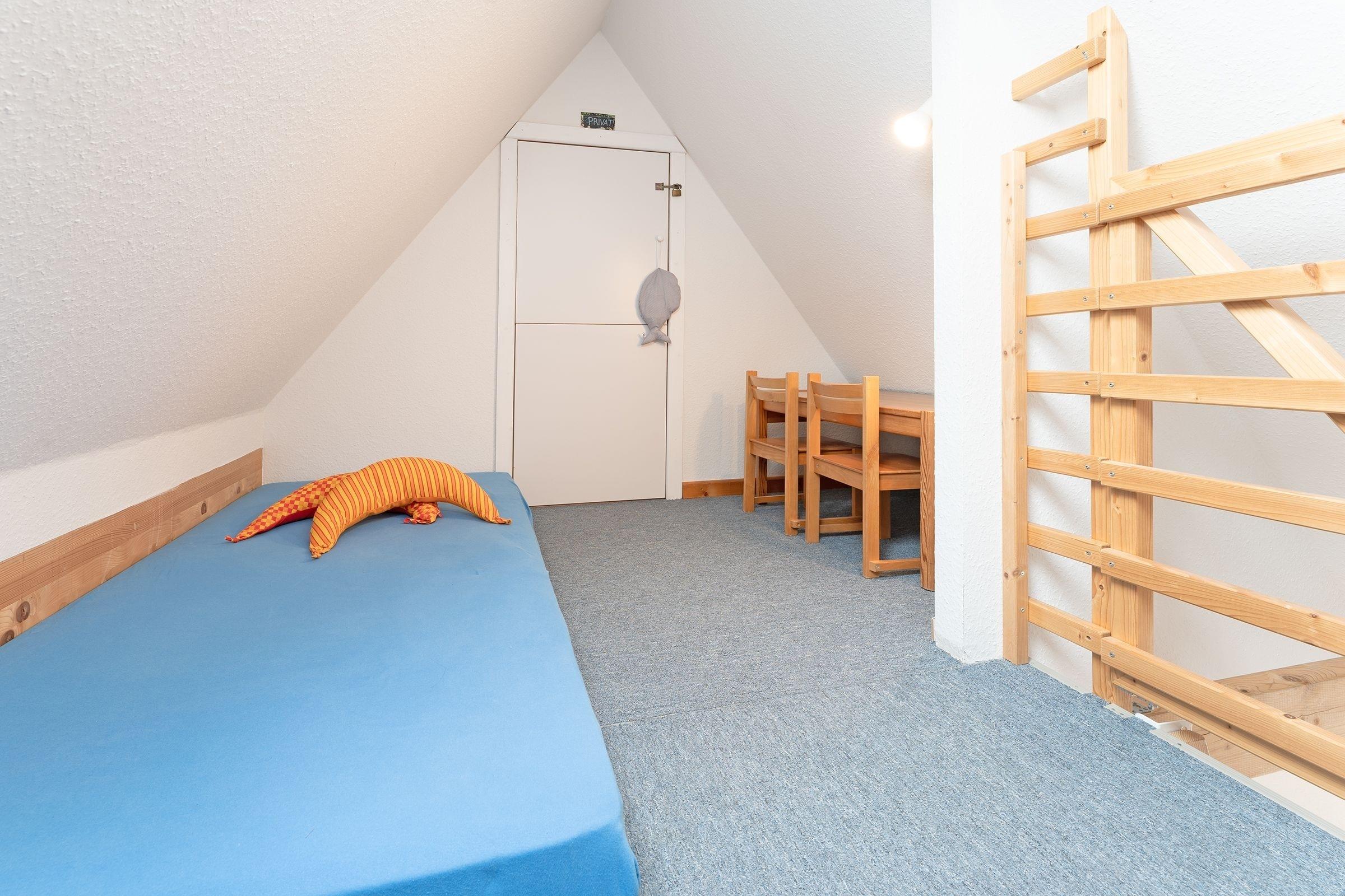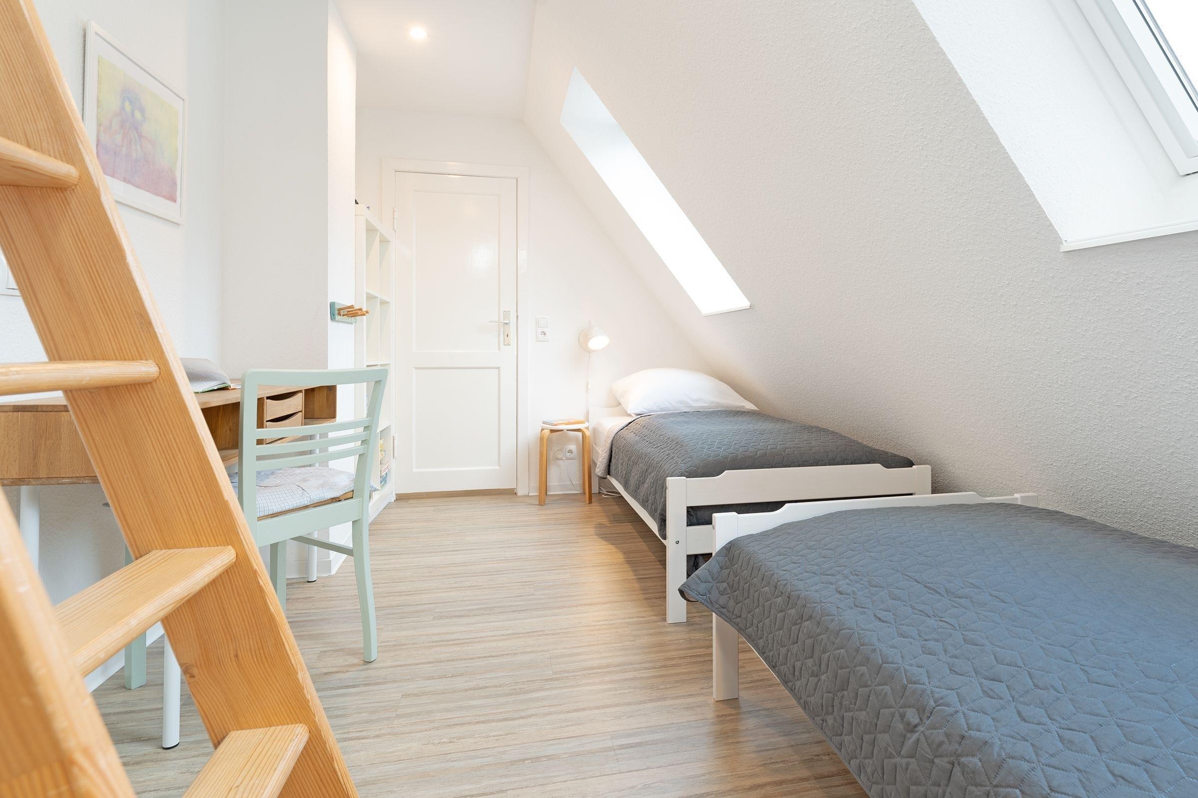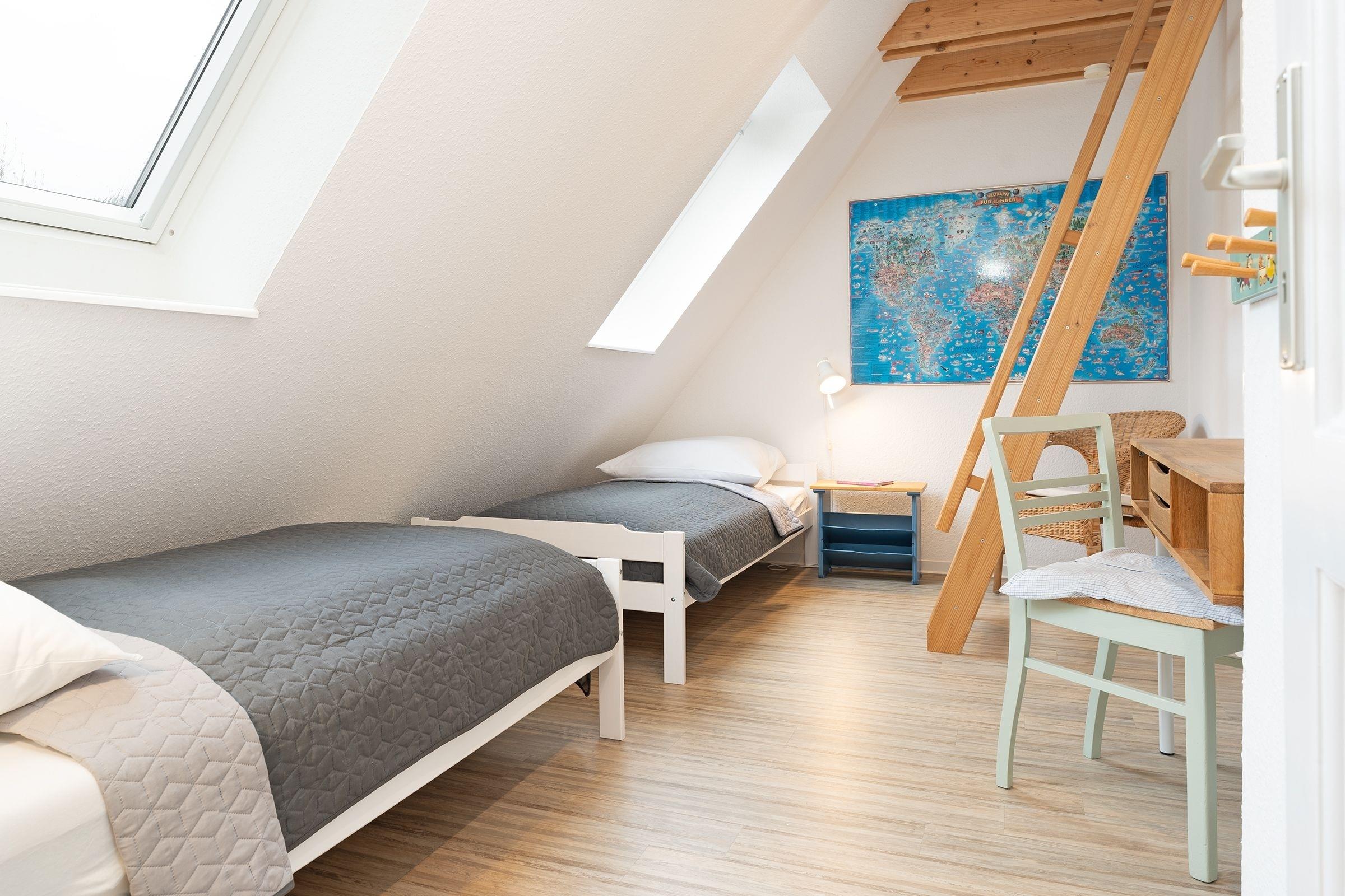 Schlafzimmer 1 (DG): 2 Einzelbetten (je 90x200 cm), Kleiderschrank, Verdunkelung: Rollo, Platz für ein Babybett vorhanden, auf der Empore: Schlafsessel und Schreibtisch