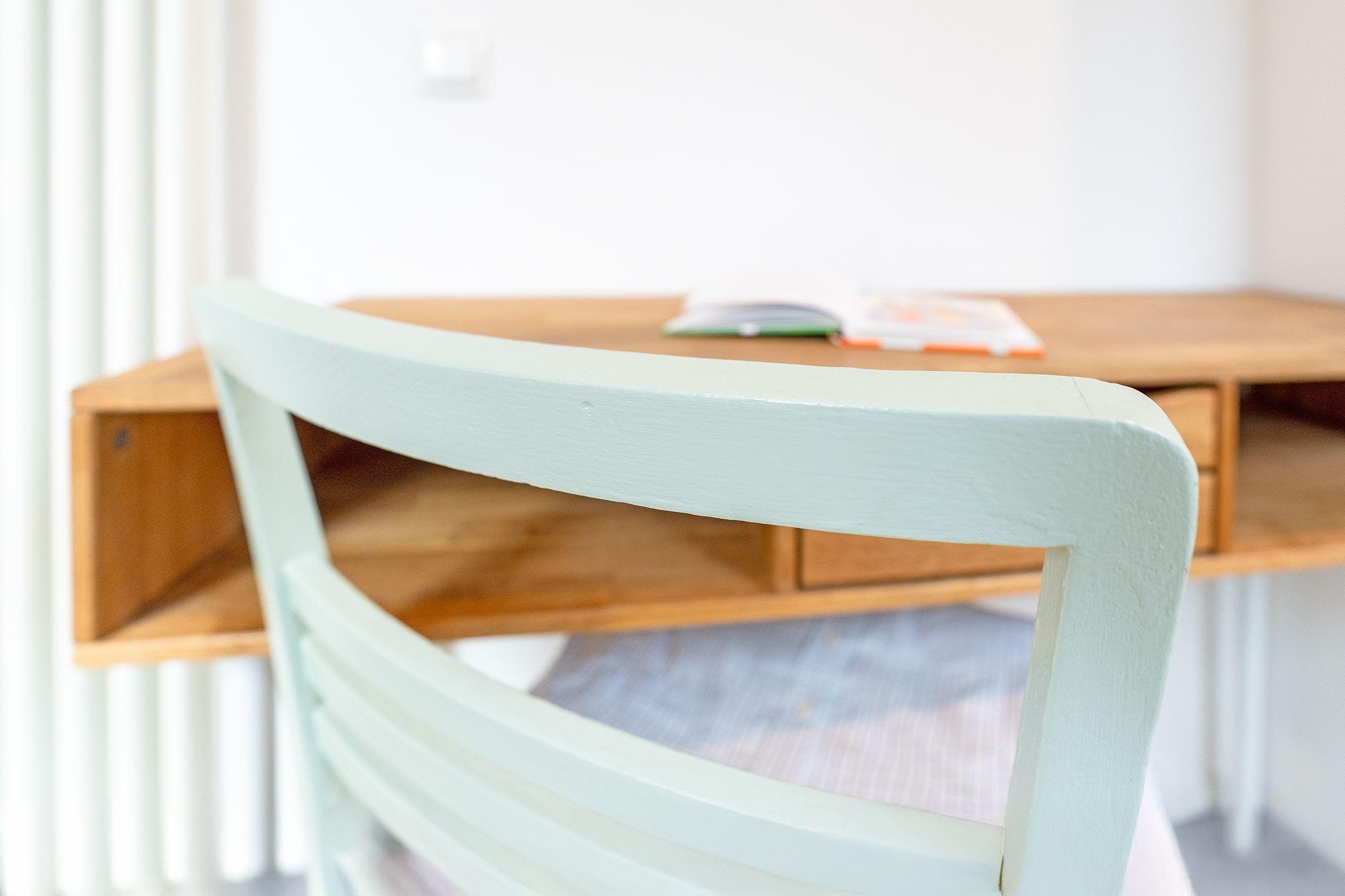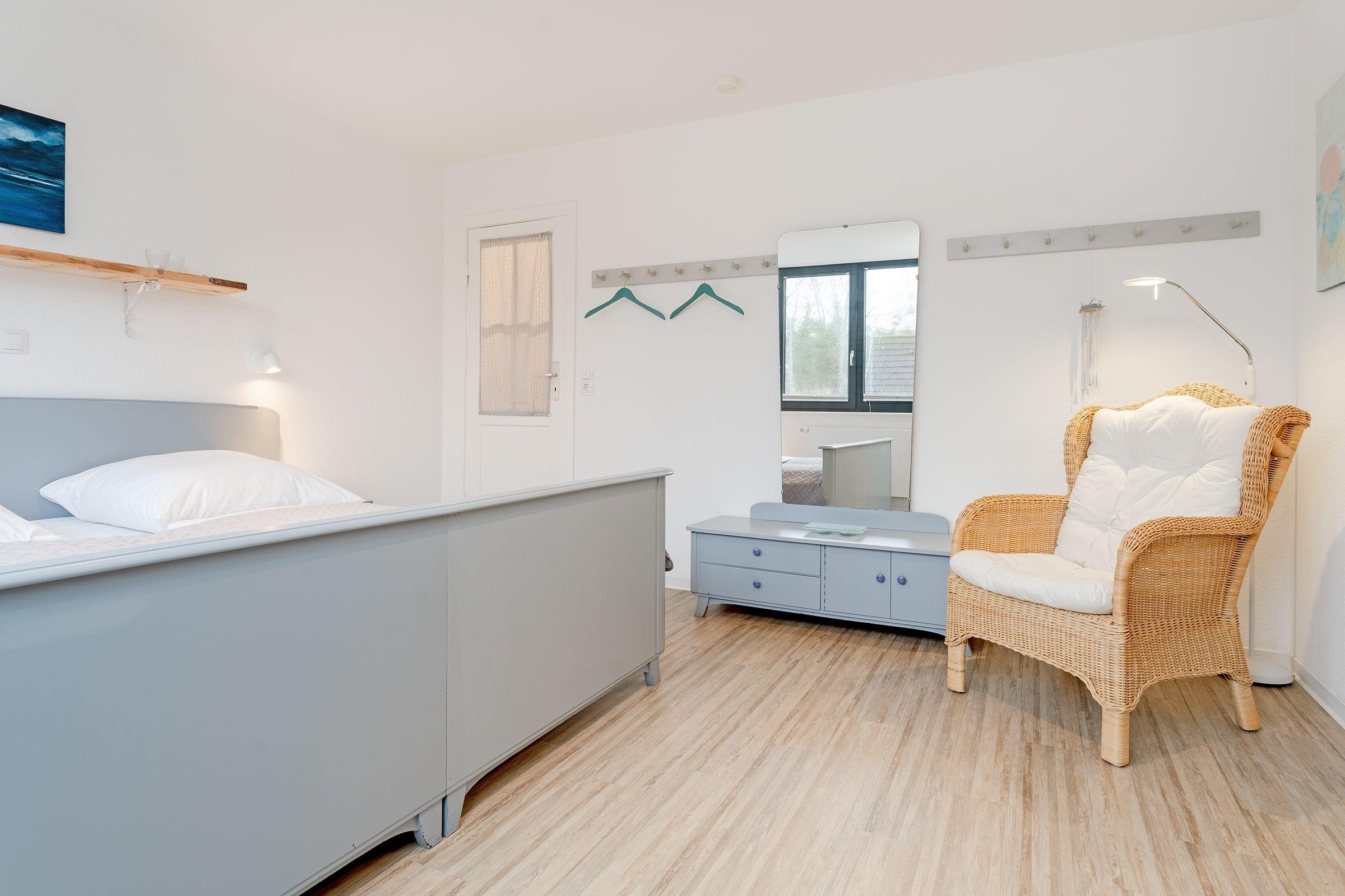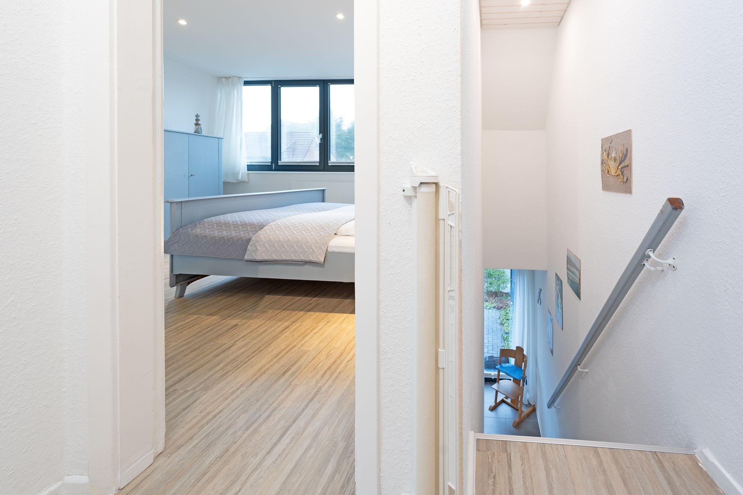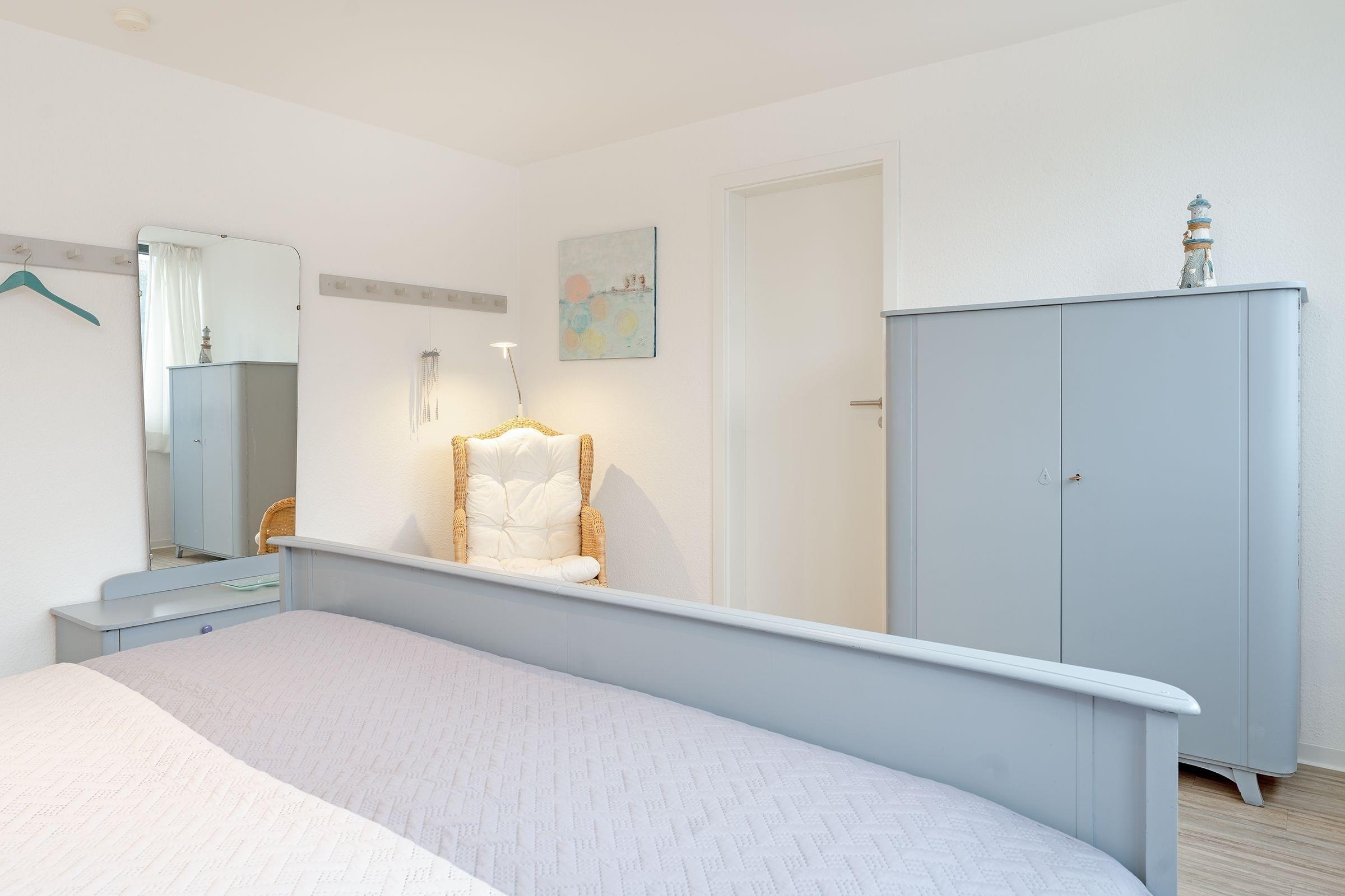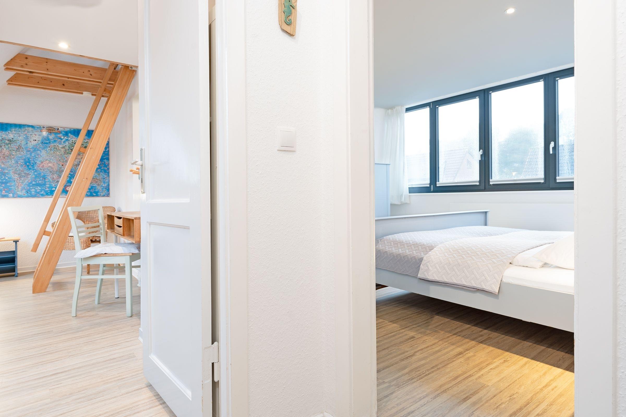 Schlafzimmer 1 (DG): 2 Einzelbetten (je 90x200 cm), Kleiderschrank, Verdunkelung: Rollo, Platz für ein Babybett vorhanden, auf der Empore: Schlafsessel und Schreibtisch
