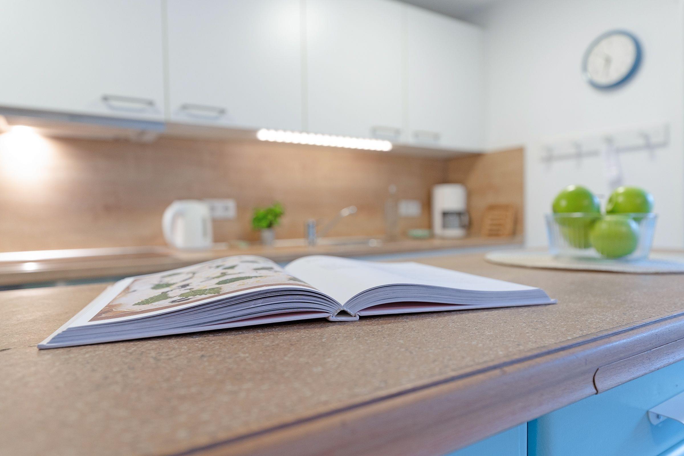 Die offene Küche ist voll ausgestattet mit Ceranherd, Backofen, Mikrowelle, Kühlschrank, Kaffeemaschine, Toaster und Spülmaschine. Der Essbereich bietet ausreichend Platz für gemeinsame Mahlzeiten.