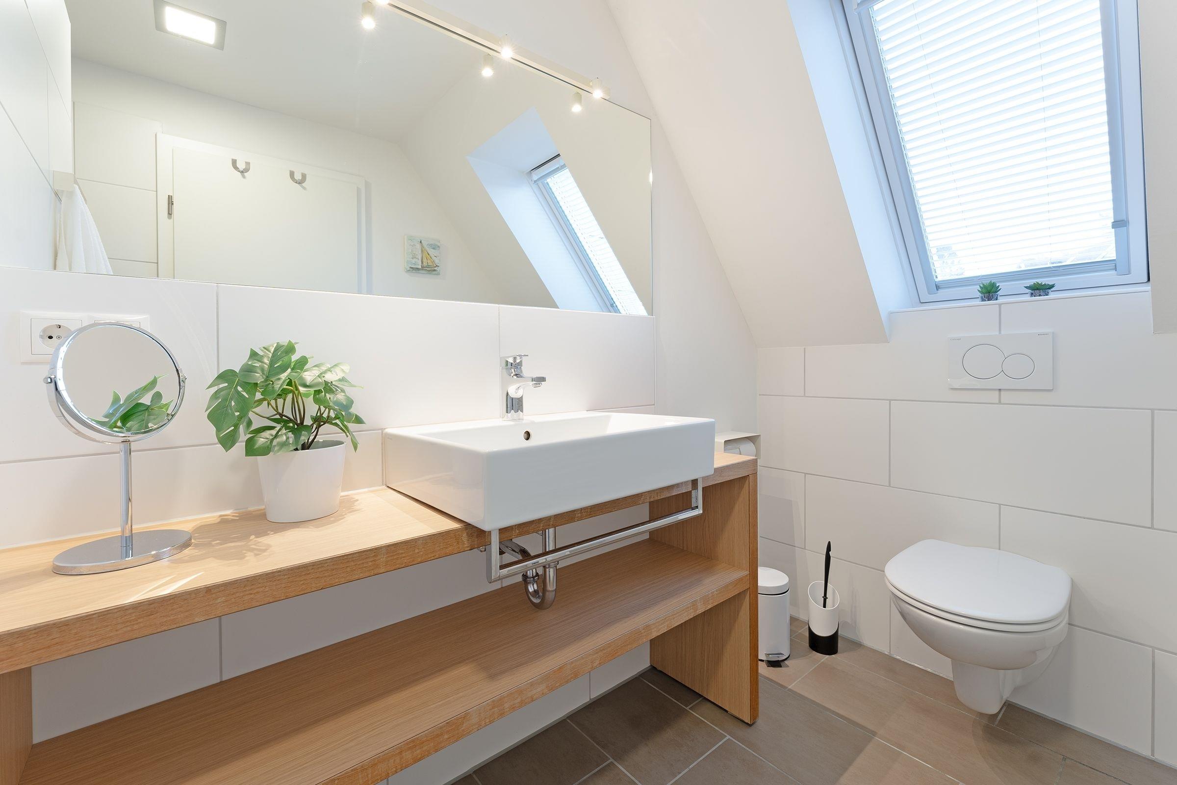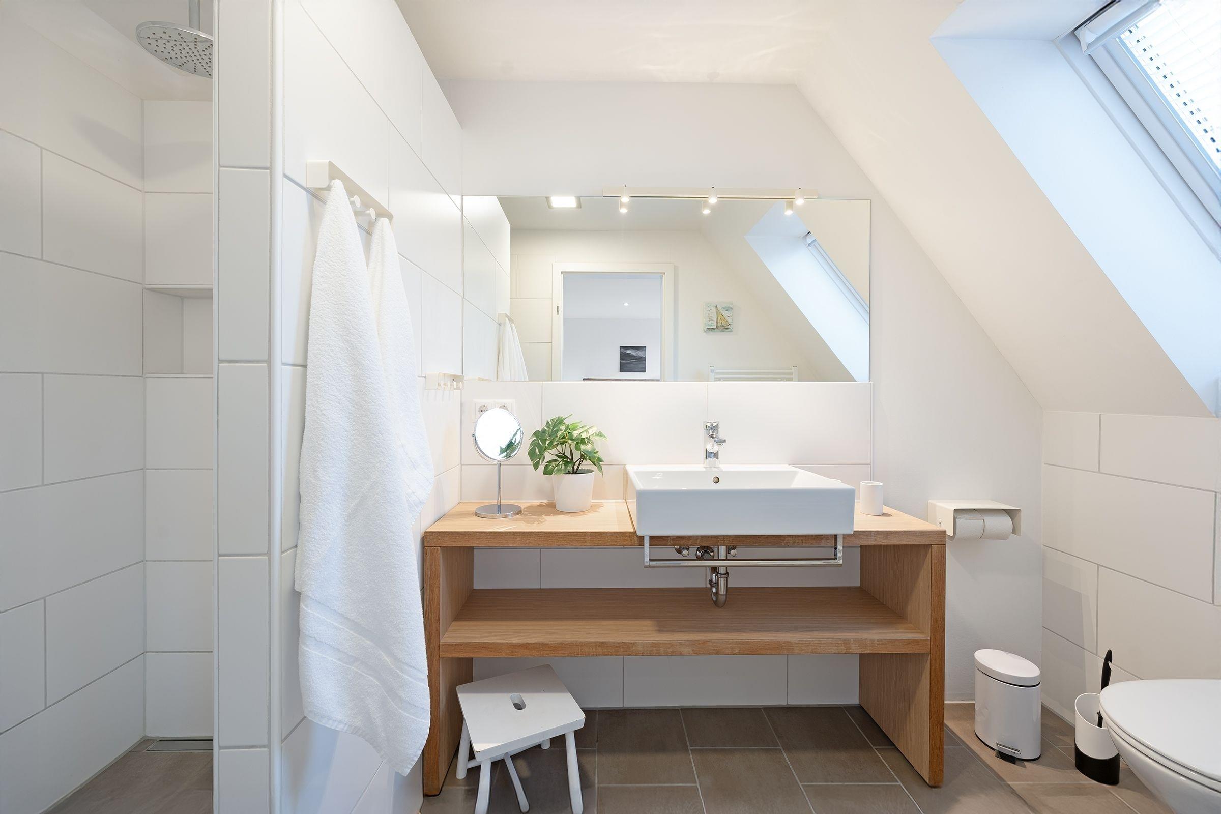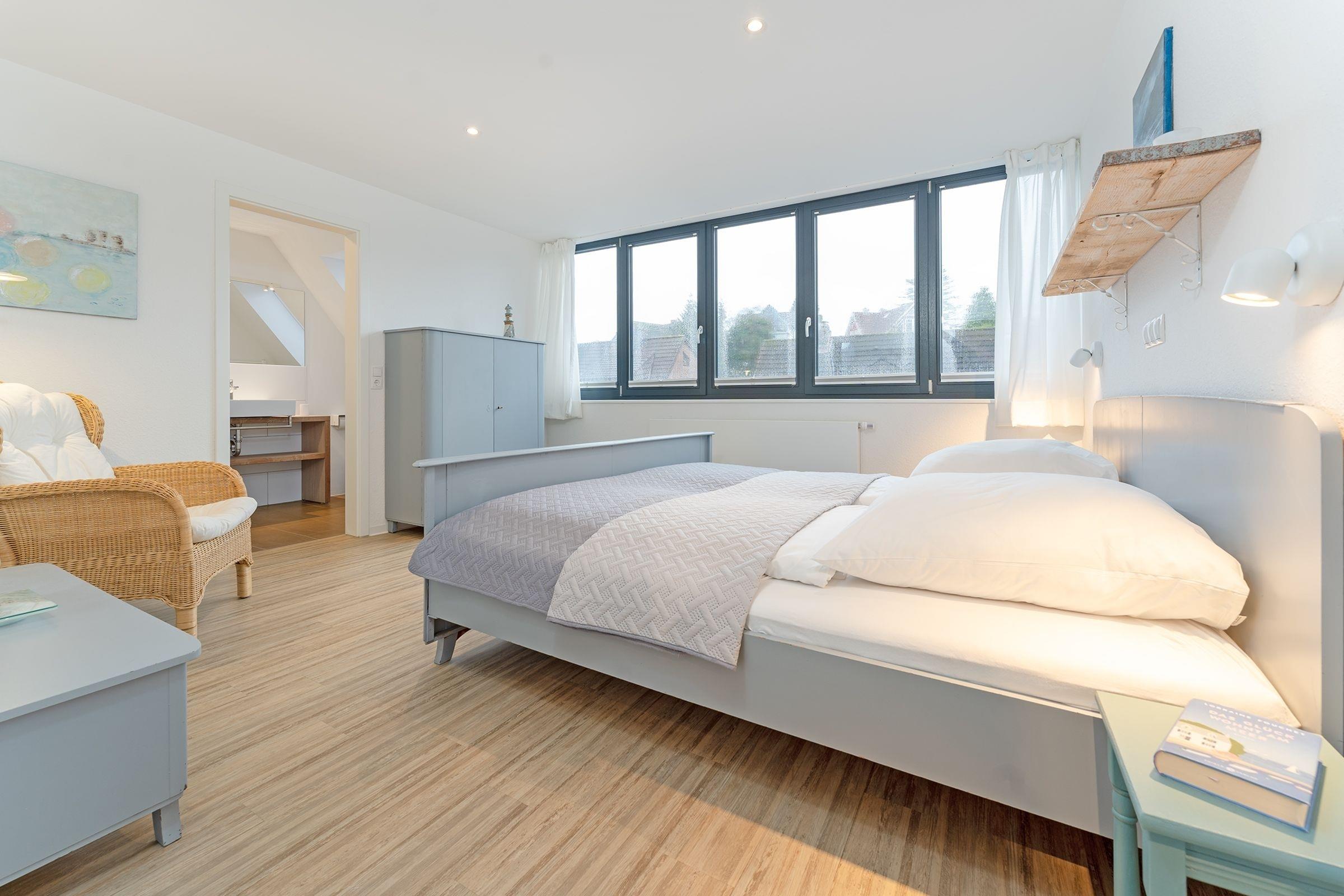 Schlafzimmer 2 (DG): 1 Doppelbett (2x 90x200 cm), Kleiderschrank, Verdunkelung: abdunkelnde Plissees, Bad en suite, Platz für ein Babybett vorhanden
