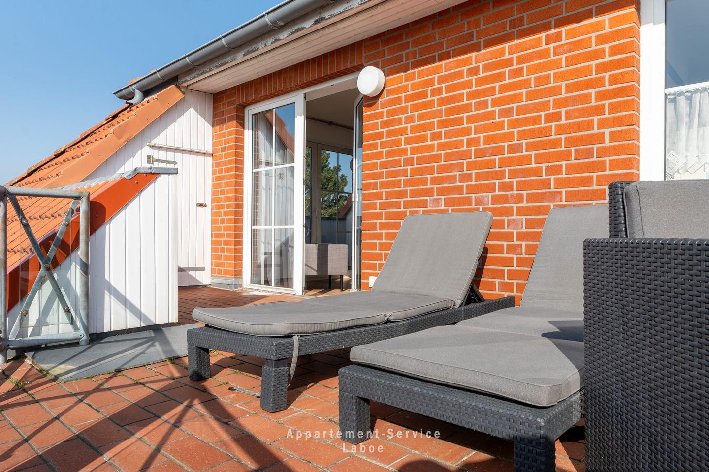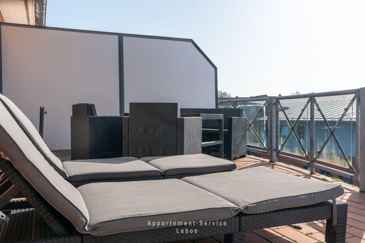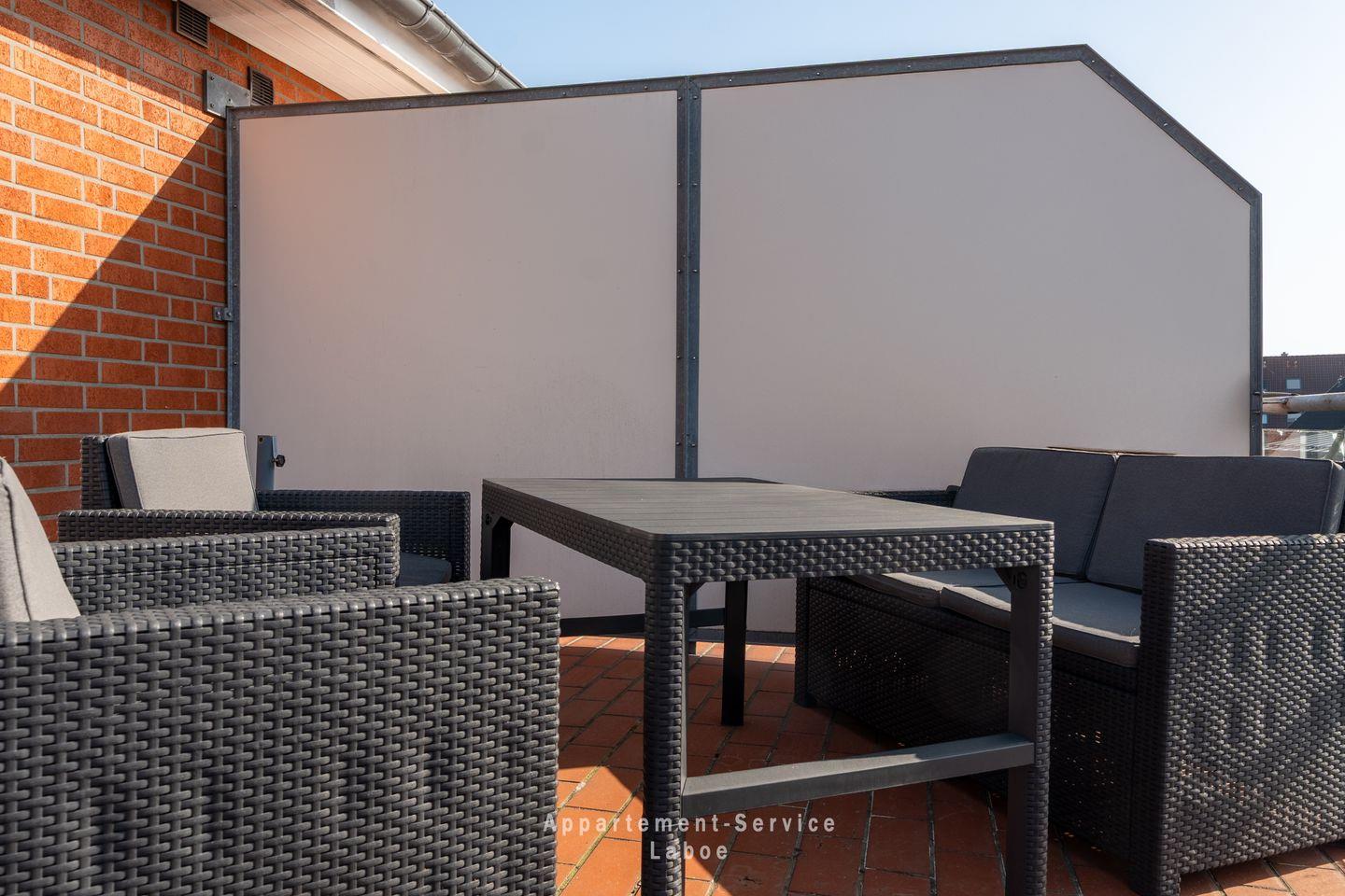 Die großzügige, möblierte Dachterrasse ist der perfekte Ort, um die frische Ostseeluft zu genießen. Hier kannst du den Tag mit einem Kaffee in der Morgensonne beginnen oder abends bei einem Glas Wein den Sonnenuntergang erleben.