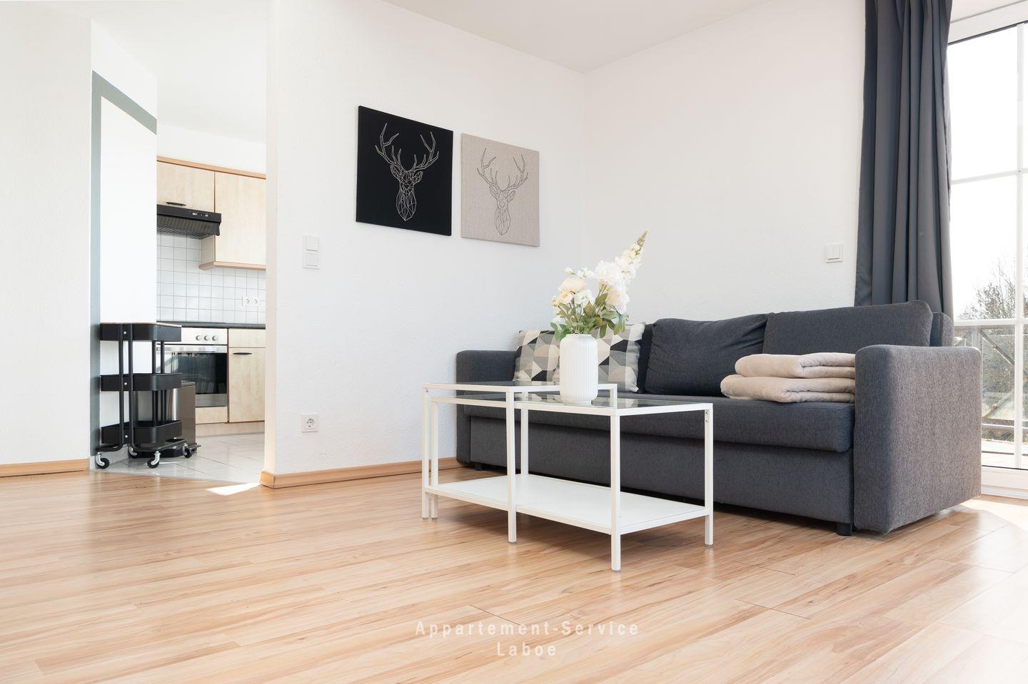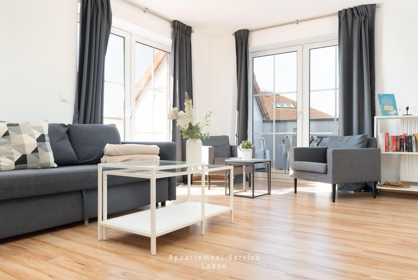 Das kombinierte Wohn- und Schlafzimmer ist lichtdurchflutet und lädt mit seiner gemütlichen Sitzgruppe zum Verweilen ein. Die Doppelbettcouch ist perfekt, um am Abend im Handumdrehen einen weiteren Schlafplatz zu schaffen. Mit TV, Stereoanlage und kostenfreiem WLAN bist du bestens ausgestattet, um zu entspannen, Musik zu hören oder die schönsten Urlaubserlebnisse mit Freunden und Familie zu teilen.