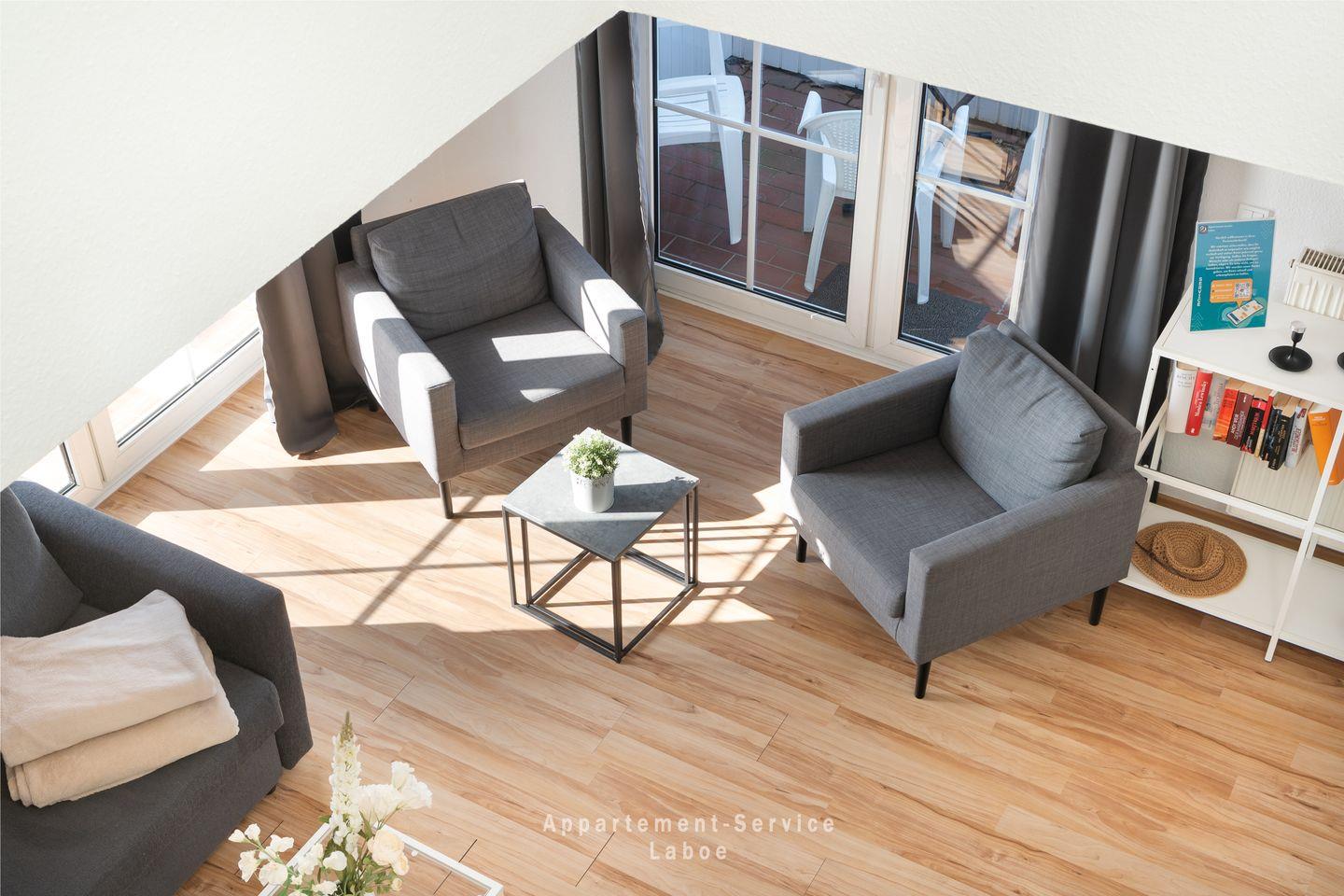 Ein besonderes Highlight dieser Wohnung ist die offene Galerie, die dir einen separaten Schlafbereich mit einem komfortablen Doppelbett bietet. Der kleine Flur mit Garderobe sorgt dafür, dass deine Sachen ordentlich verstaut sind und das moderne Badezimmer mit Dusche und WC bietet dir den Komfort, den du dir für deinen Urlaub wünschst.