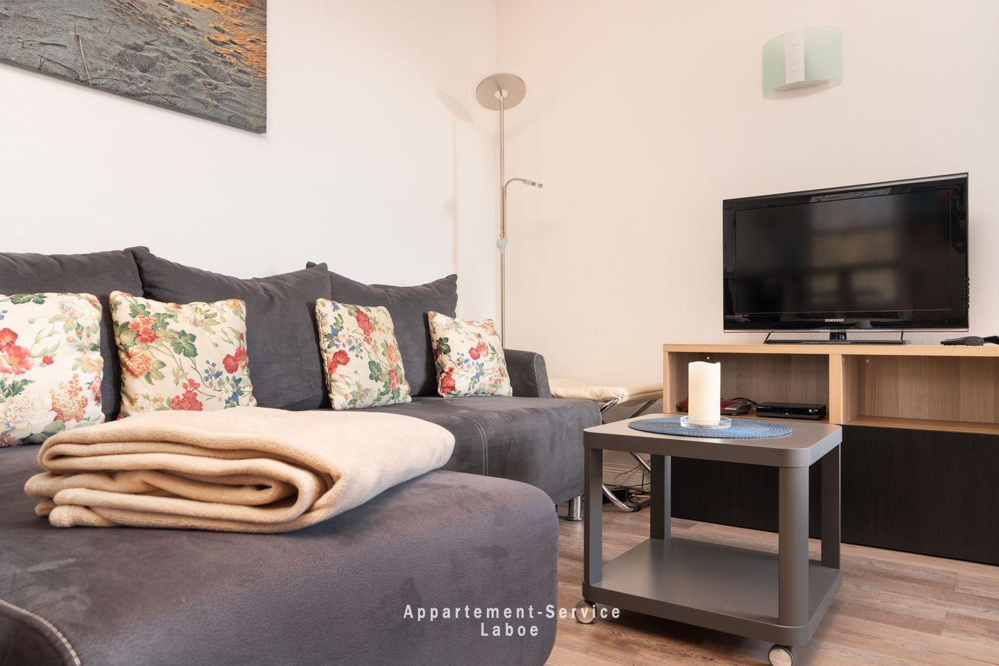 Das lichtdurchflutete Wohnzimmer ist offen gestaltet und lädt mit einer bequemen Sitzecke zum Entspannen ein. Das Klappsofa lässt sich bei Bedarf zu einem zusätzlichen Schlafplatz verwandeln. Im Schlafbereich erwartet dich ein großes Doppelbett für erholsame Nächte nach einem Tag am Strand oder einem Bummel entlang der Promenade.