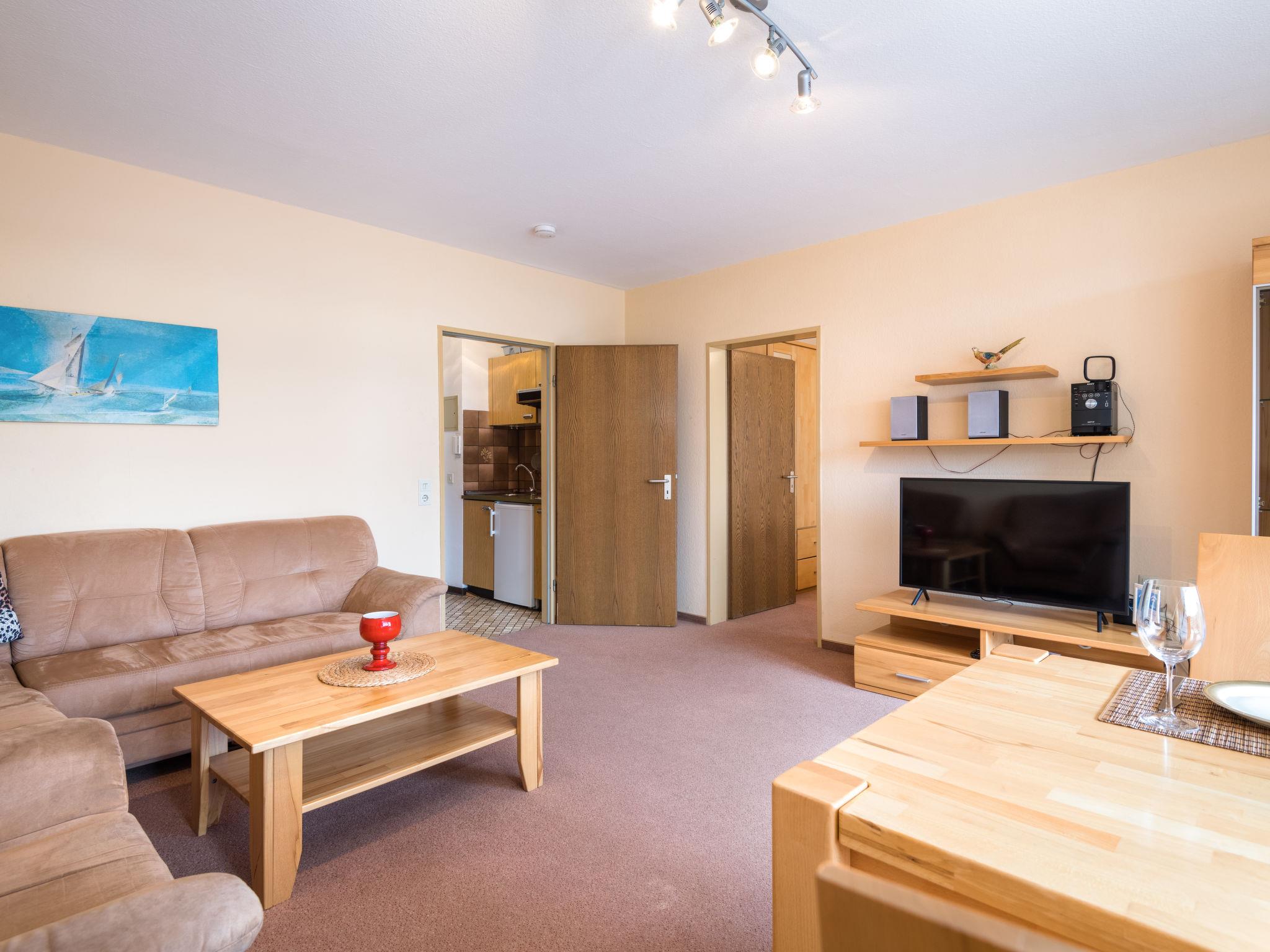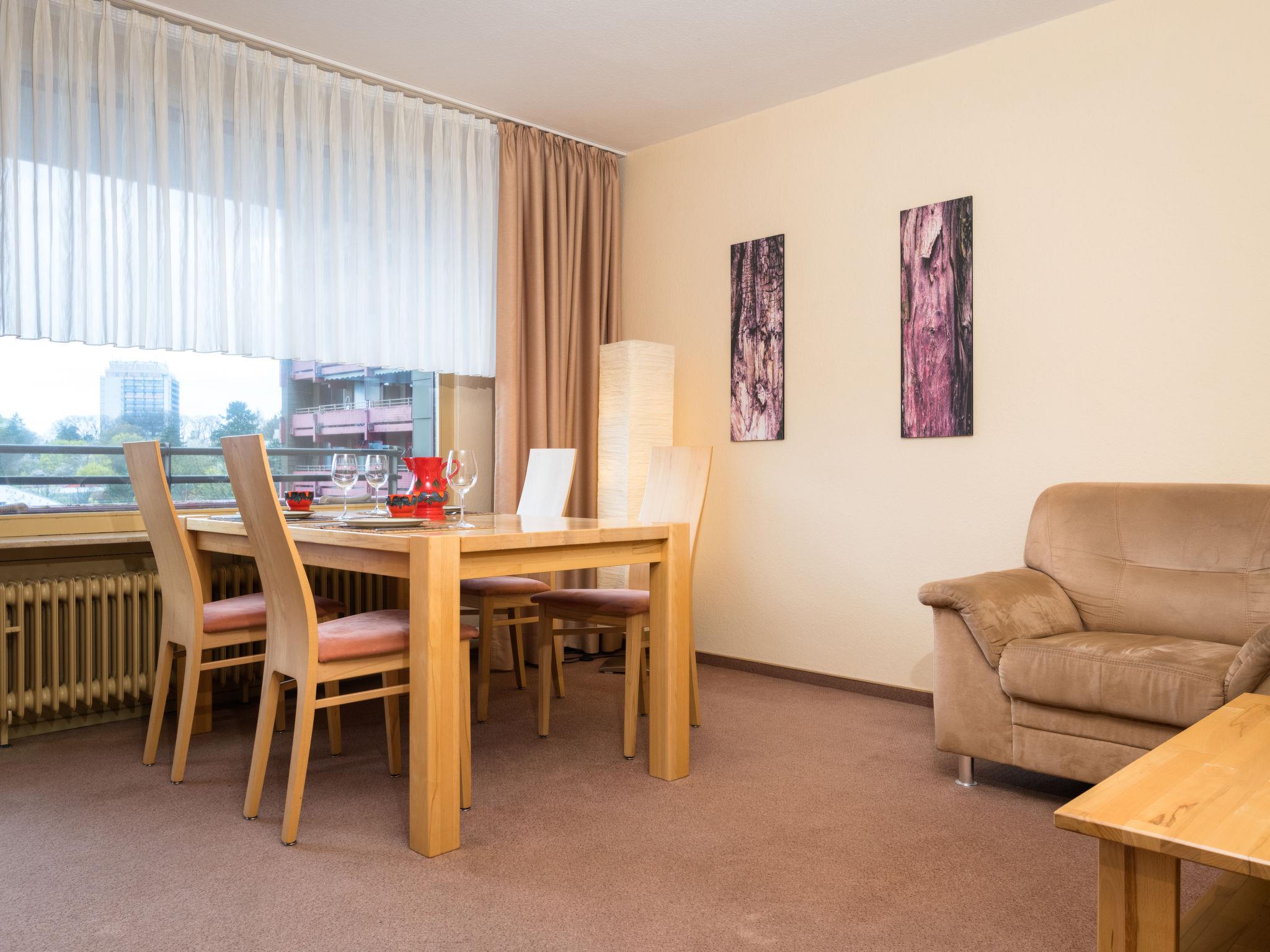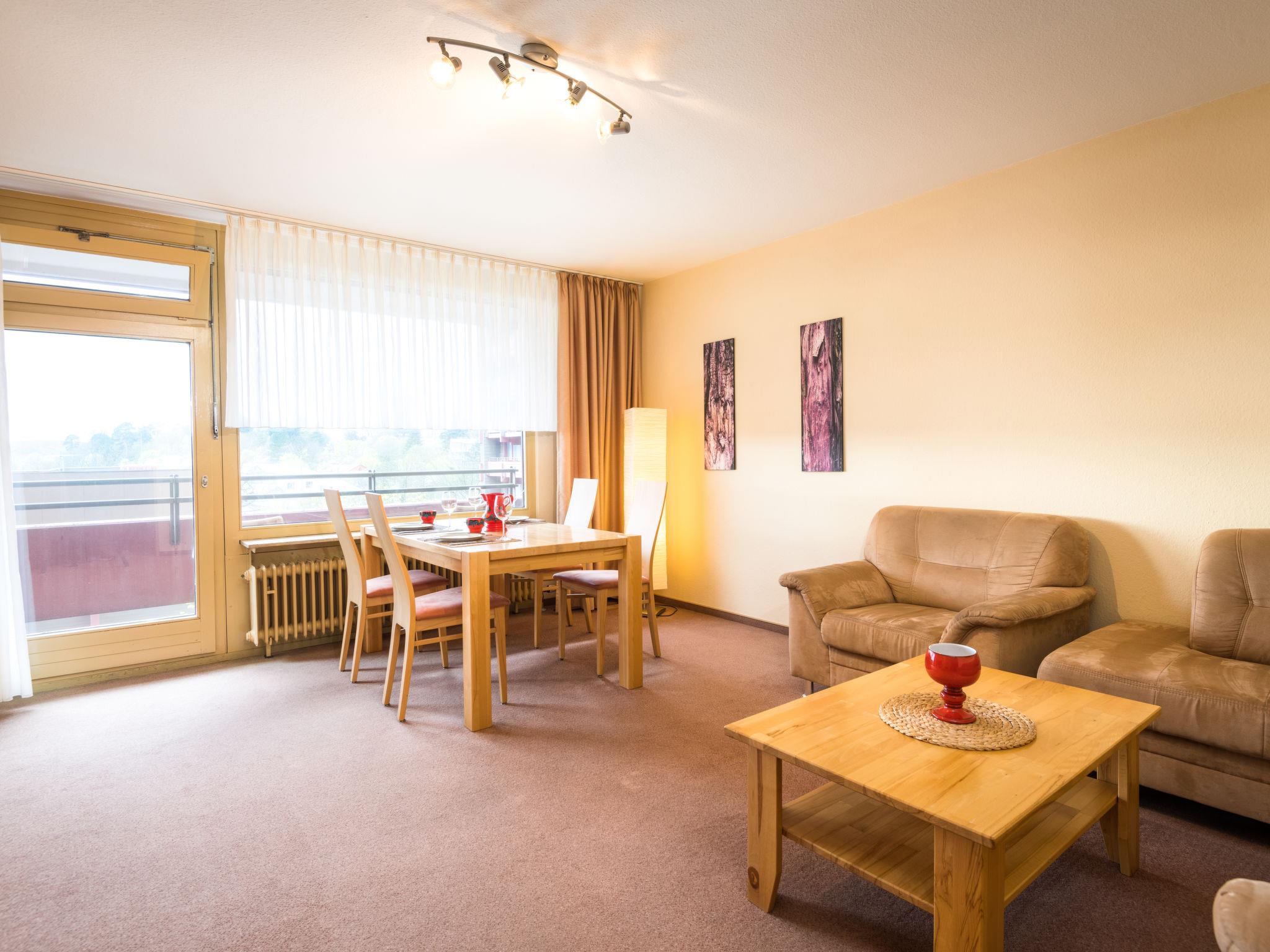 "Birke (A504)", 2-room apartment 52 m2 on 5th floor, west facing position. Living/dining room with 1 sofabed (120 cm, length 175 cm), satellite TV (flat screen). Exit to the balcony. 1 double bedroom with 1 double bed (2 x 100 cm, length 200 cm). Kitchenette in the entrance (2 hot plates, toaster, kettle, electric coffee machine). Bath/shower/WC. Balcony furniture. Facilities: Internet (WiFi, free). Please note: fridge without freezer, non-smokers only. Maximum 1 pet/ dog allowed. Smoke alarm.