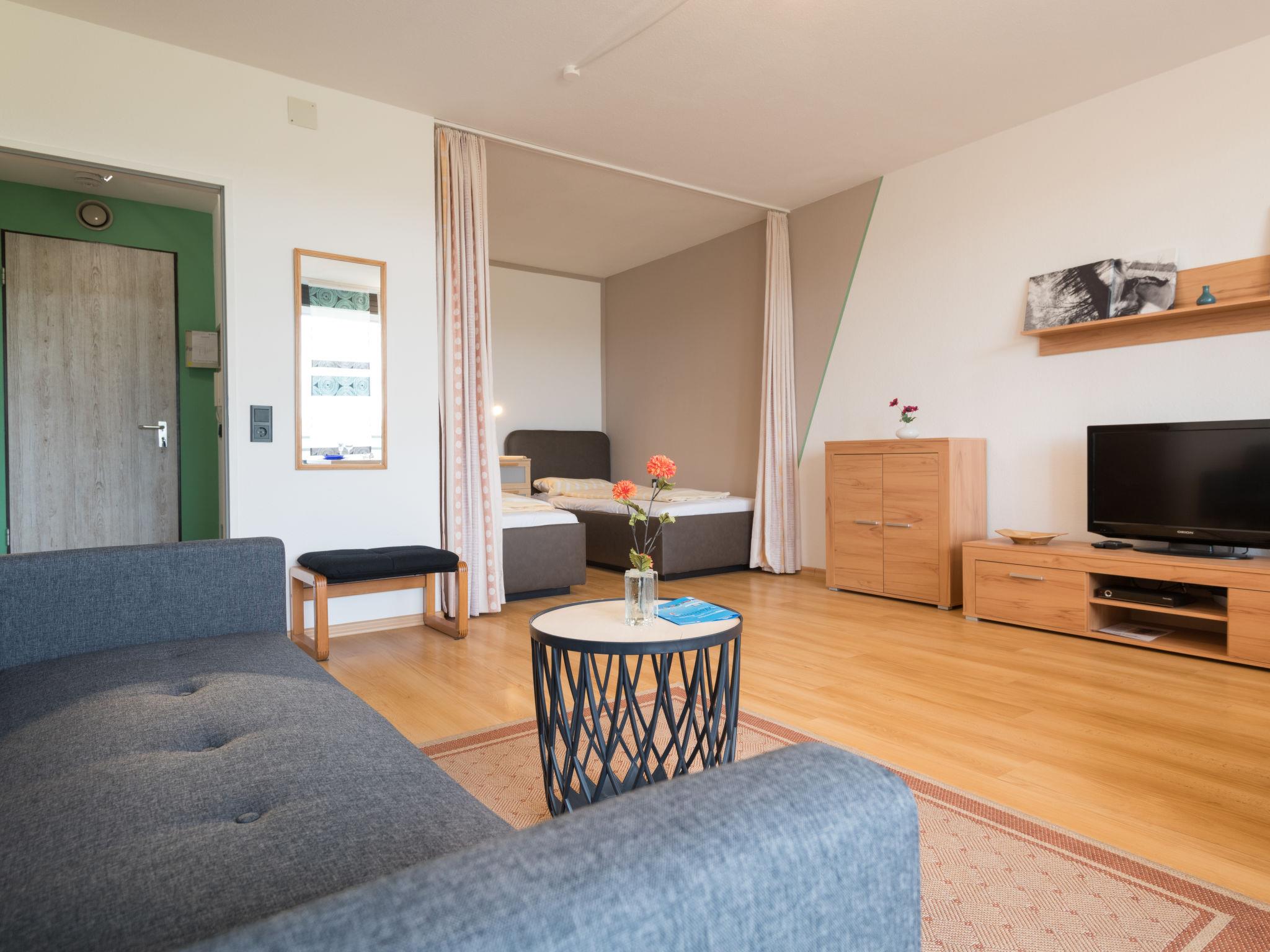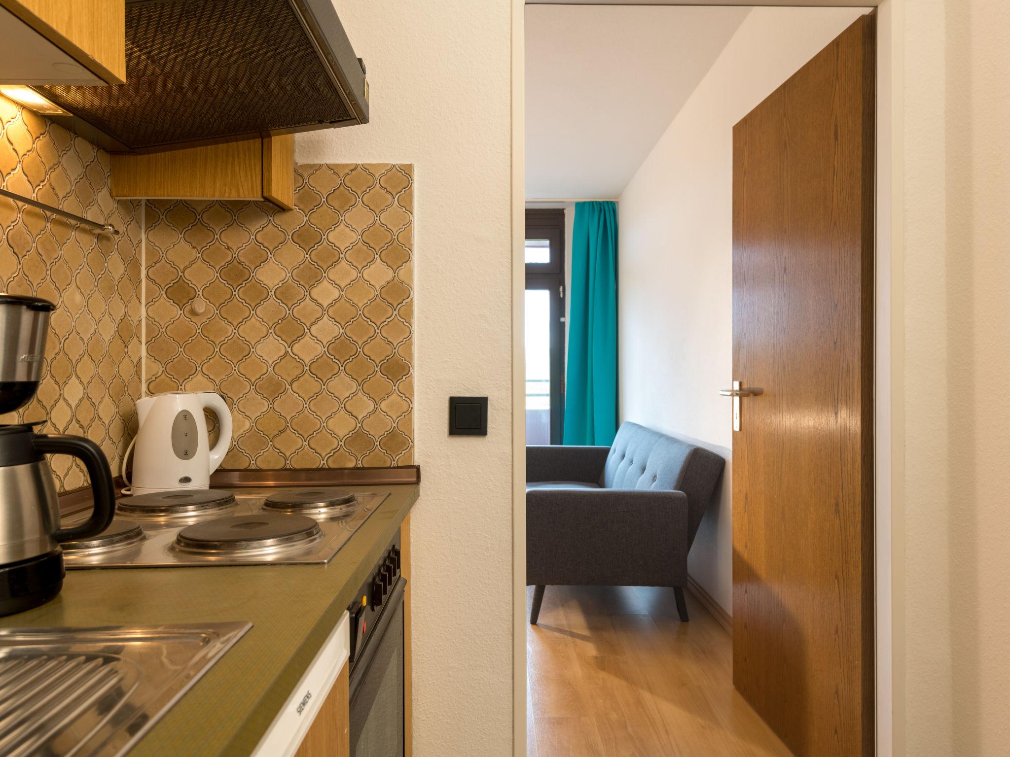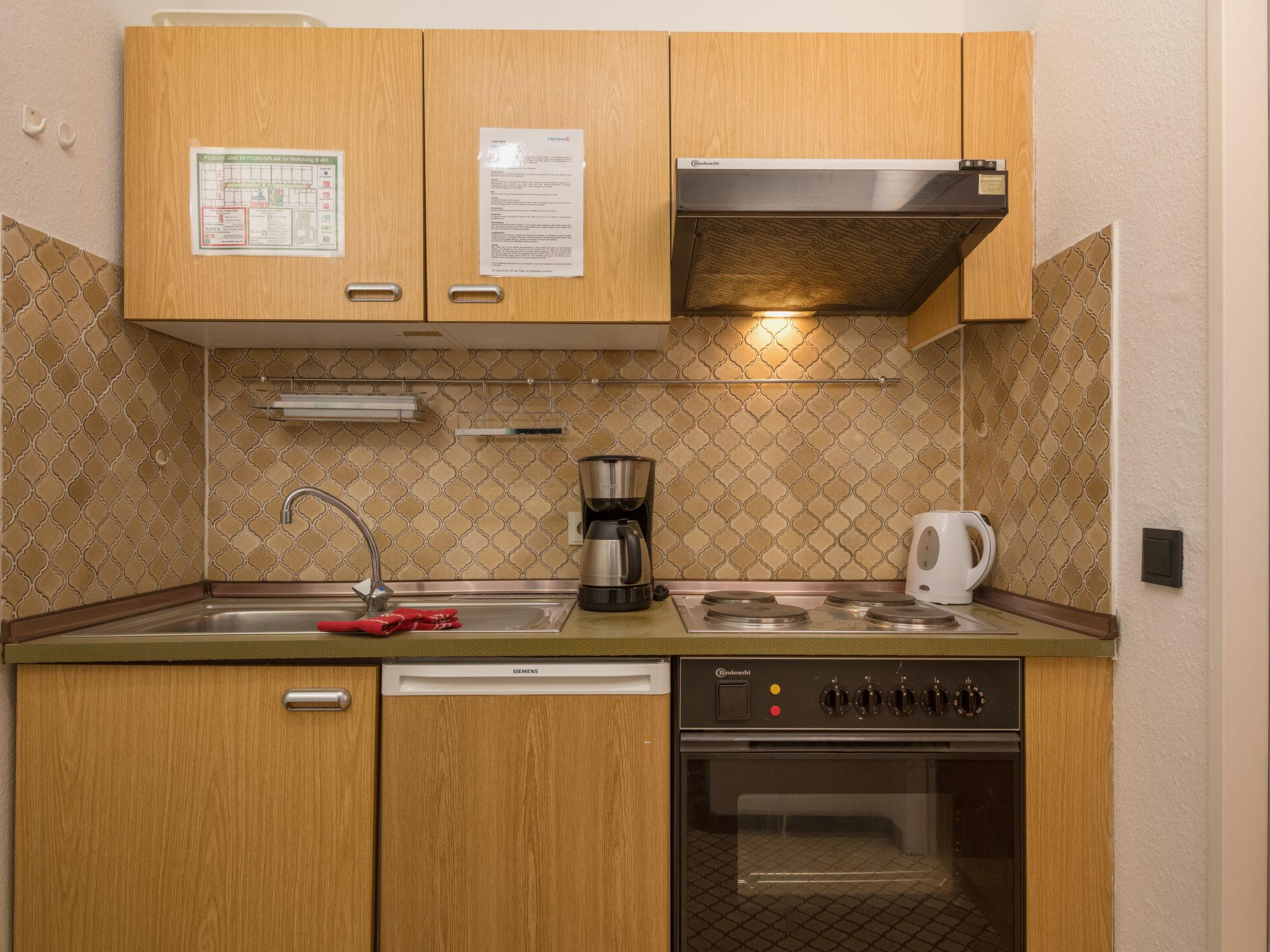 "Auszeit (B403)", 1-room apartment 38 m2 on 4th floor, east facing position. Object suitable for 2 adults + 1 child. Living/dining room with satellite TV (flat screen), CD-player. Exit to the balcony. Alcove with 2 beds (90 cm, length 200 cm). Kitchenette in the entrance (4 hot plates, oven, toaster, kettle, electric coffee machine). Bath/shower/WC. Balcony furniture. Beautiful view of the countryside. Facilities: Internet (WiFi, free). Please note: non-smokers only. Maximum 1 pet/ dog allowed. Smoke alarm. Instead of an enclosed bedroom, some sleeping areas are located in an open-plan area (gallery, alcove, etc.).