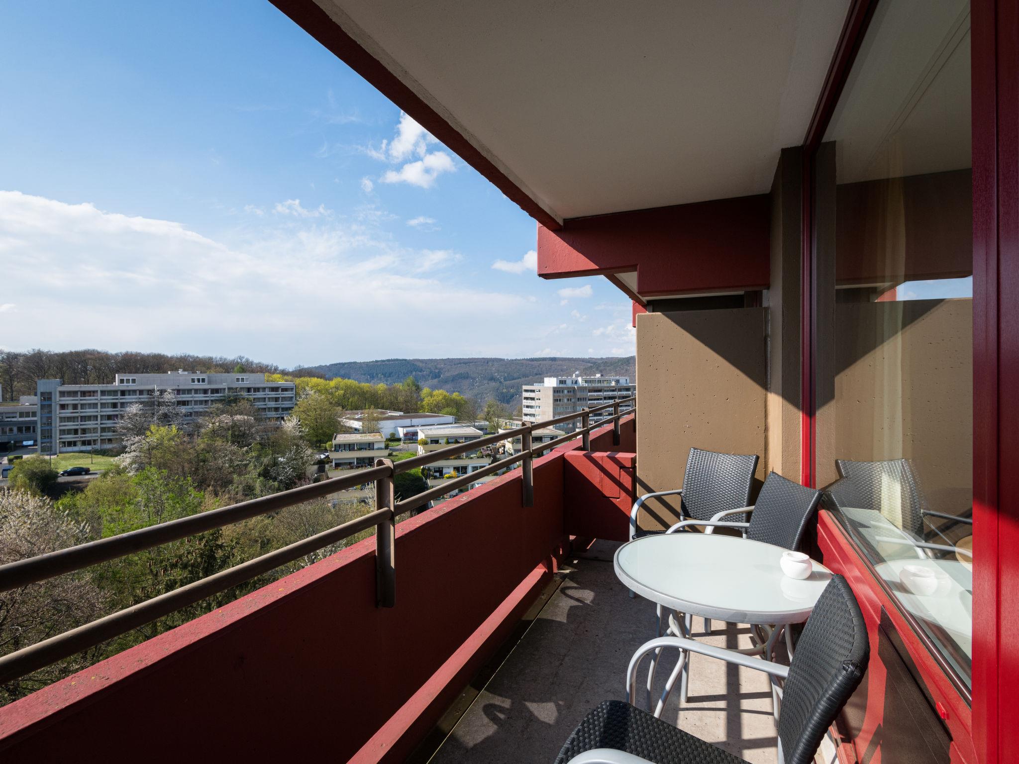 Lahnstein 12 km from Koblenz: Apartment block "Ferienpark Rhein-Lahn". In the district of Lahnstein auf der Höhe 4 km from the centre of Lahnstein, 12 km from the centre of Koblenz, 4 km from the river. For shared use: indoor pool (11 x 6 m, depth 120 cm) with internal staircase. Shower/WC in the pool area. In the complex: reception, WiFi, table tennis, lift, central heating system, washing machine, tumble dryer (for shared use, extra). Parking at the house. E-charging station. Grocery 200 m, supermarket 4.5 km, restaurant 800 m, bakery 4.5 km, bicycle rental 4.5 km, 45 minute walk to the centre, bus stop "Kurklinik" 200 m, railway station "Koblenz (HBF)" 12 km, park "Kurpark" 200 m, outdoor swimming pool 1.5 km, indoor swimming pool 5 km, thermal baths "Emser Therme" 10 km. Golf course (18 hole) 16 km, tennis 500 m, minigolf 6 km, walking paths from the house 100 m, cycle lane 4.5 km, children's playground 100 m. Nearby attractions: Burg Lahneck 3 km, Marksburg 7 km, Deutsches Eck Koblenz / Seilbahn 10 km, Schloss Stolzenfels 13 km. Hiking paths: Lahn-Höhenweg 100 m, Rheinsteig (11) 100 m, Jakobswege Rhein-Lahn. Please note: car recommended. Lahn River 4 km. Boat trips (KD) on the Rhine 4.5 km. Moselle River 10 km. A small kiosk with a small animal enclosure is 300 m away. The Rhein-Lahn holiday park is located 200 m above the town of Lahnstein, in the heart of the 530 km² Nassau Nature Park. It consists of two interconnected apartment buildings and its own Interhome service office. Smoking is permitted on the balconies of the apartments. An 11 kW electric charging station is located in the parking lot. Usage and billing are handled through the Interhome service office.