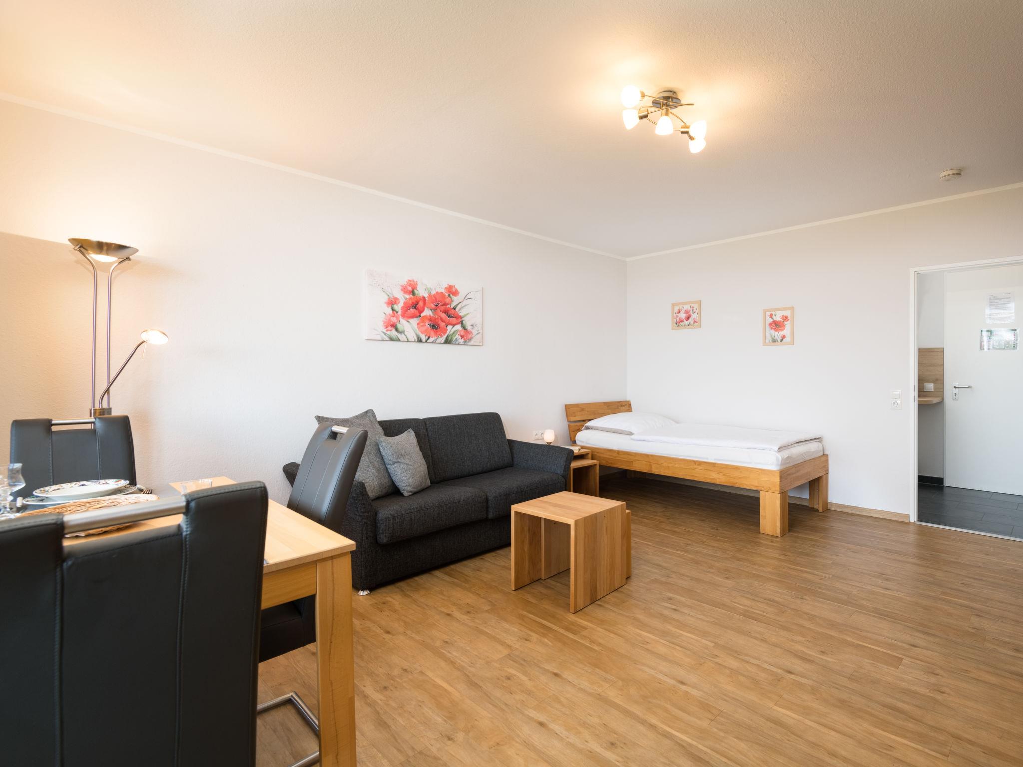 "Butterblume (B808)", 1-room apartment 33 m2 on 8th floor, west facing position. Living/sleeping room with 1 bed (100 cm, length 200 cm), satellite TV (flat screen). Exit to the balcony. Kitchenette in the entrance (2 ceramic glass hob hotplates, toaster, kettle, microwave, electric coffee machine). Shower/WC. Balcony furniture. Beautiful view of the countryside. Facilities: Internet (WiFi, free). Please note: non-smokers only. Smoke alarm.