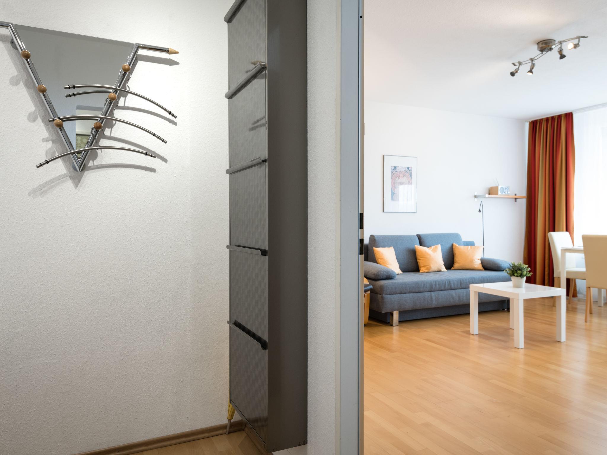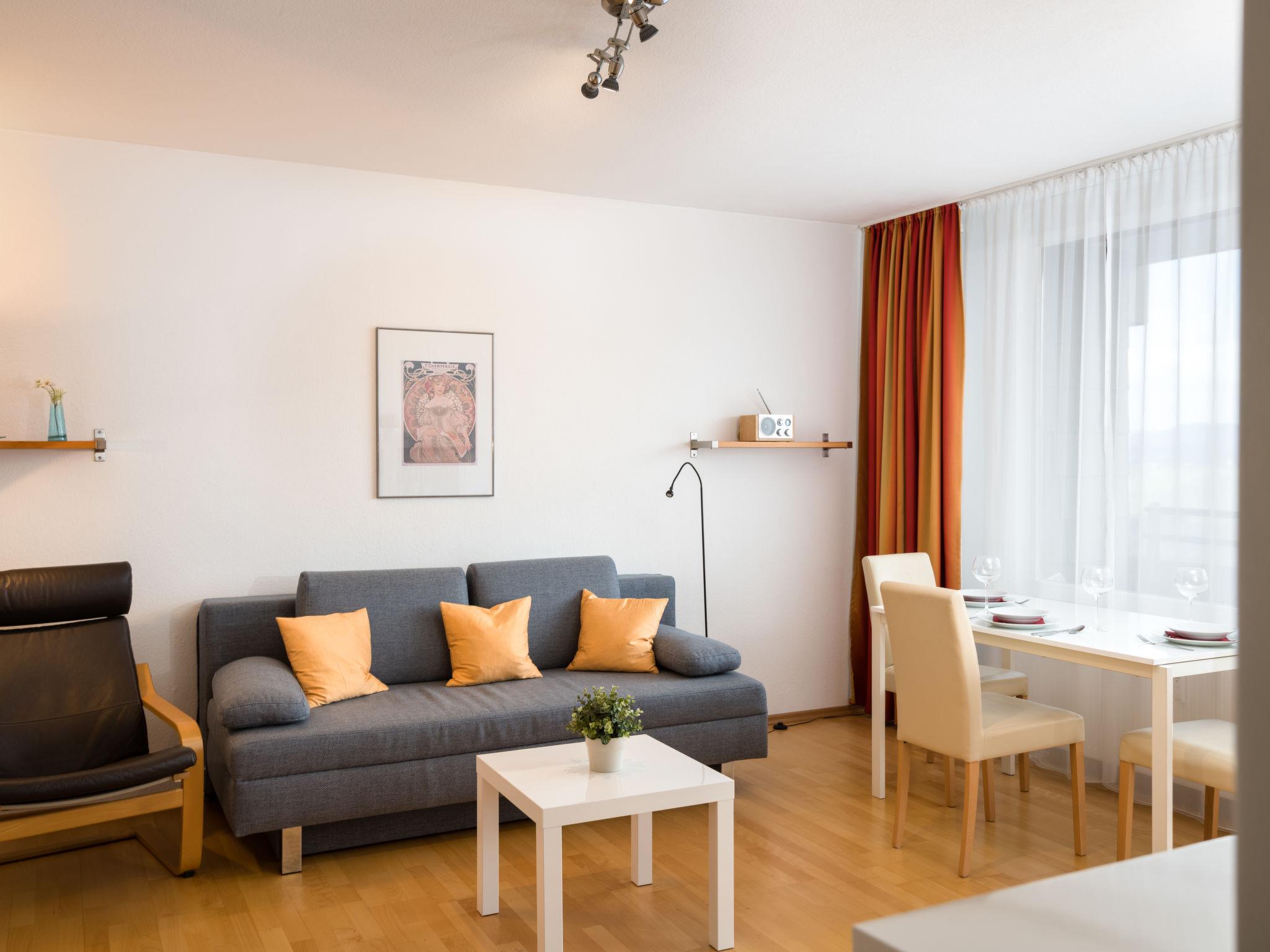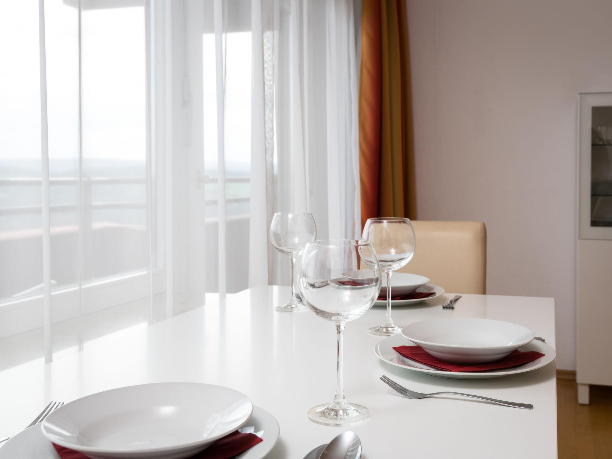 "Panoramablick (A1001)", 2-room apartment 56 m2 on 10th floor, east facing position. Living/dining room with 1 double sofabed (145 cm, length 195 cm), satellite TV (flat screen), radio. Exit to the balcony. 1 room with 1 double bed (2 x 100 cm, length 200 cm). Kitchenette (oven, dishwasher, 4 ceramic glass hob hotplates, toaster, kettle, electric coffee machine). Bath/shower/WC. Balcony furniture. Very beautiful view of the countryside. Facilities: washing machine. Internet (WiFi, free). Please note: non-smokers only. Smoke alarm.
