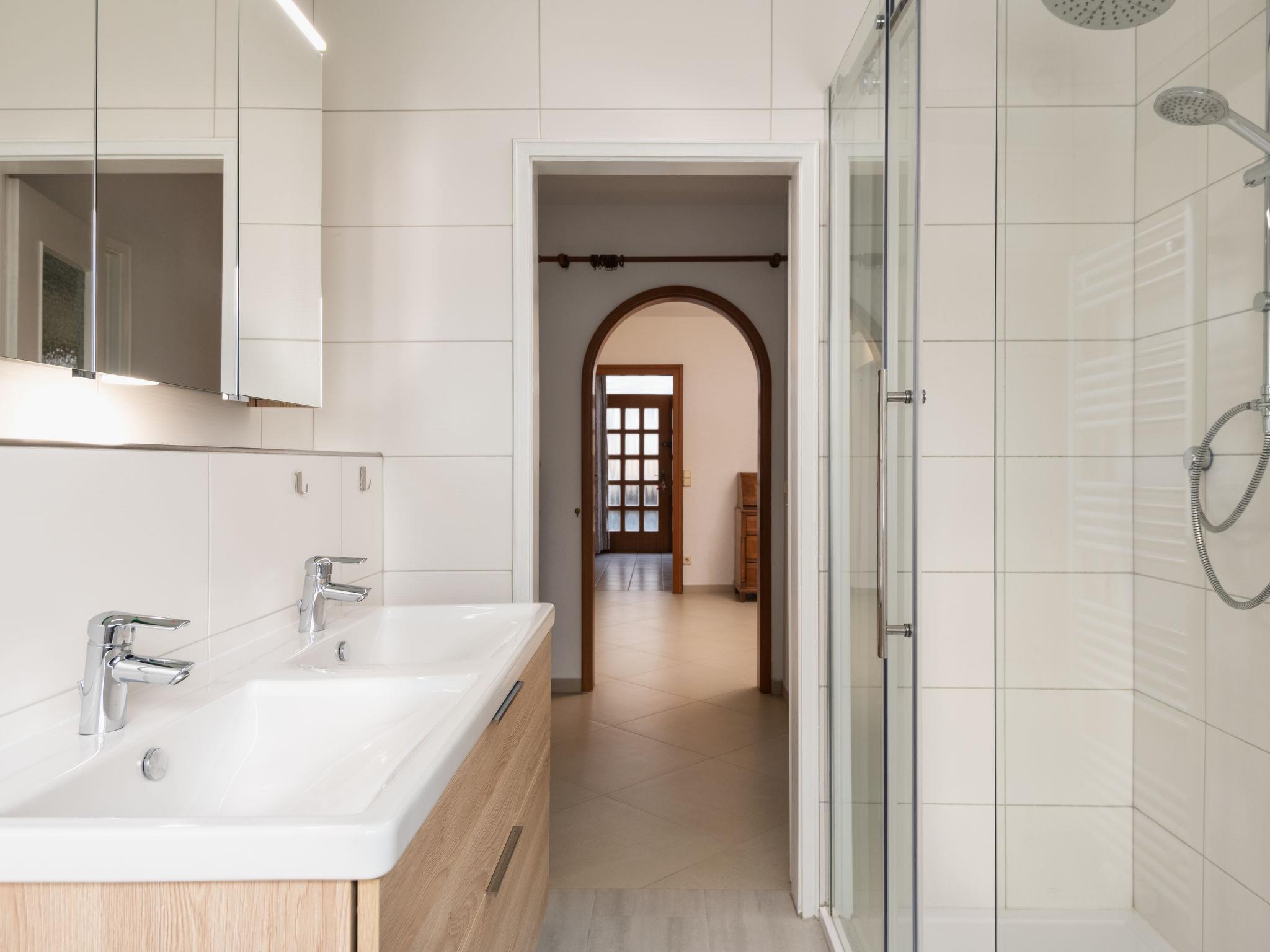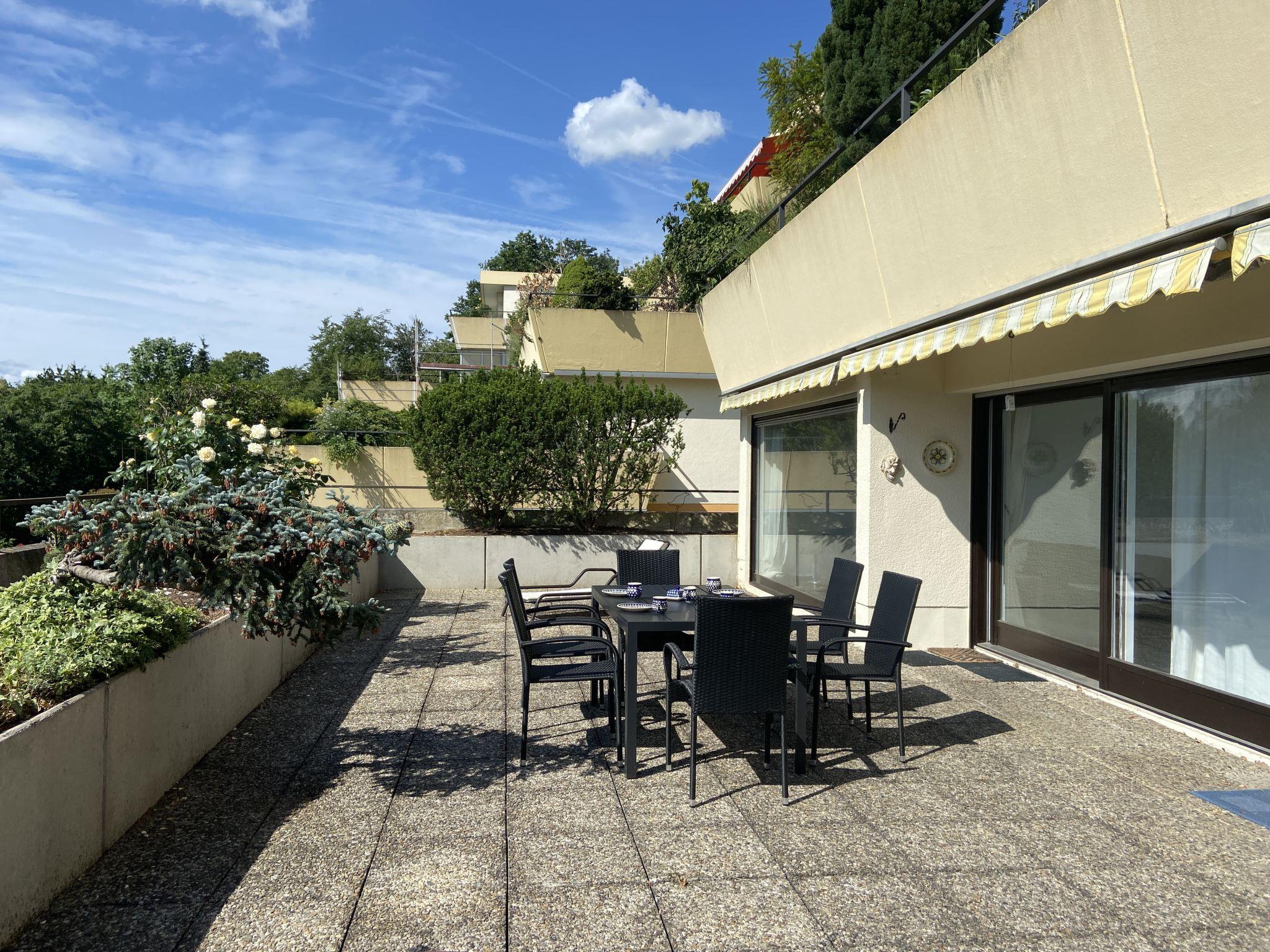 "Terrassenwohnung am Kurpark", 5-room apartment 134 m2. Spacious and bright, comfortable and beautiful furnishings: open large living/dining room with panoramic window with TV (flat screen), hi-fi system. Exit to the terrace. 1 room with 1 double sofabed (140 cm, length 200 cm), 1 double bed (2 x 100 cm, length 200 cm). Exit to the terrace. 1 room with 1 double bed (2 x 100 cm, length 200 cm). Small office with 1 fold-away bed (90 cm, length 180 cm). Kitchen-/living room (oven, dishwasher, 4 induction hot plates, toaster, kettle, microwave, freezer, electric coffee machine). Shower/WC, sep. WC. Large terrace 20 m2. Terrace furniture, box-room. Beautiful view of the countryside. Facilities: washing machine, dryer, iron. Internet (WiFi, free). Please note: non-smokers only. Private entrance, smoke alarm. Bookings accepted for holiday purposes only.