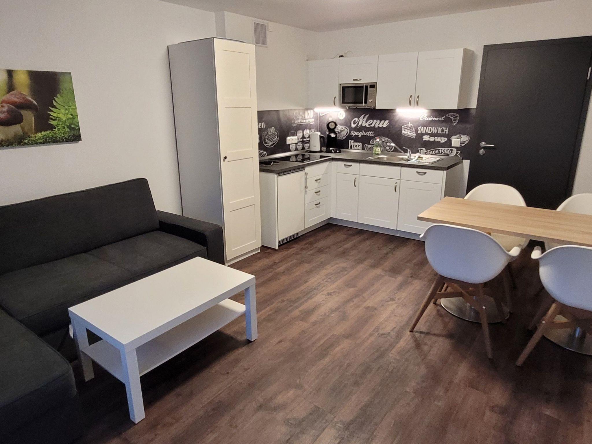 The 2-room flats are furnished with a cosy sofa with a sofa bed and a coffee table. The sofa is extendable and can be used as an additional sleeping area with a sleeping area of 140x200. The large dining table for 4 people is located opposite the corner kitchen and invites you to feast together. The bedroom has a large double bed (180x200) without a "visitor's crack". The shower room is directly accessible from the bedroom.