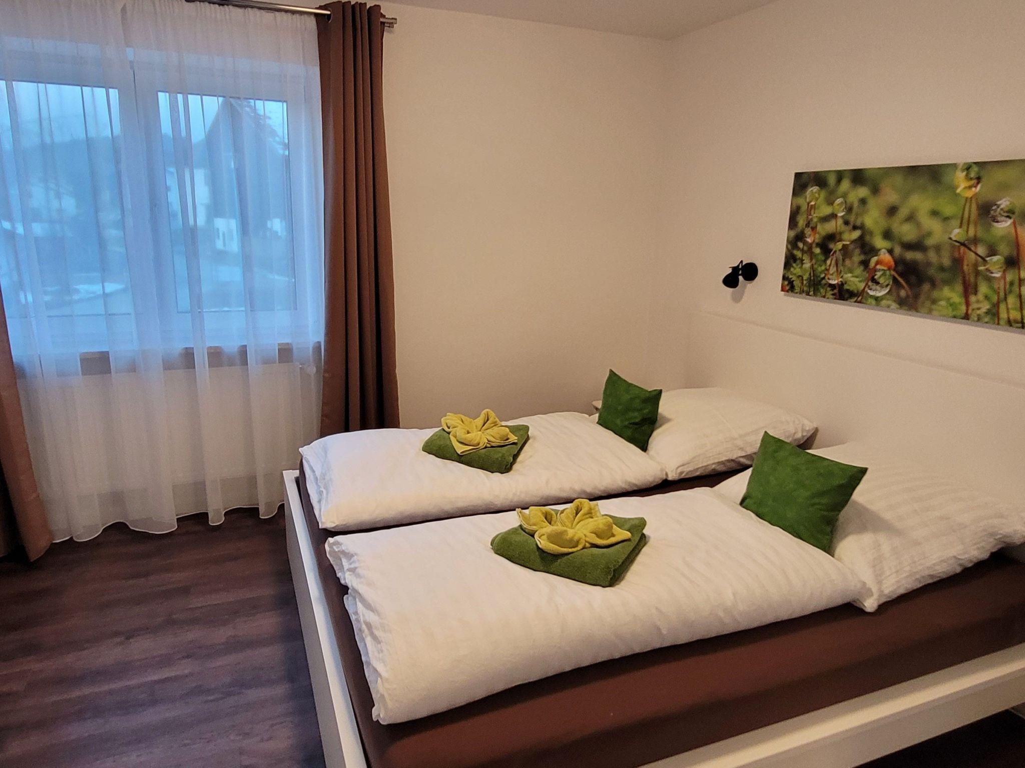 The 2-room family flat is furnished with a cosy sofa with récamiere and a coffee table. The sofa is extendable and can be used as an additional sleeping area with a sleeping area of 140x200. The large dining table for 4-5 people is located opposite the corner kitchen and invites you to feast together. In the bedroom there is a large double bed (180x200) without a "visitor's crack" and a queen-size bed (140x200), so that 4 people can sleep comfortably in the bedroom. The spacious shower room is directly accessible from both the bedroom and the living room.