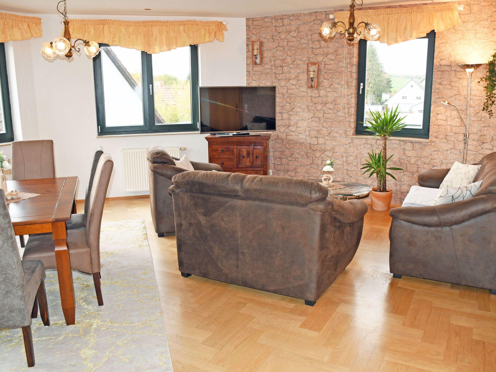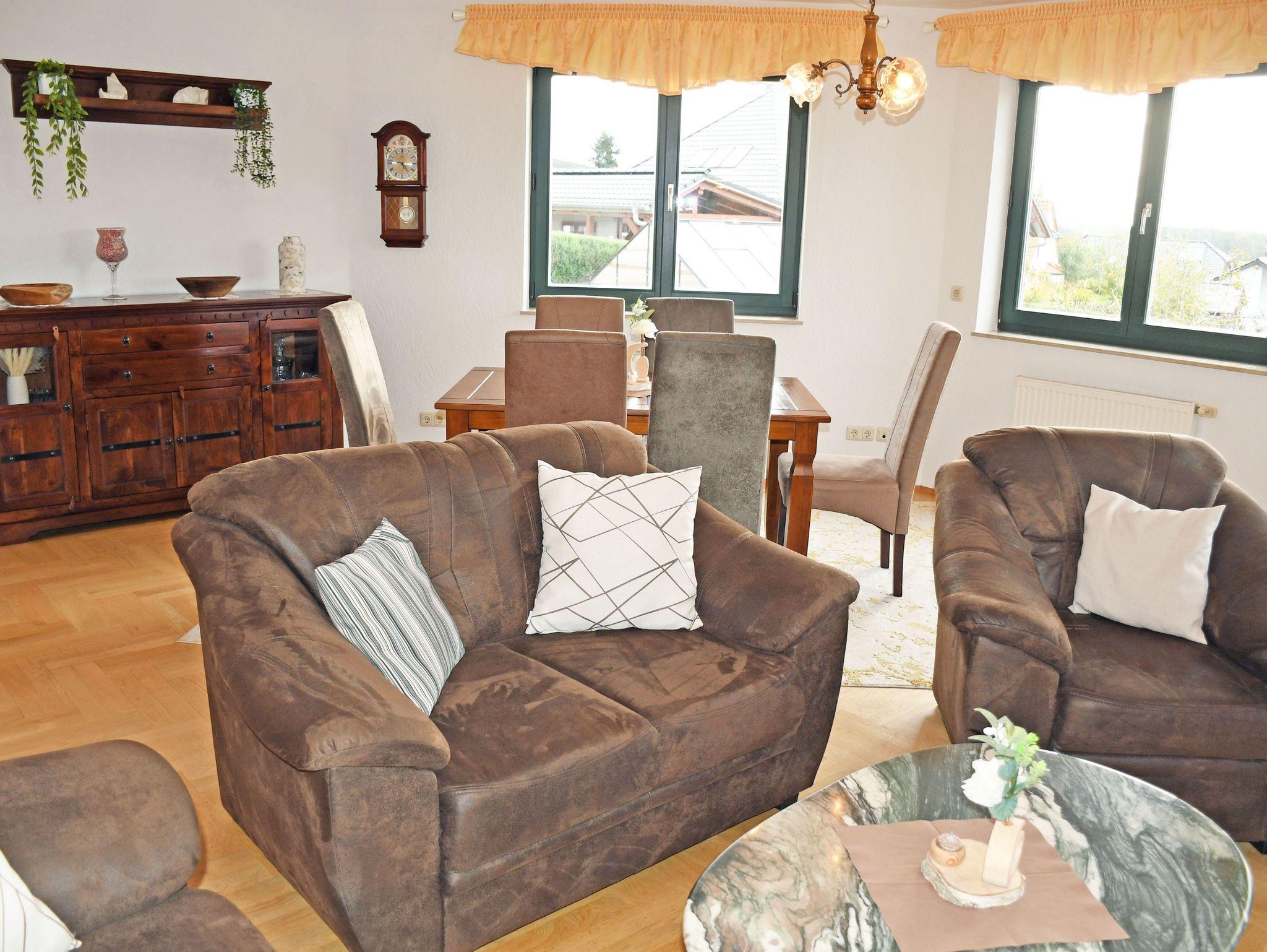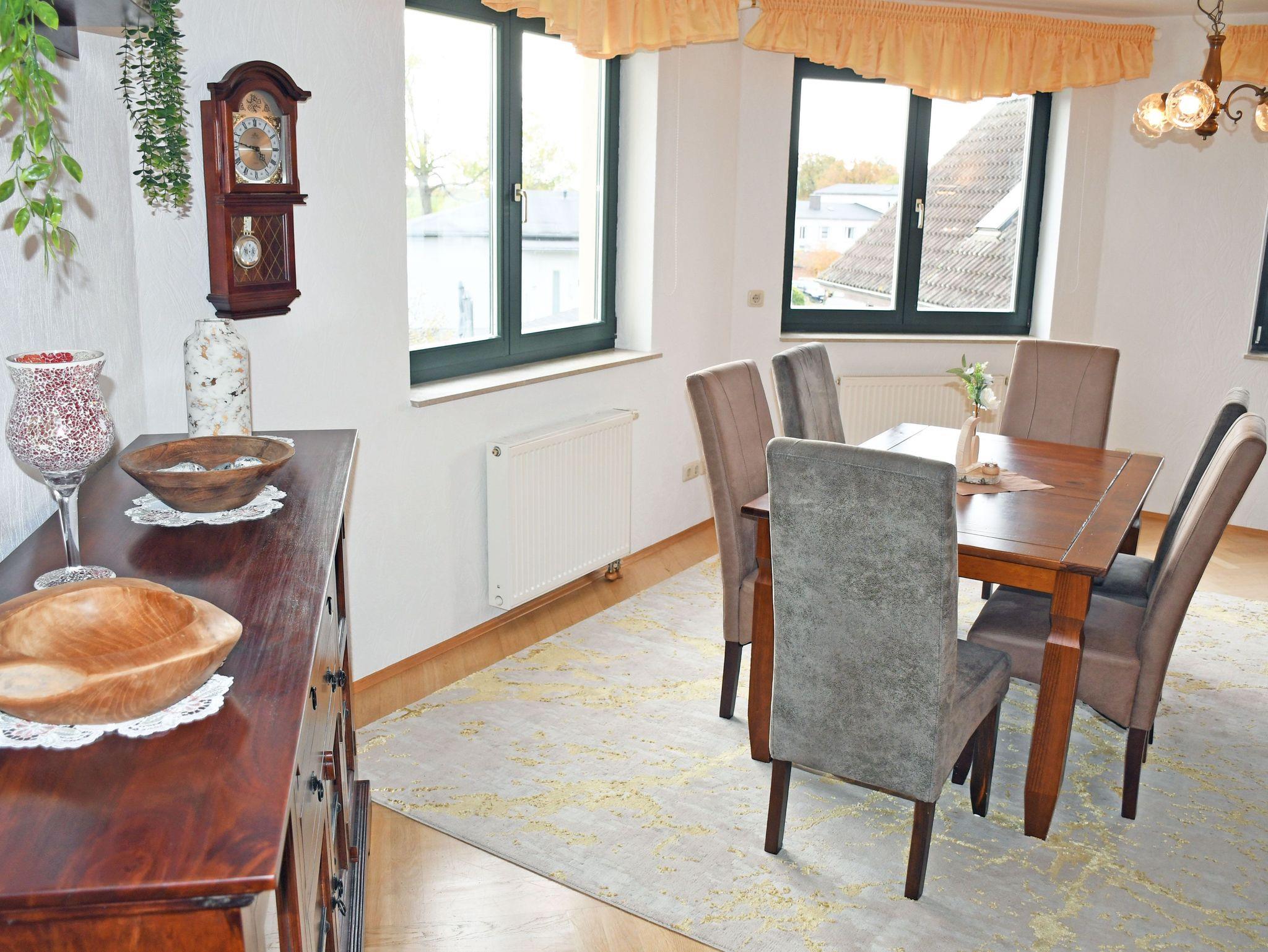 Das neu erbaute Ferienhaus ist ca. 186 qm groß, hat Platz für maximal 10 Gäste und wurde sehr liebevoll und modern eingerichtet. Über einen separaten Eingang gelangt man in das Erdgeschoss mit dem großzügigen Wohnzimmer. Diese verfügt über Sitzelemente (2-Sitzer, 3-Sitzer und Sessel), zwei Esstische mit Stühlen, ein modernen Flachbild-TV und Ablageschränke. Weiterhin befindet sich im Wohnbereich eine Küchenzeile die mit Backofen, Herd, Wasserkocher, Kaffeemaschine, Toaster, Geschirrspüler, Abzugshaube, Mikrowelle und Kühlschrank komplett ausgestattet.